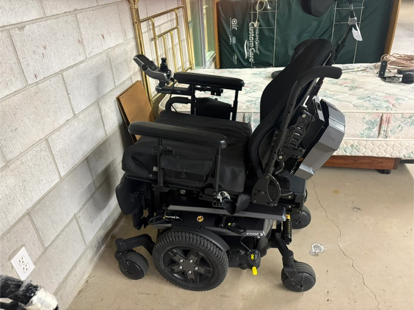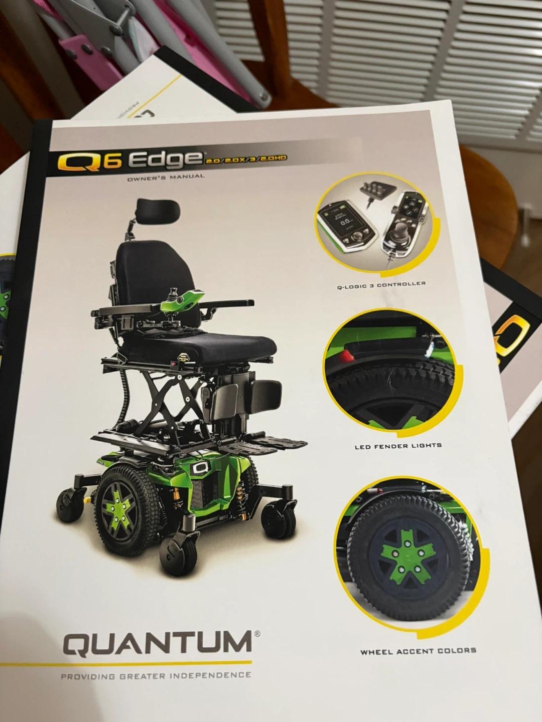 Quantum Q6 Edge power wheelchair with Q-Logic 3 controller and LED fender lights. It has accent colors on the wheels. This model provides greater independence. Many features added in the last for months. The chair raises to a standup height for group conversation or to reach up high. Head rest and seating air cushion comes with it. The chair reclines and foot rest stretch out for easy resting. Included is the battery charger and manuals.