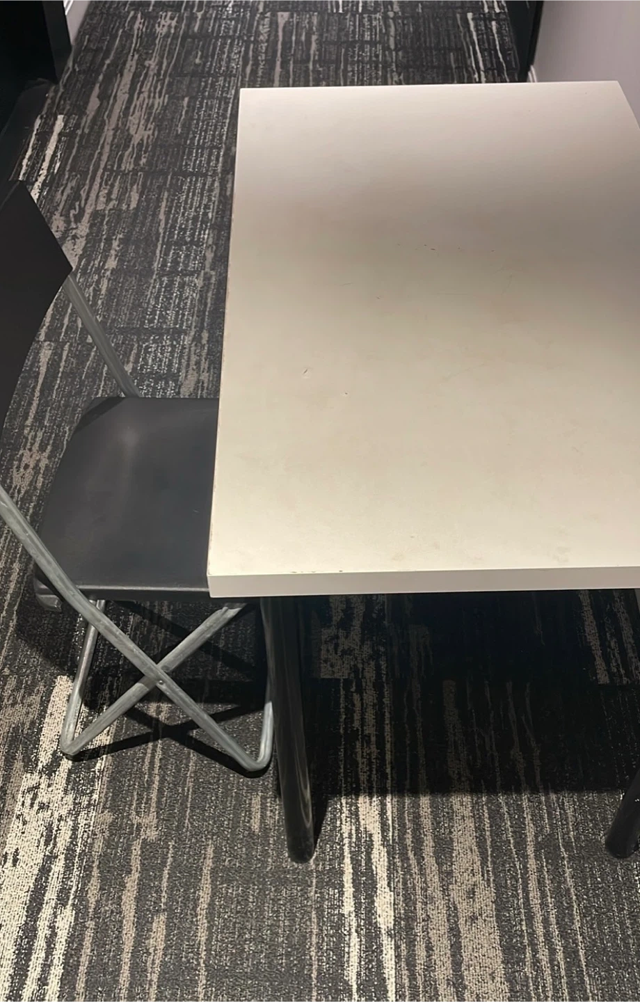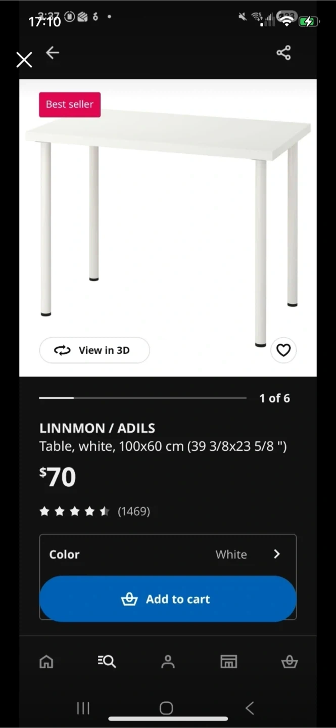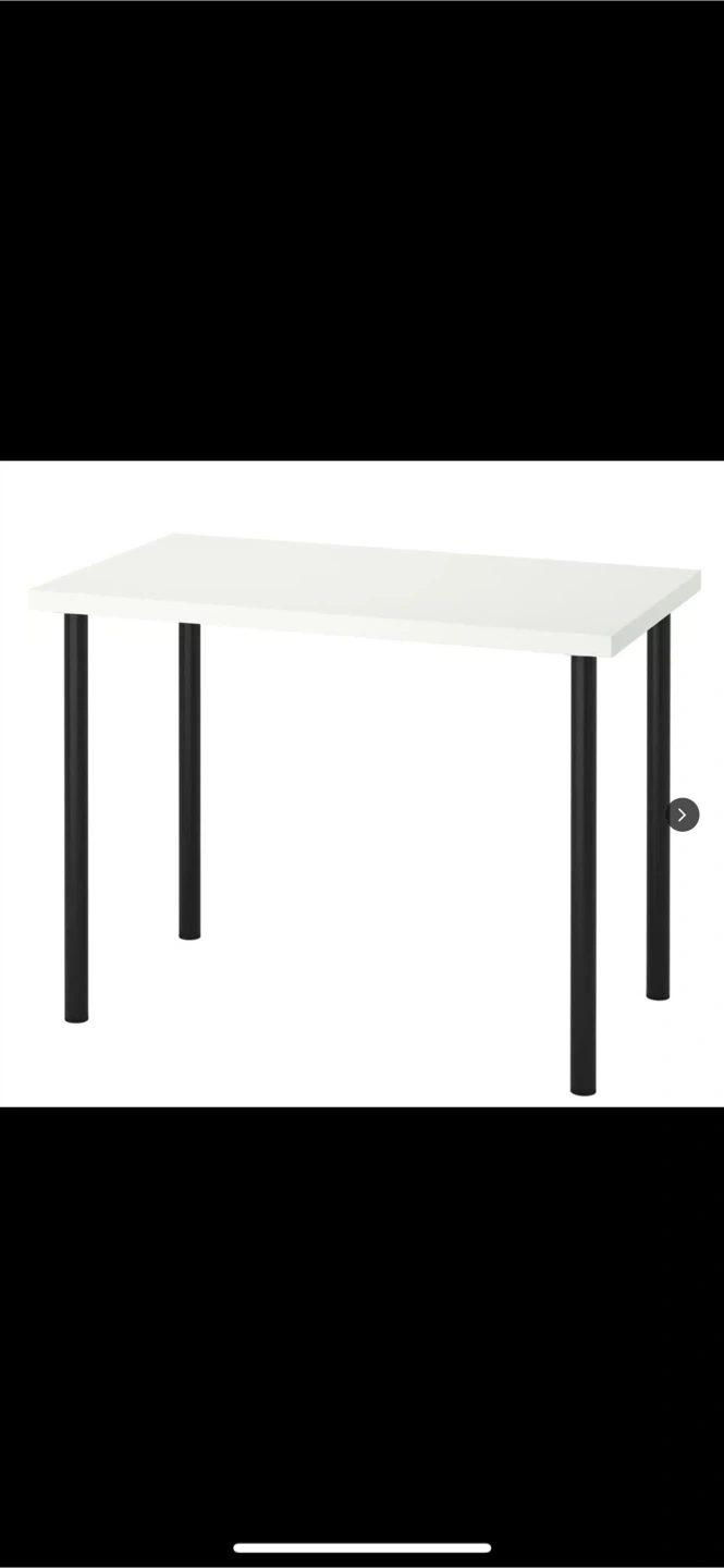 This is an IKEA LINNMON table with ADILS legs. It's white with black legs and measures 100x60 cm. It's a good size for a small workspace or as a side table.