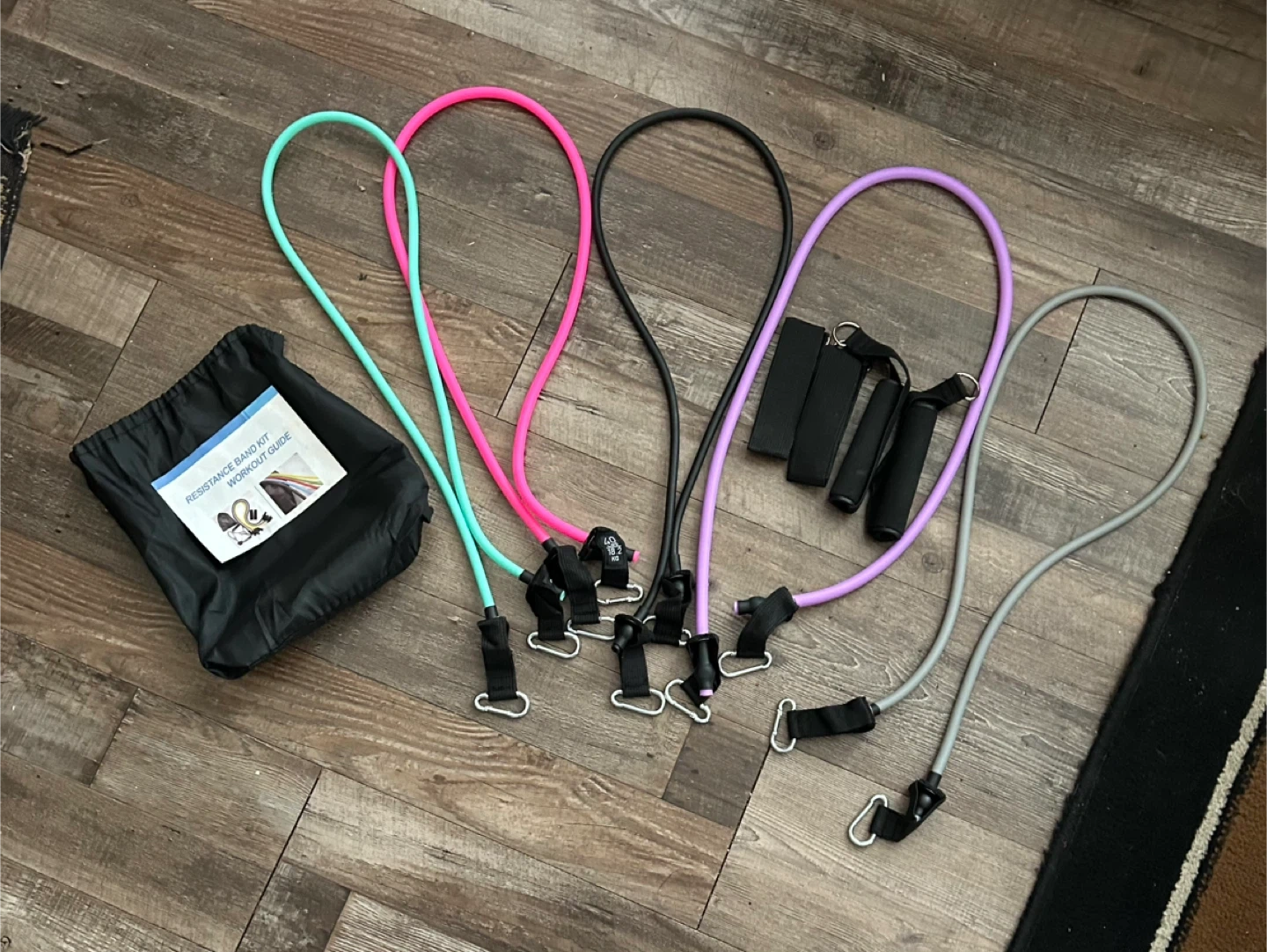 This resistance band set includes multiple bands in different colours for varying resistance levels. It also comes with two handles, ankle straps, and a carrying bag. A workout guide is included to help you get started. Have never used