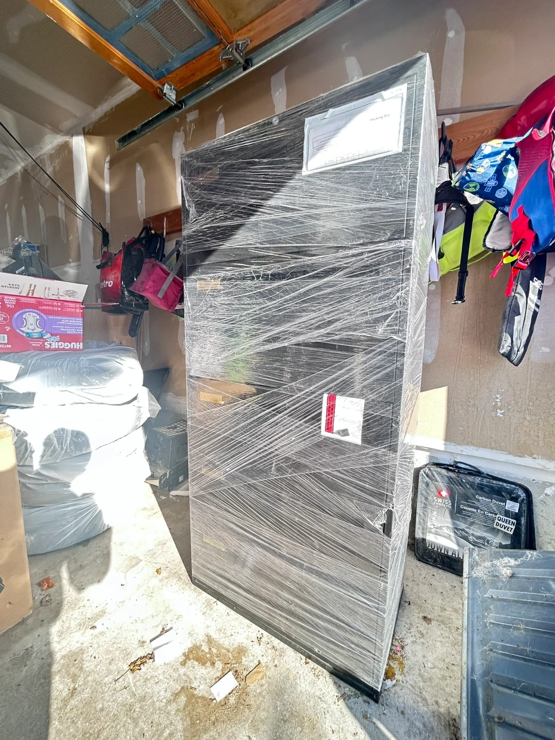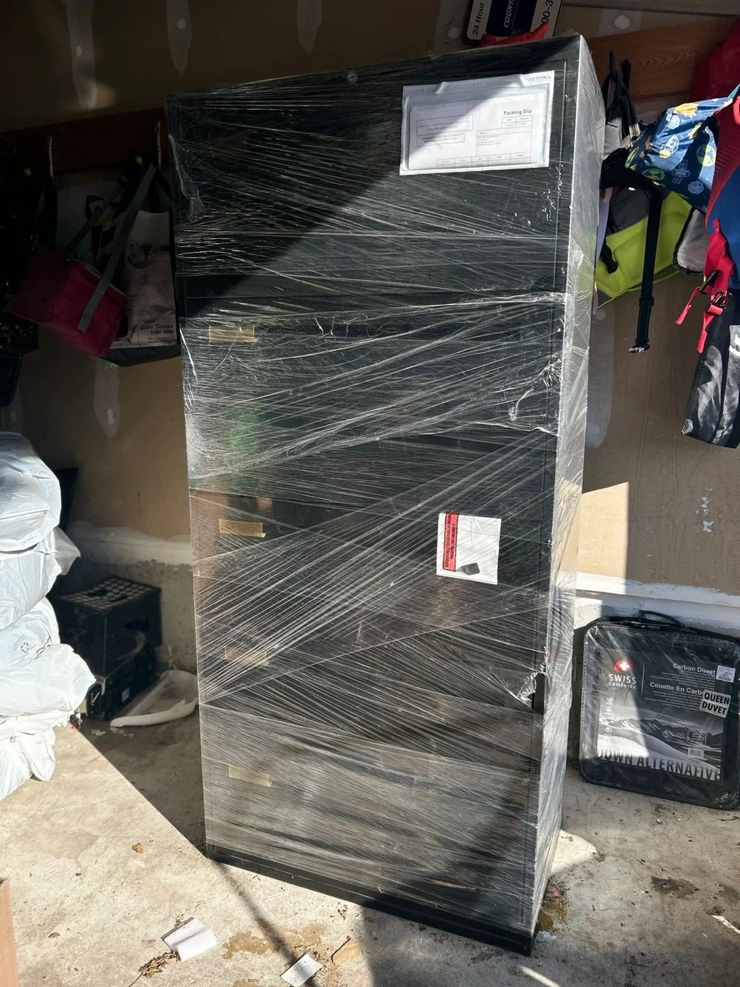 This is a black metal filing cabinet with four drawers. Never opened and never used. It's a standard size for office storage.