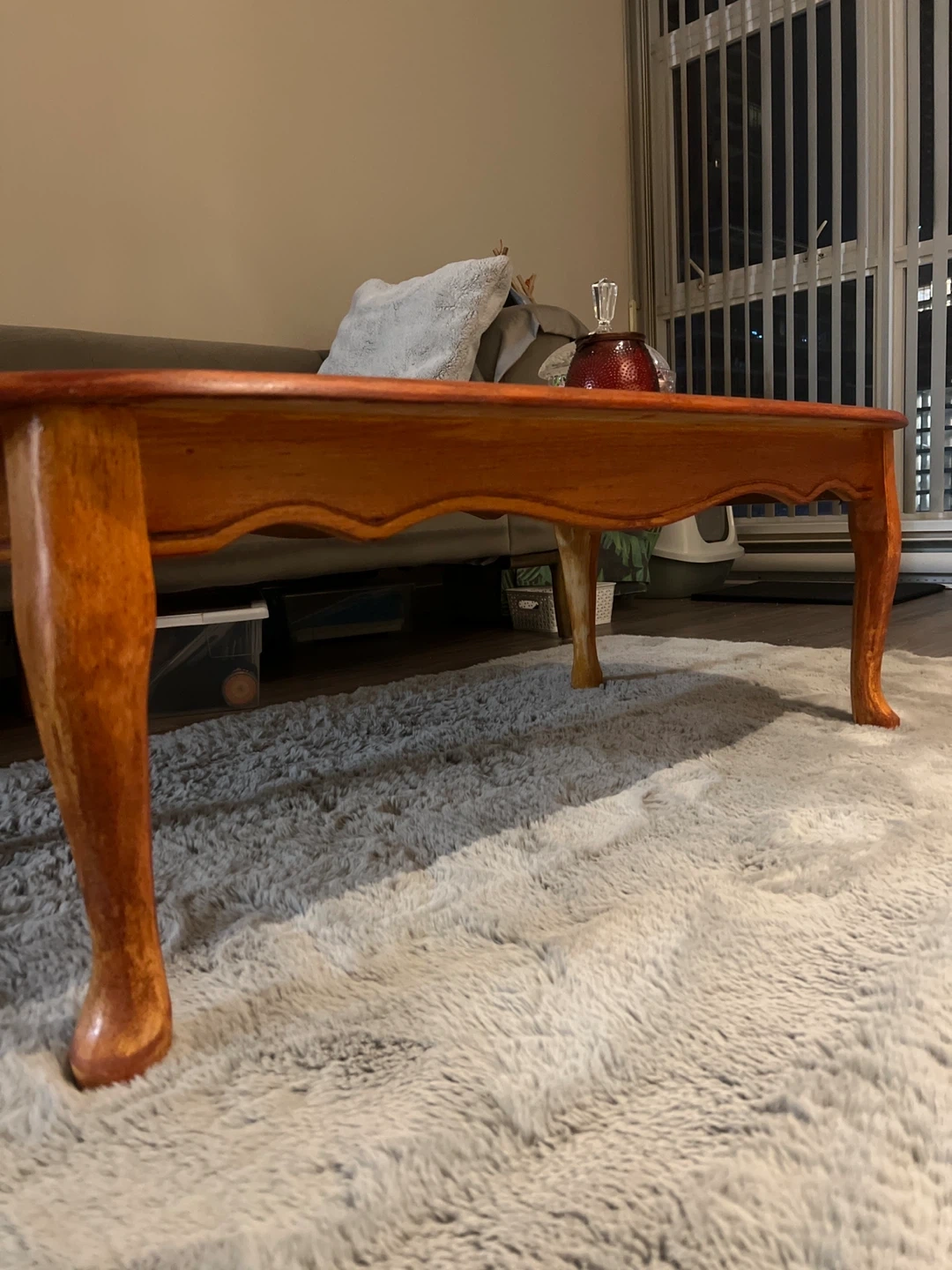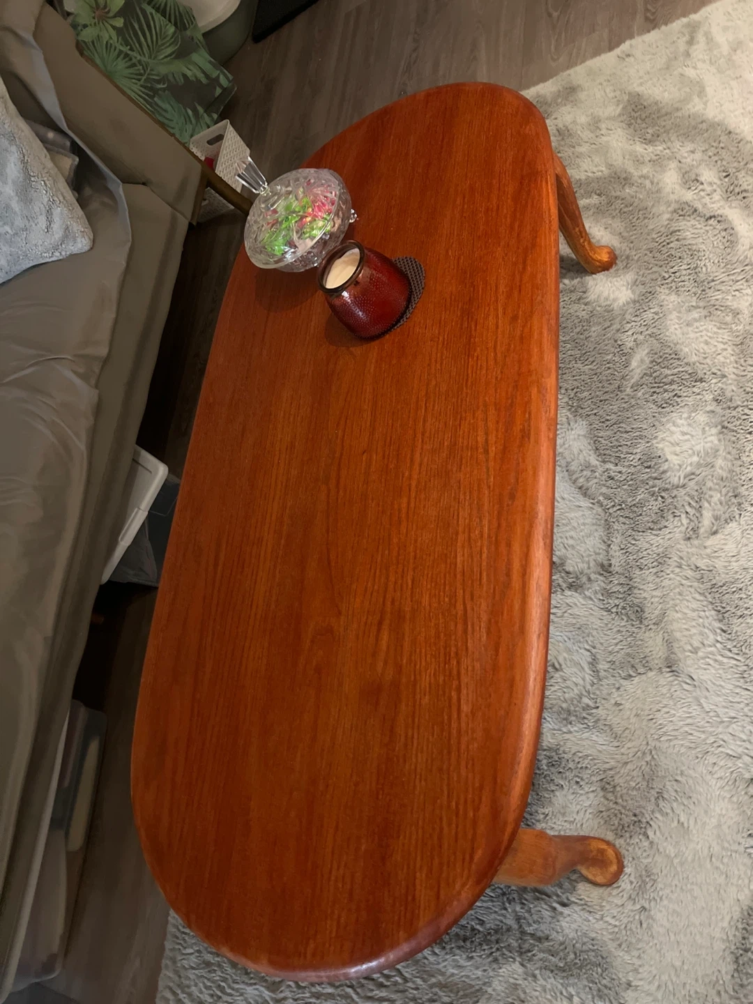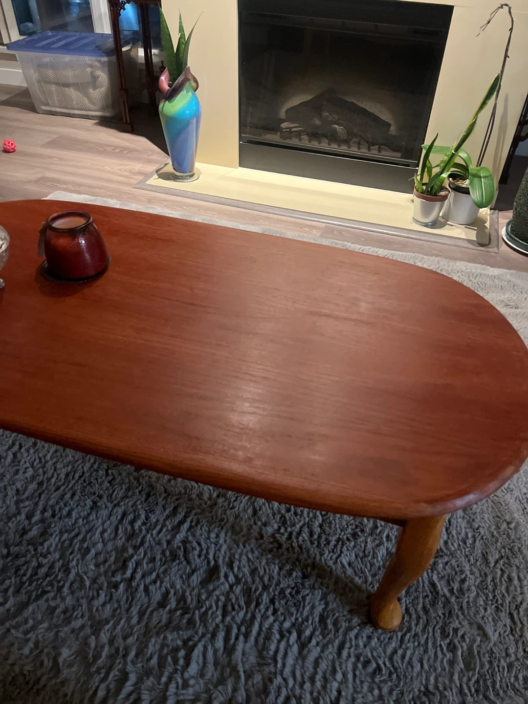 A classic wooden coffee table with an oval top and four carved legs. It's suitable for a living room or den. Its warm wood tone complements many decor styles.