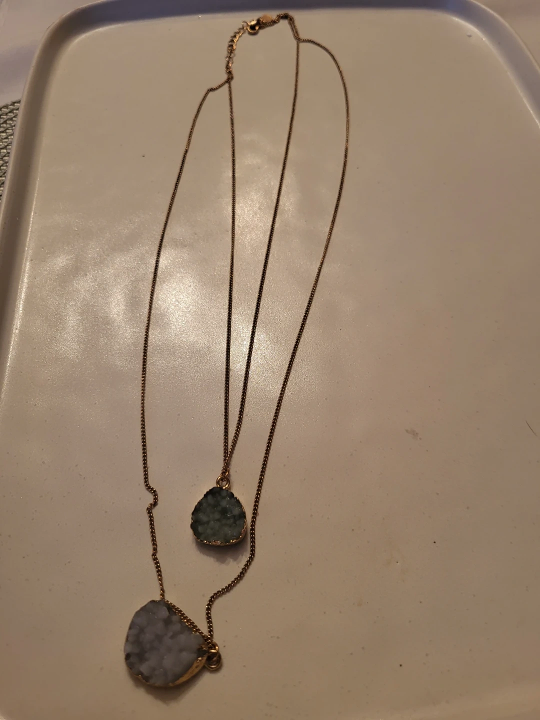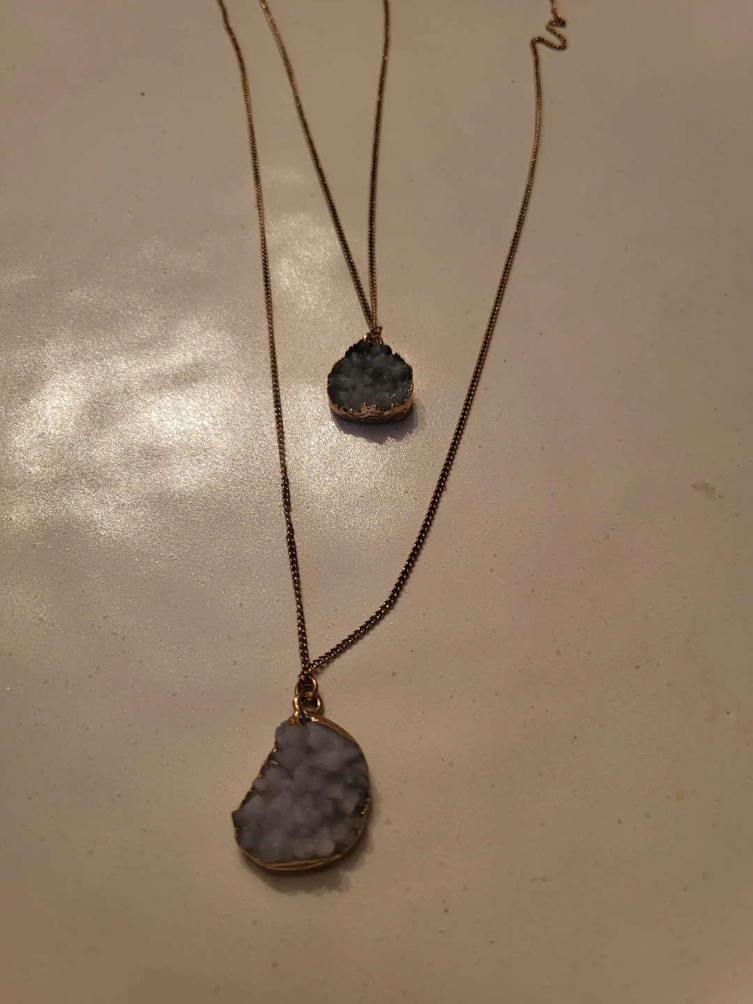 This set features a double layered necklace with druzy pendants. One pendant is greyish-white and the other is a light green. The chains and pendant settings are gold-toned.