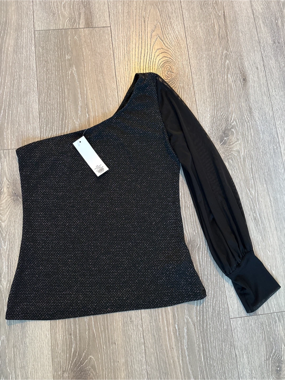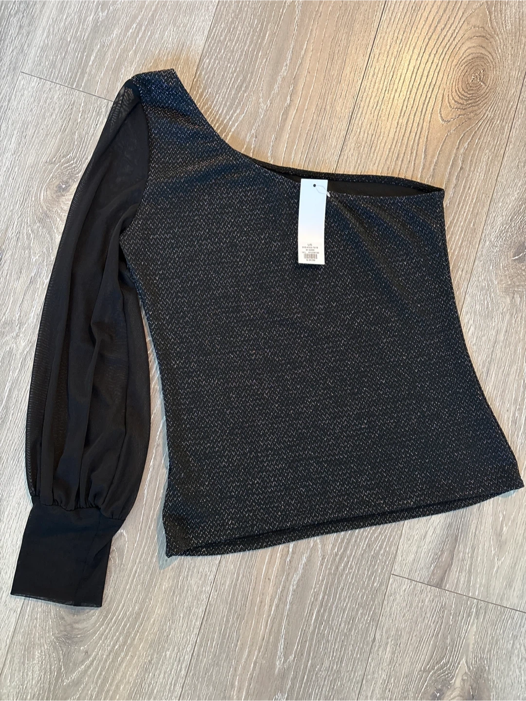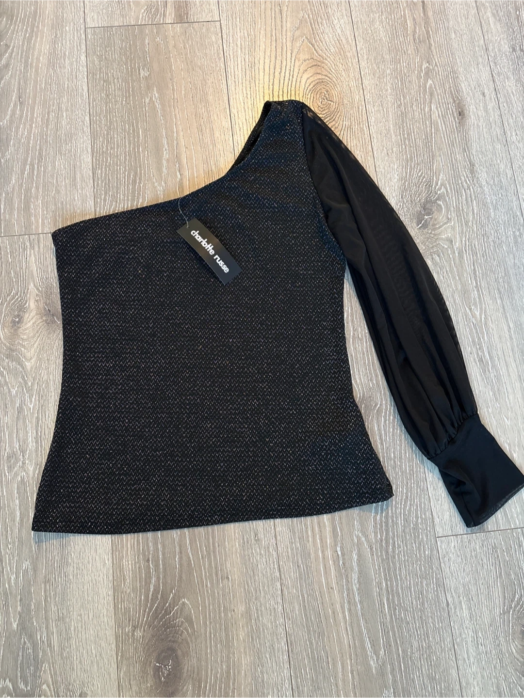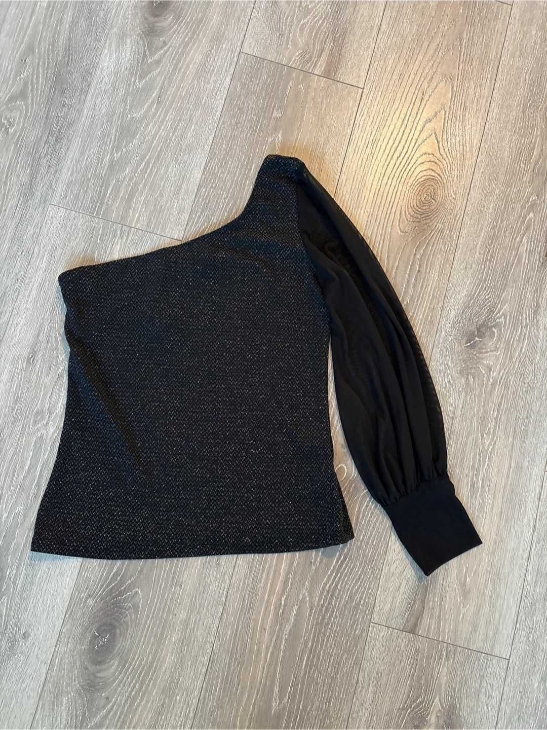 Sparkly one-shoulder top from Charlotte Russe. It's black with a glittery pattern and features a sheer balloon sleeve. Size L.