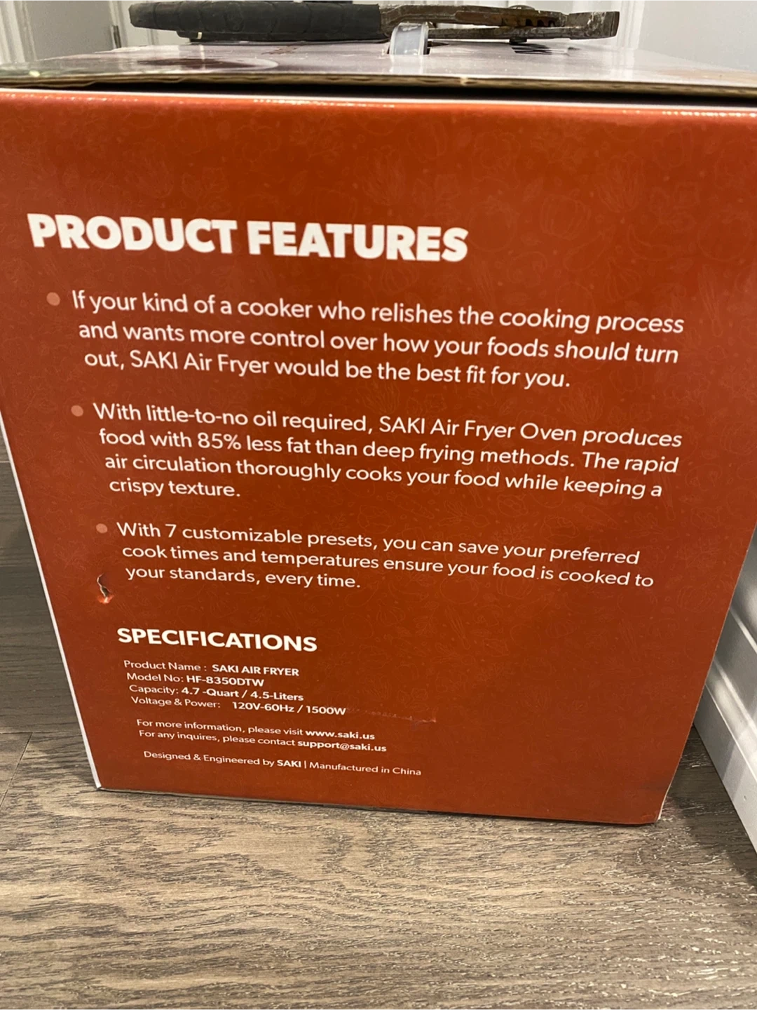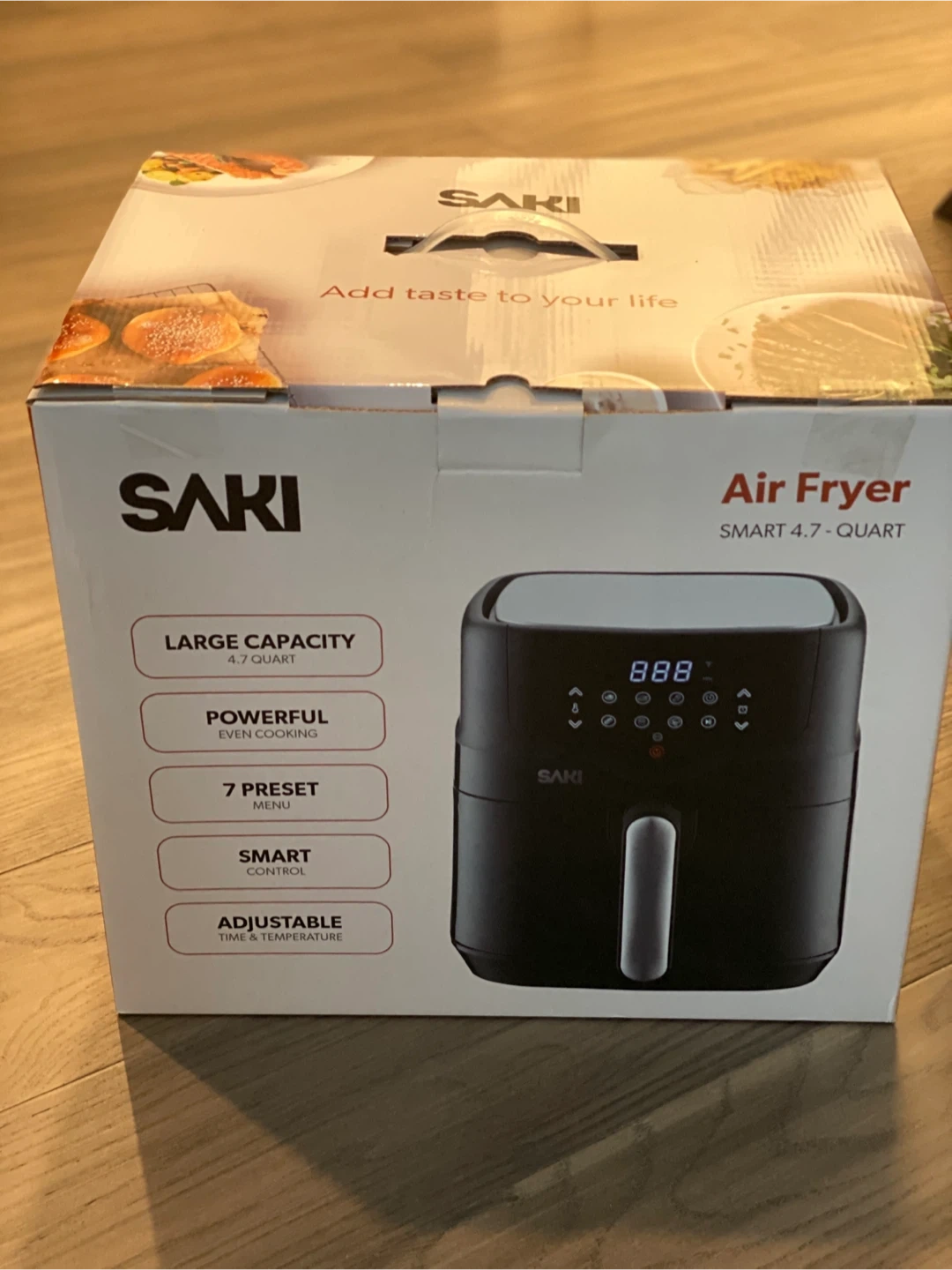 BNIB - This Saki Air Fryer Oven has a large 4.7-quart capacity. It offers 7 customizable presets for easy cooking. The air fryer uses little-to-no oil, producing food with 85% less fat.