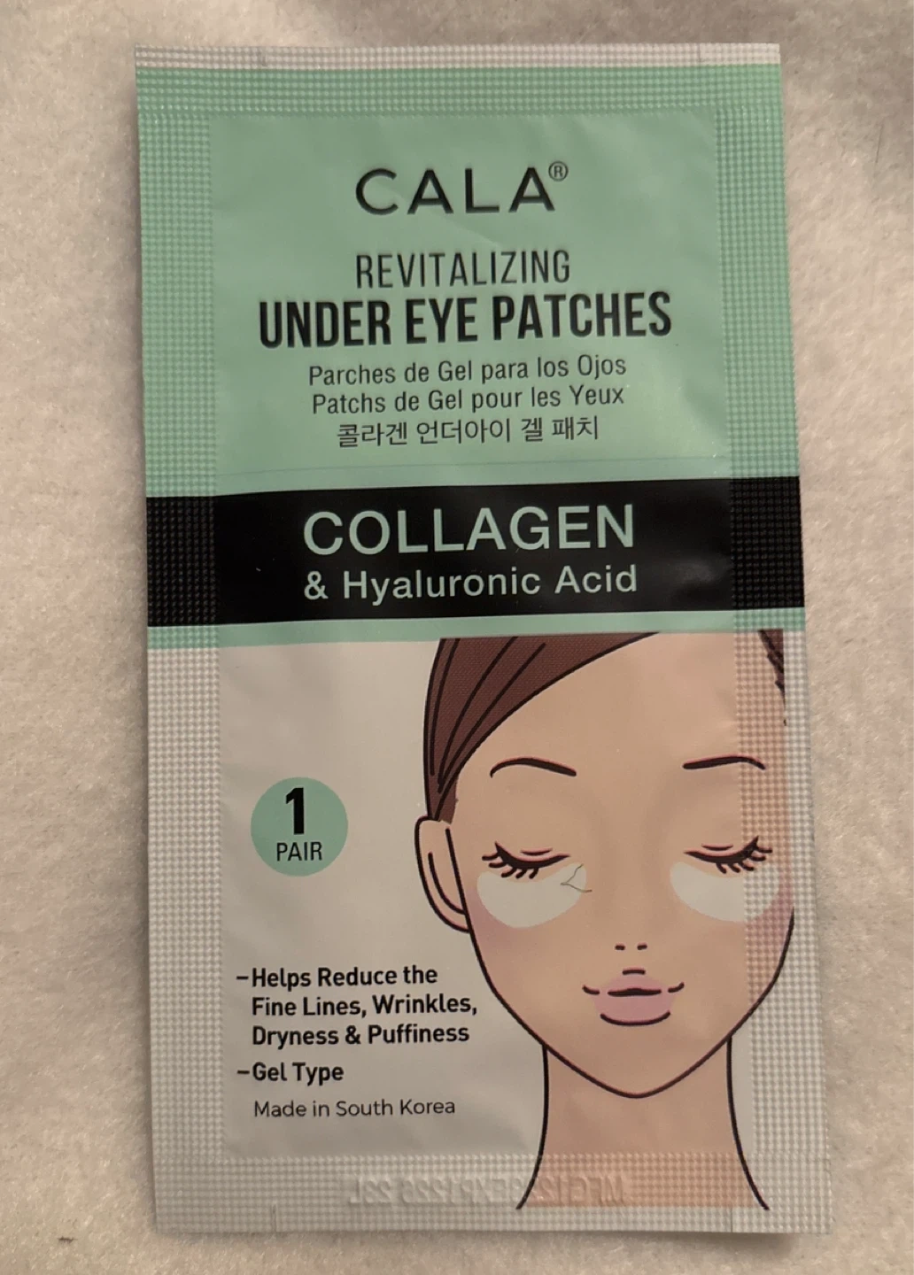 1 Cala Revitalizing Under Eye Patchwith Collagen & Hyaluronic Acid. These gel patches help reduce fine lines, wrinkles, dryness, and puffiness. Made in South Korea.