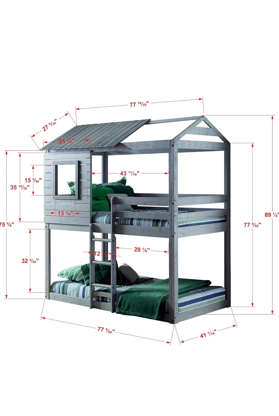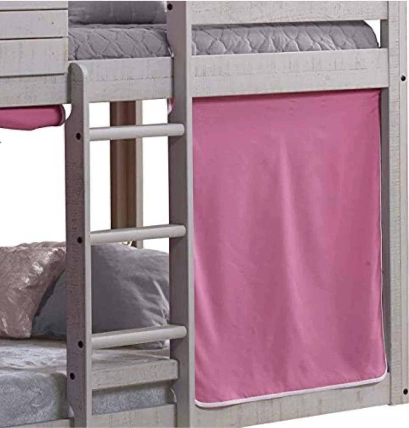 This twin over twin bunk bed has a fun house design with pink tent curtains. It's made of wood and includes a ladder for access to the top bunk. The beds measure 77 15/16" L x 41 1/16" W overall. This bed is great for kids who love imaginative play!