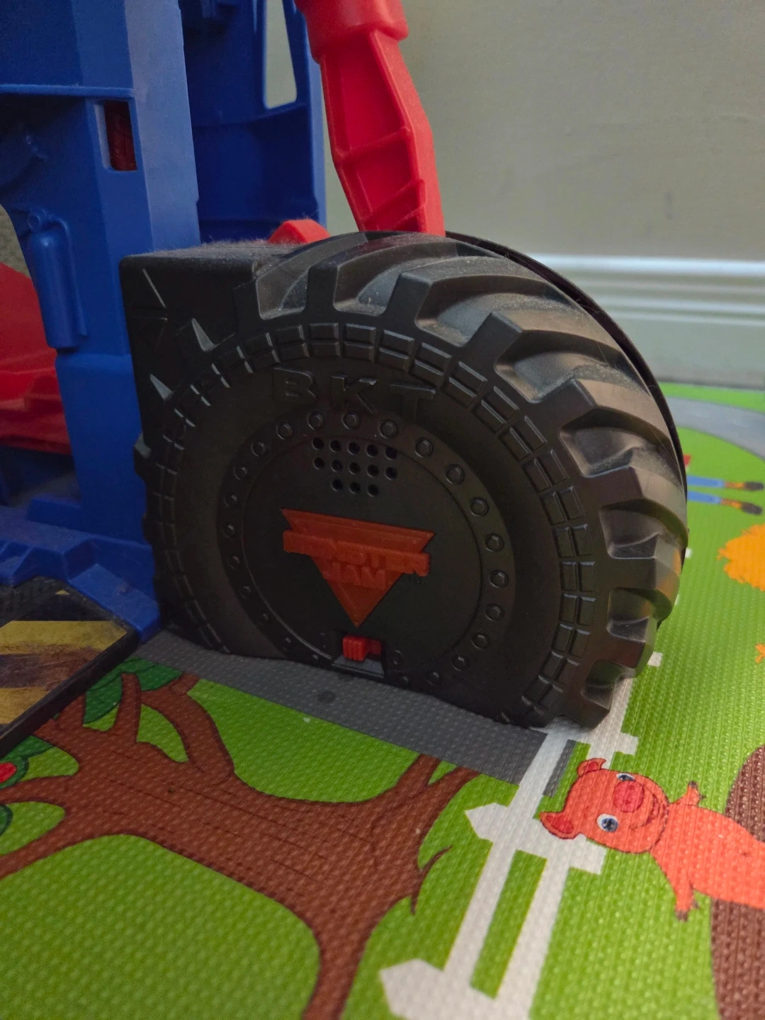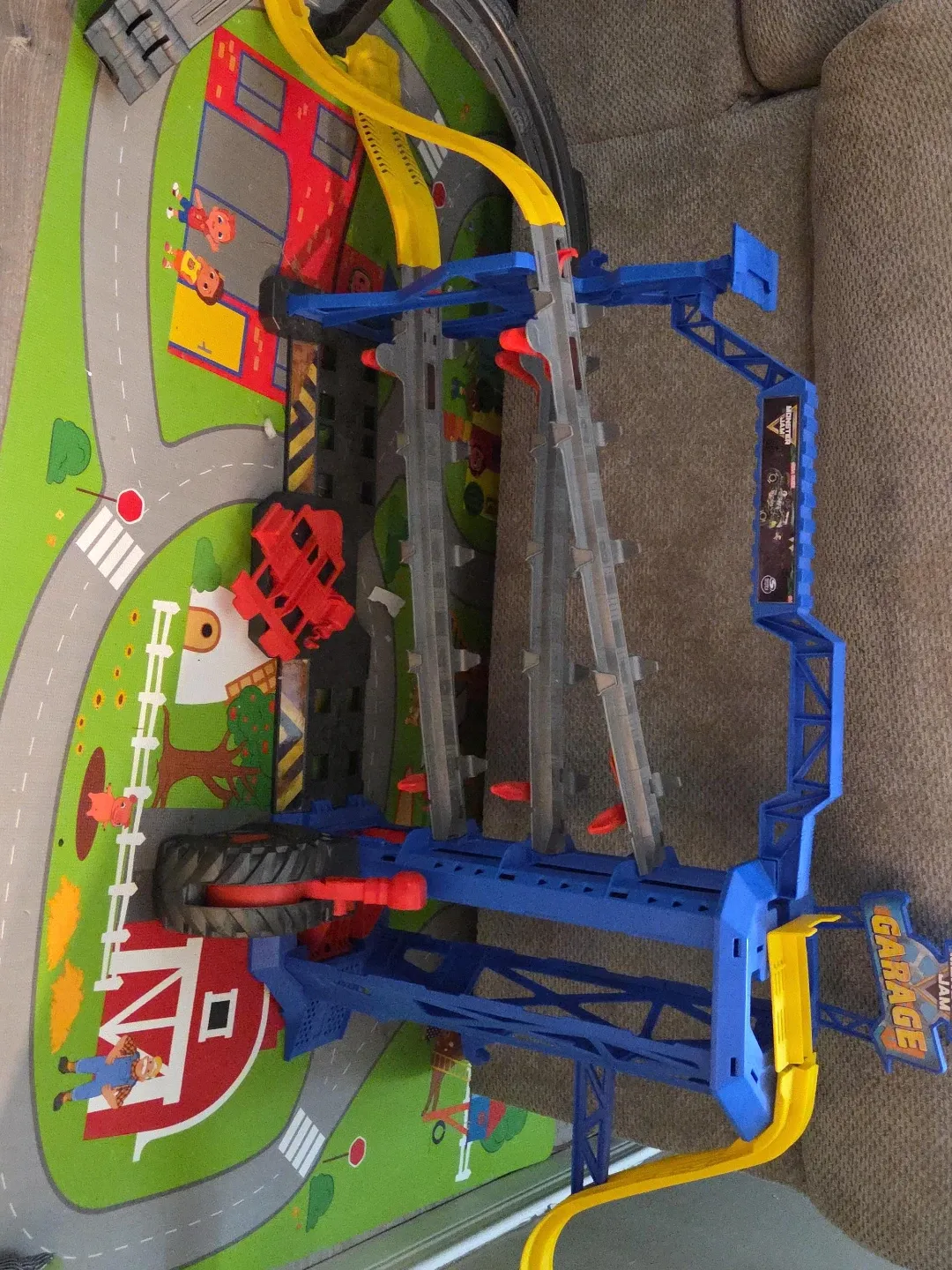 This is a Monster Jam Garage playset. It includes a garage structure with ramps and a large monster truck tire. It's made of blue and yellow plastic.