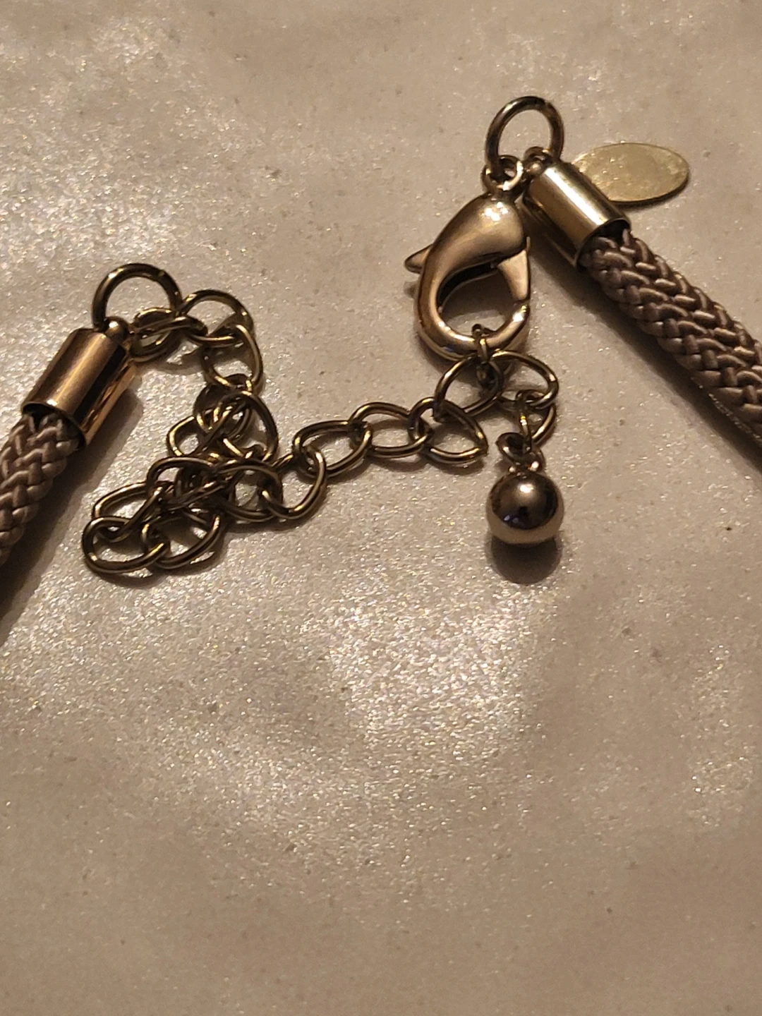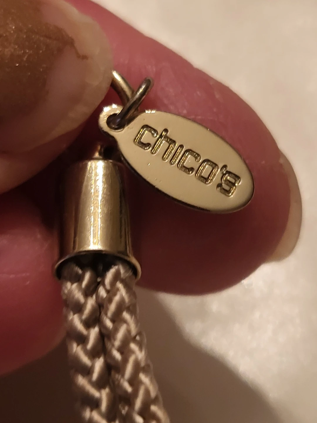 Chico's pendant necklace with a hammered silver-tone disc. It's strung on a braided cord. Features an adjustable chain with a lobster clasp.