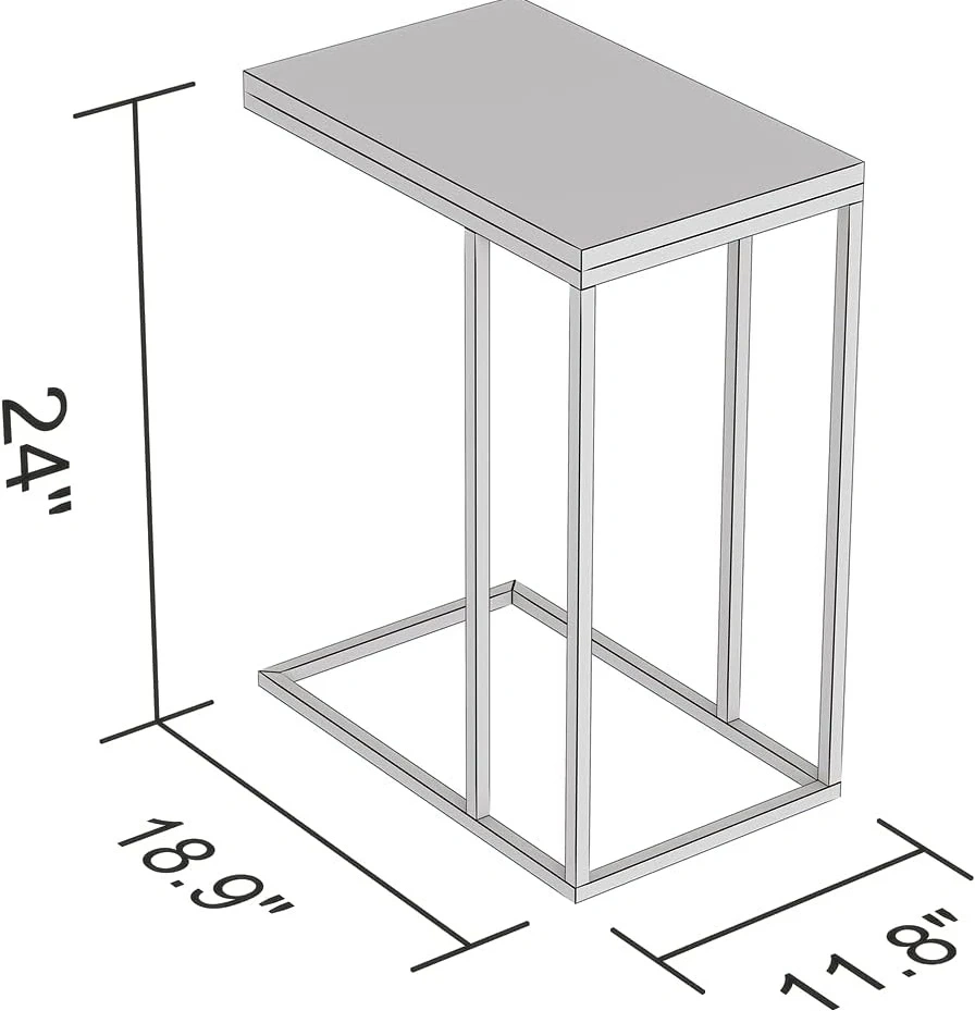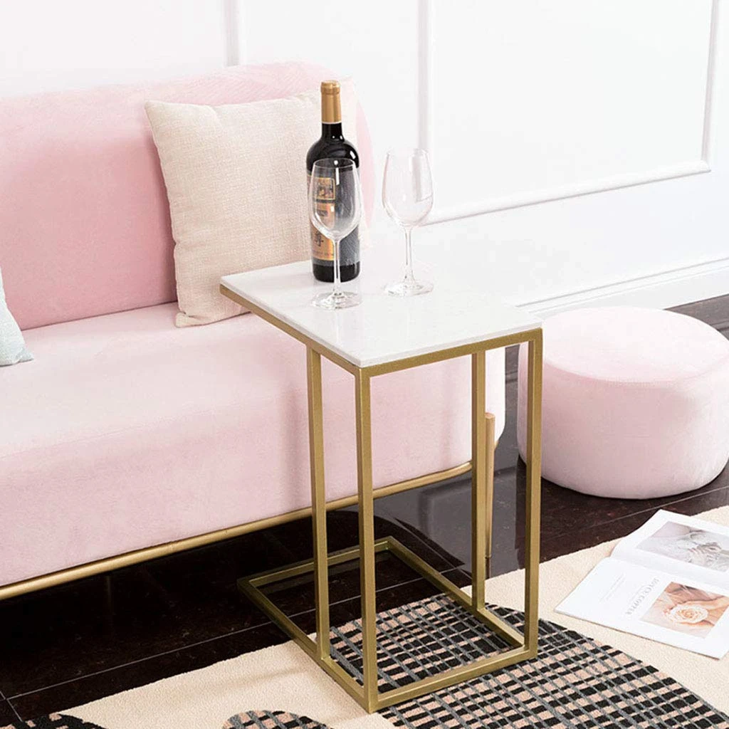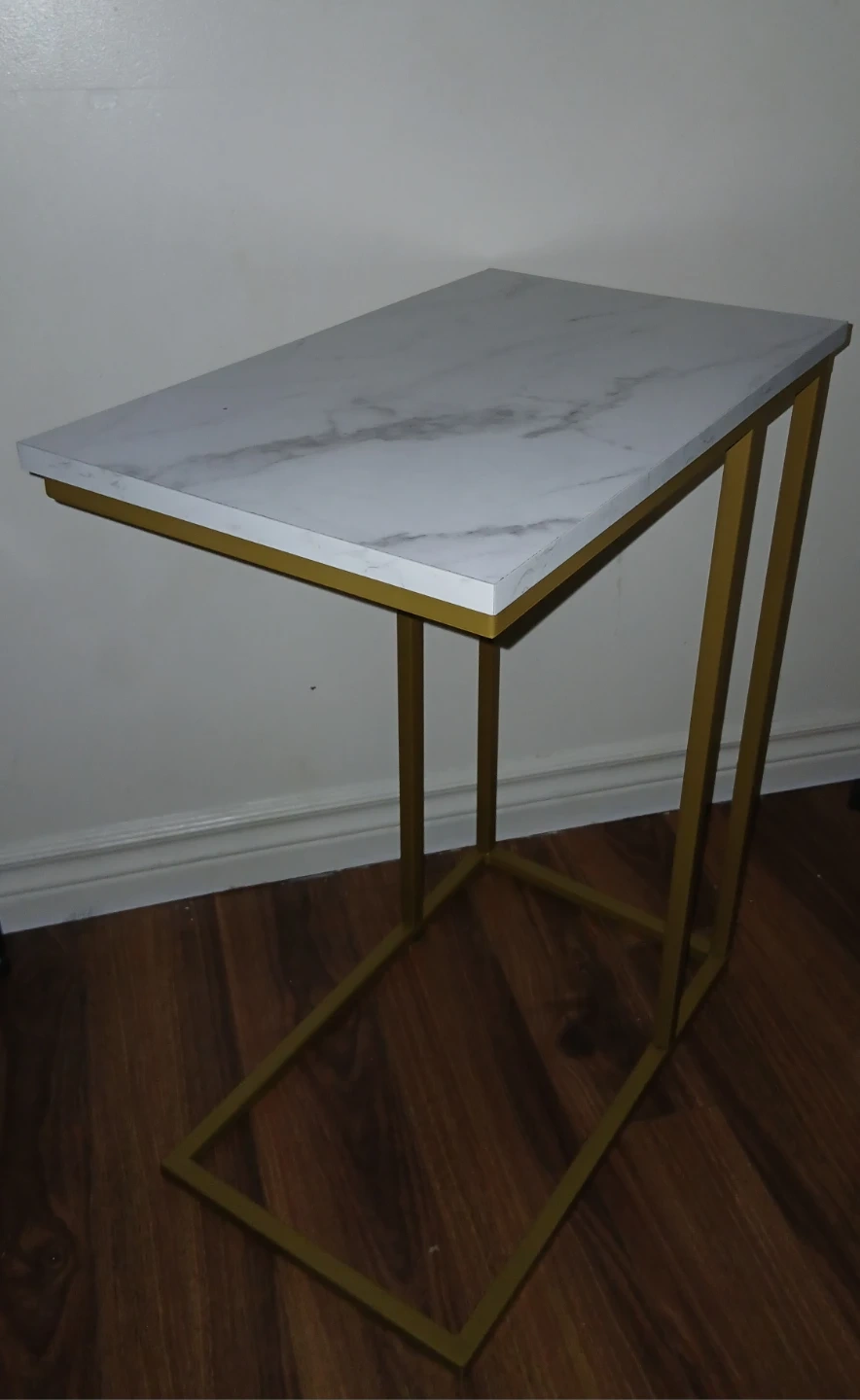 This Safdie & Co. accent table has a marble top and gold metal frame. It's 24 inches tall, 18.9 inches wide, and 11.8 inches deep. This table's C-shape makes it easy to slide under a sofa or chair.