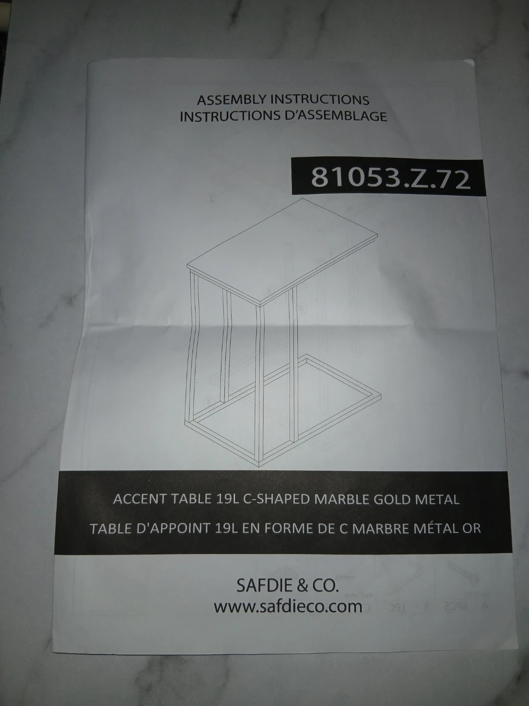 Safdie & Co. C-Shaped Accent Table - Marble Gold Metal