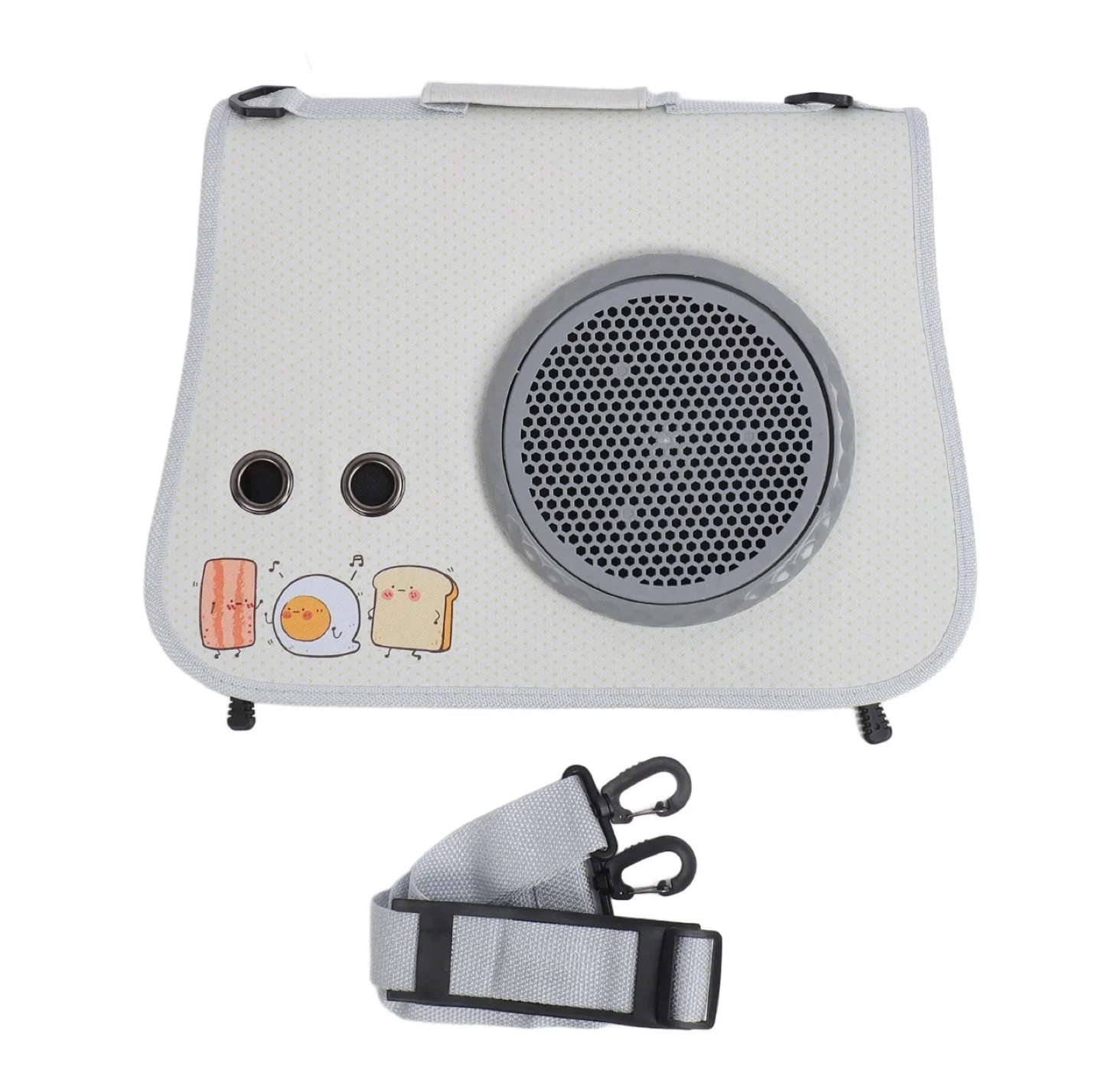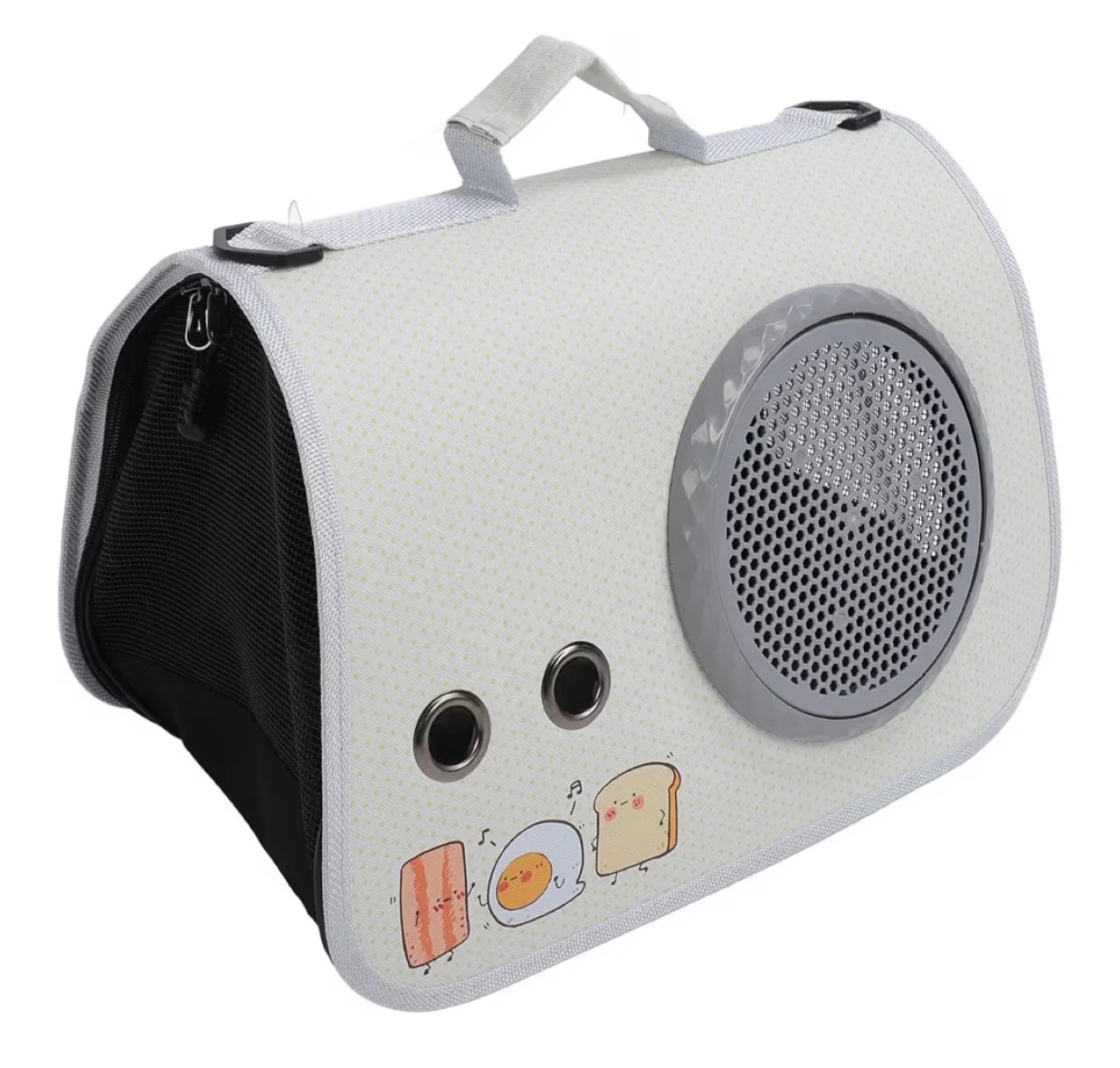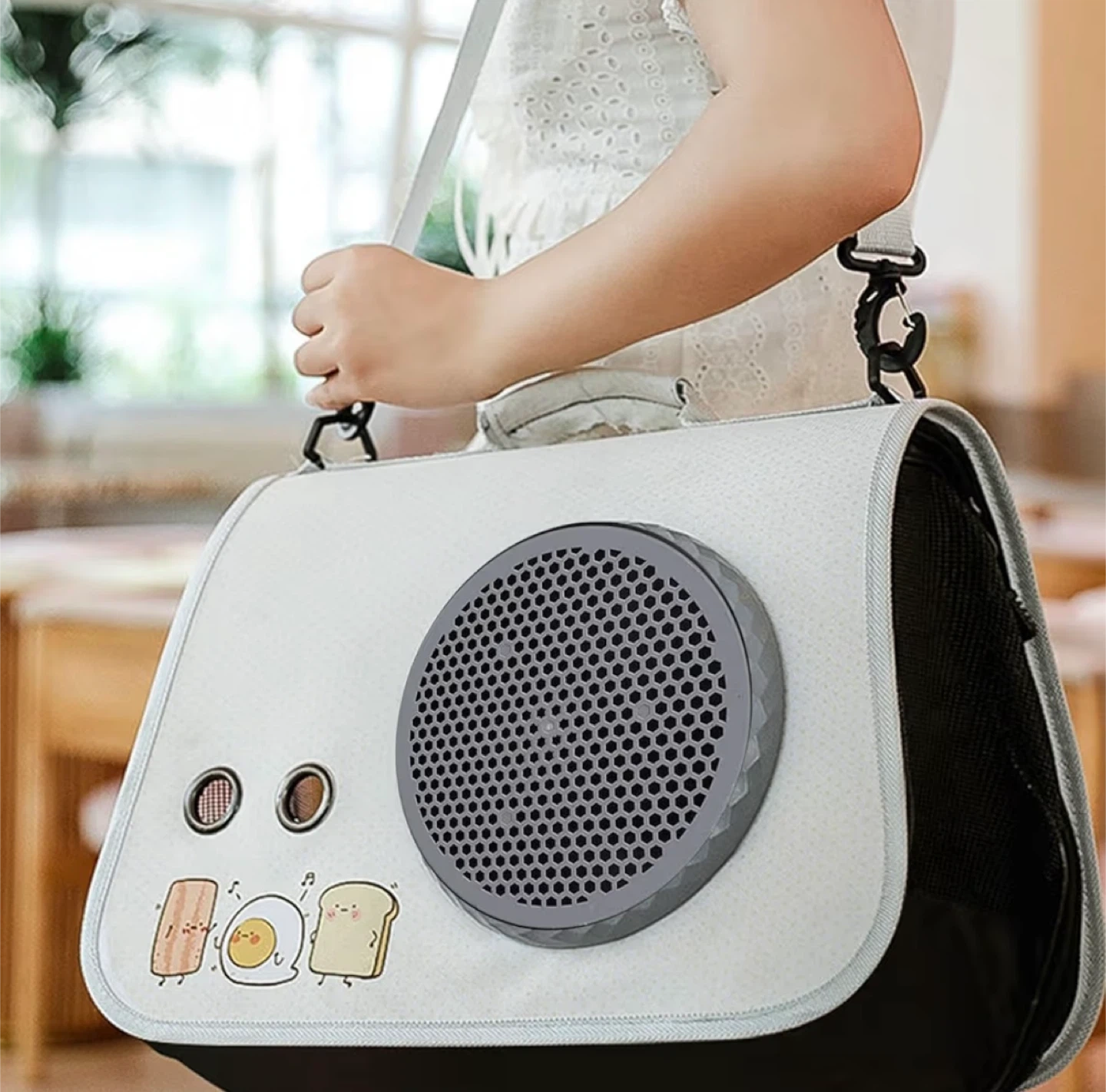 This cute pet carrier bag features a fun breakfast-themed design. It comes with a built-in fan for ventilation and a clear bubble window so your pet can see out. The carrier also includes a detachable shoulder strap for easy transport. It's great for taking your small pet on the go!