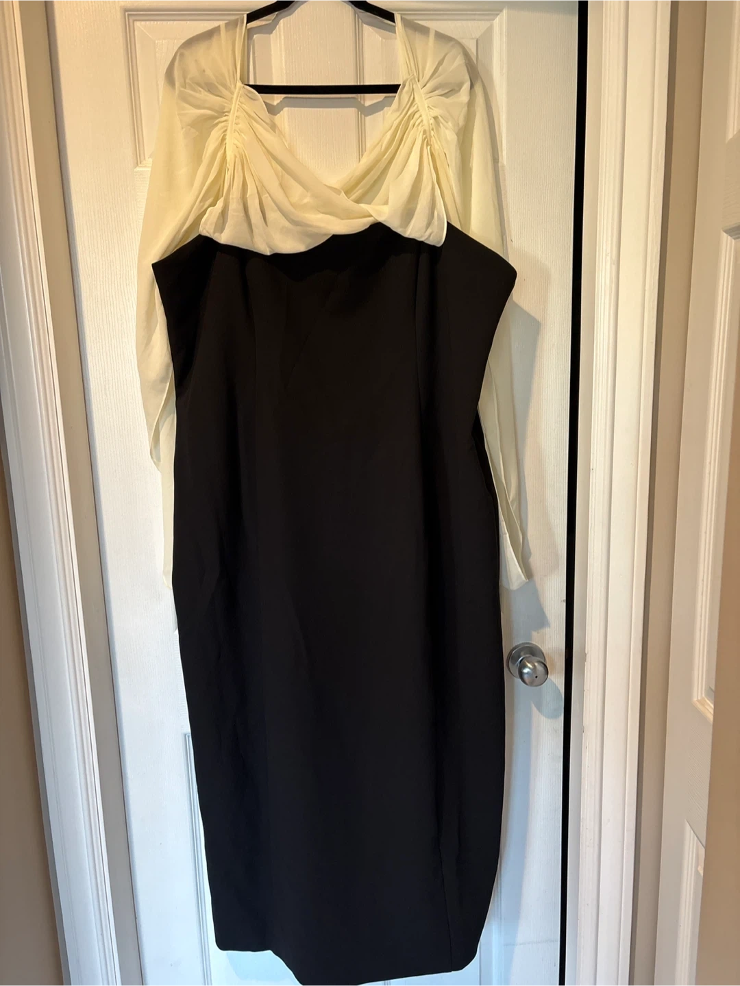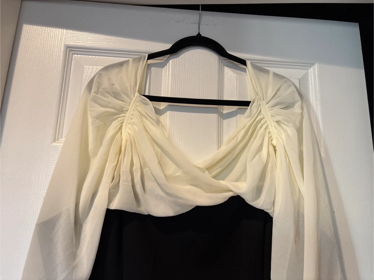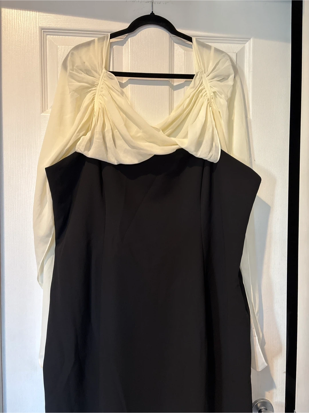 Brand New size 22 This dress features a black bodice with a cream-coloured, ruched chiffon overlay at the neckline and long sleeves. It's a stylish piece for various occasions. Beautiful and elegant designs pick up walnut grove Langley