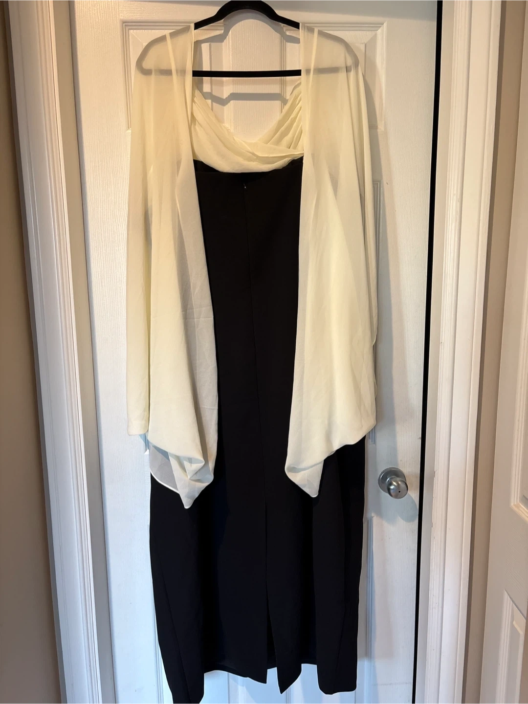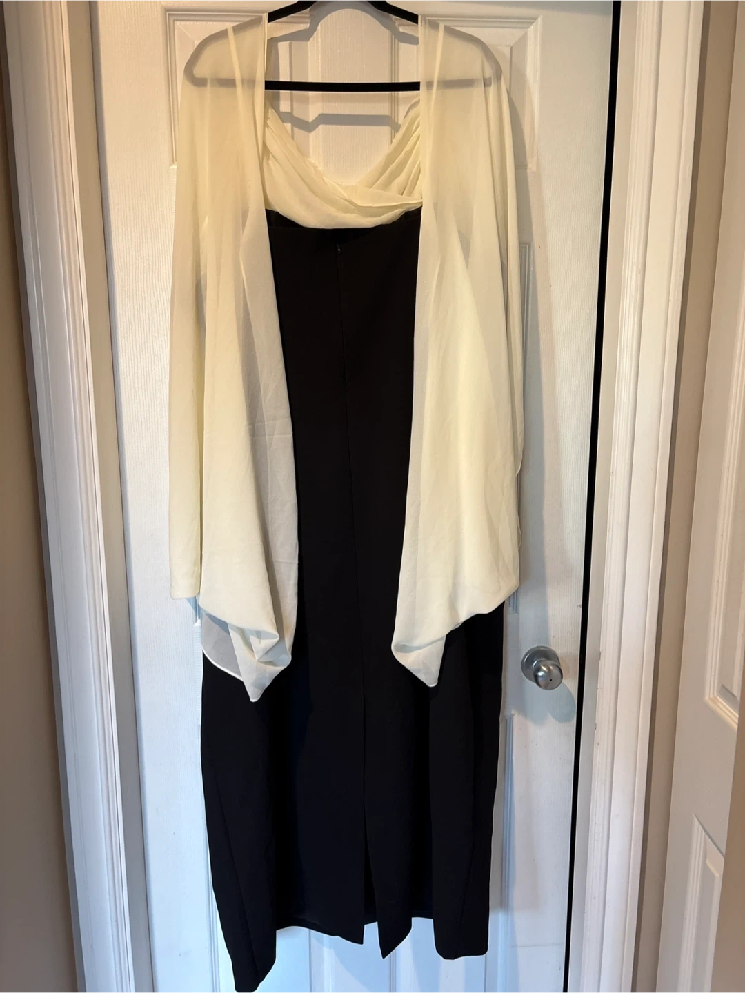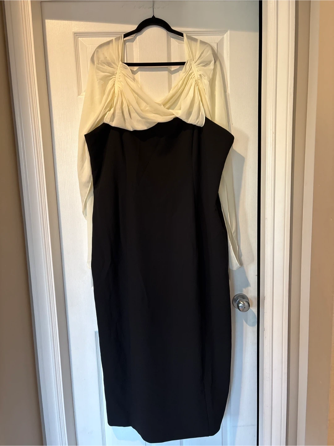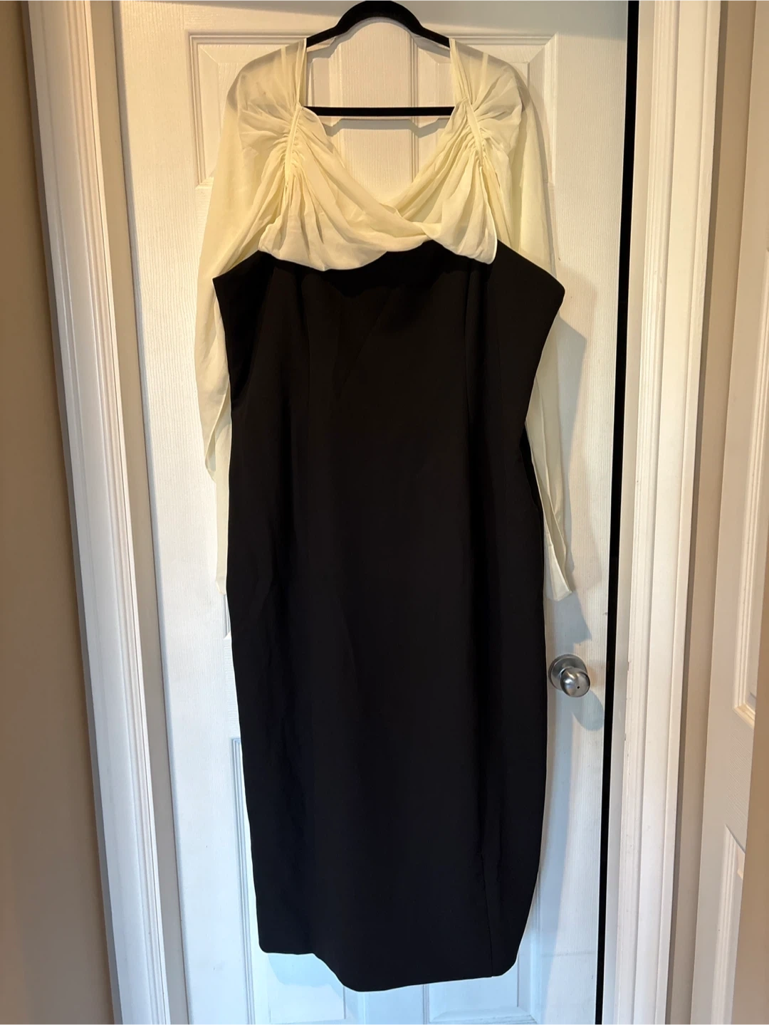 Brand New size 22 This dress features a black bodice with a cream-coloured, ruched chiffon overlay at the neckline and long sleeves. It's a stylish piece for various occasions. Beautiful and elegant designs pick up walnut grove Langley