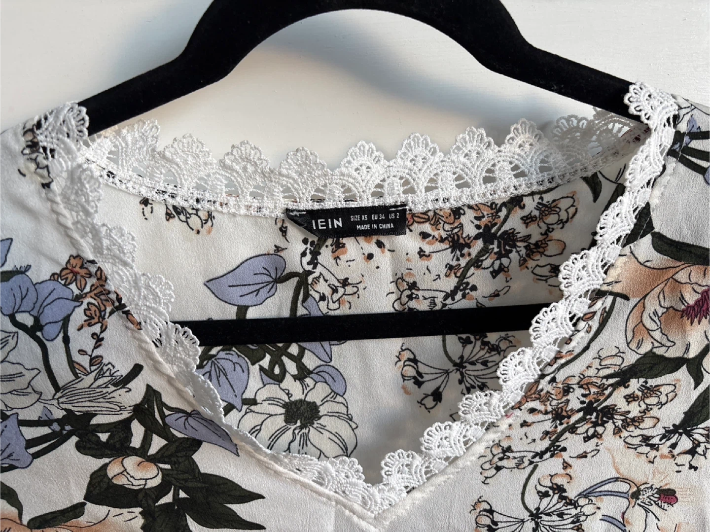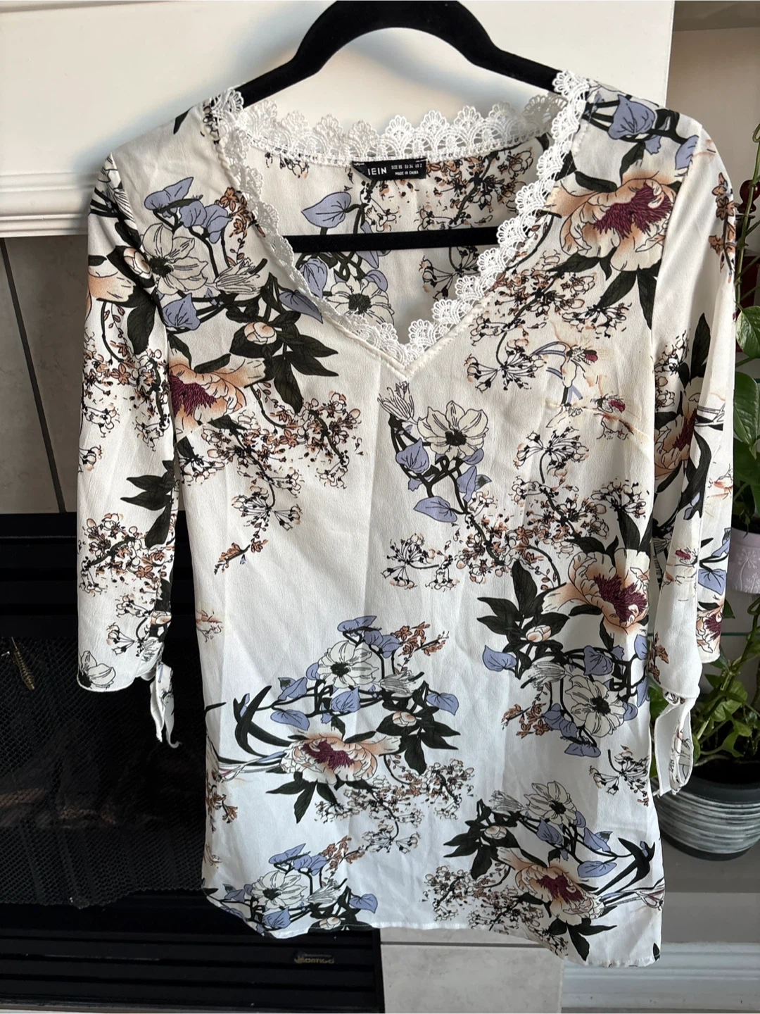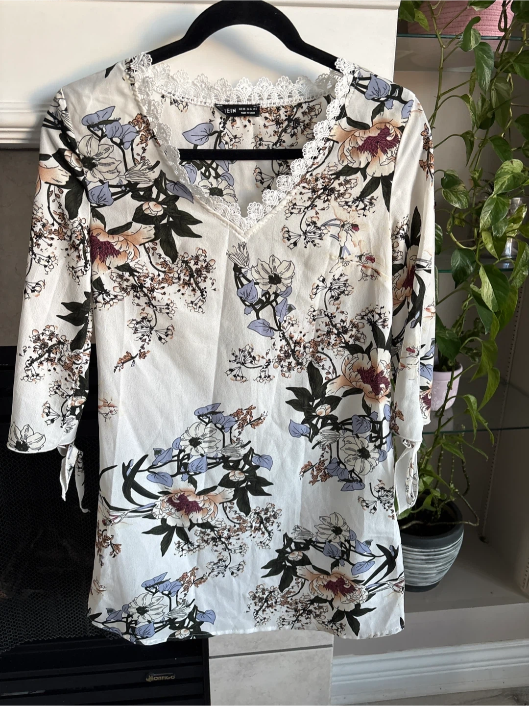 Brand new Wiht out tag A white SHEIN blouse featuring a delicate floral print and lace trim along the V-neck. It has three-quarter sleeves with tie details. This top is perfect for adding a touch of spring to your wardrobe!