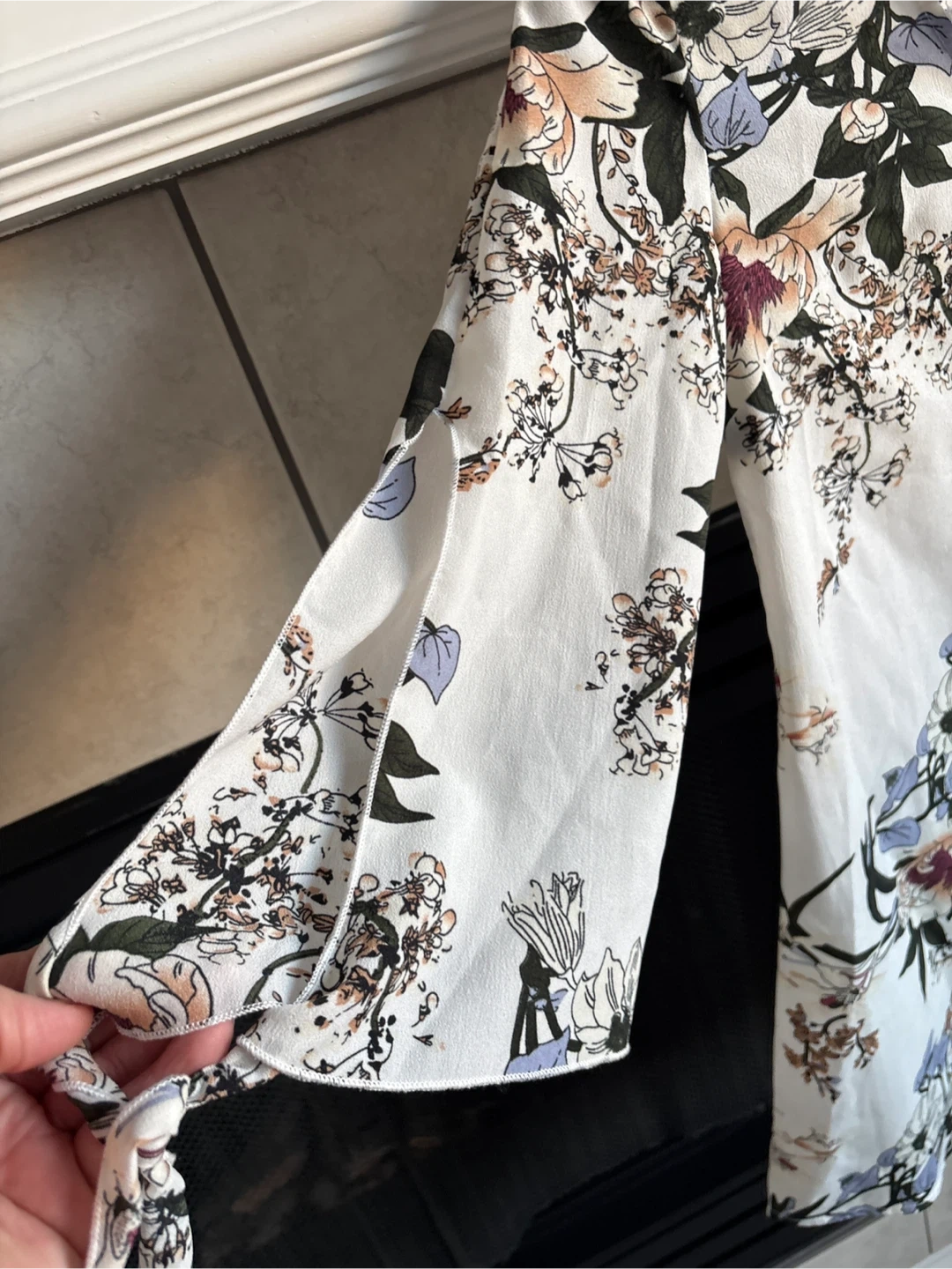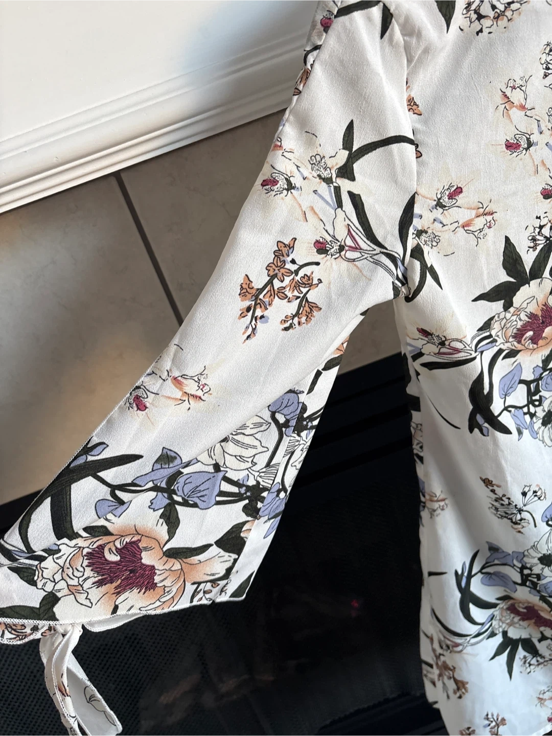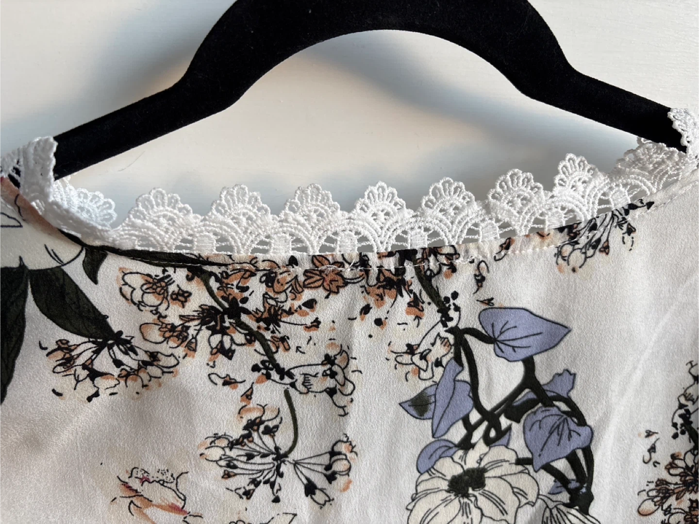Brand new Wiht out tag A white SHEIN blouse featuring a delicate floral print and lace trim along the V-neck. It has three-quarter sleeves with tie details. This top is perfect for adding a touch of spring to your wardrobe!