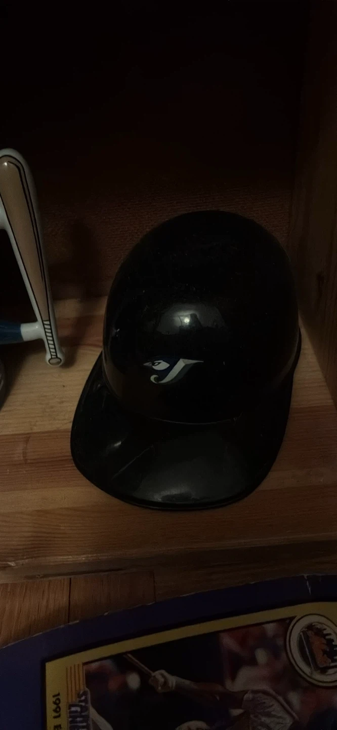 This is a black Toronto Blue Jays baseball mini helmet. It features the team's logo on the front. One size fits most.