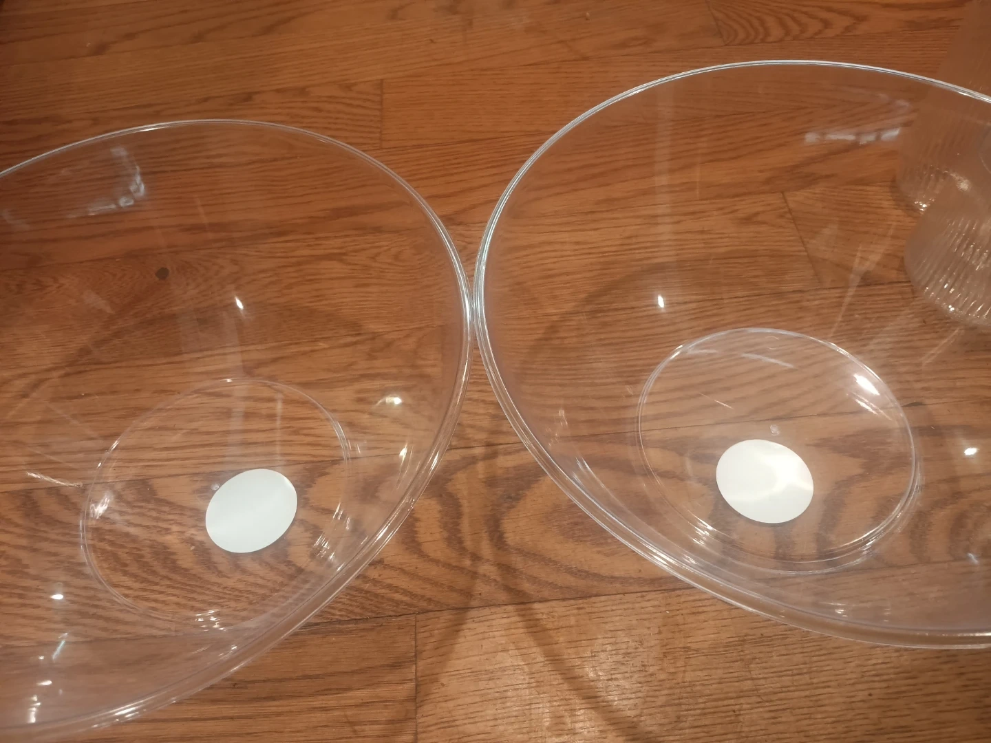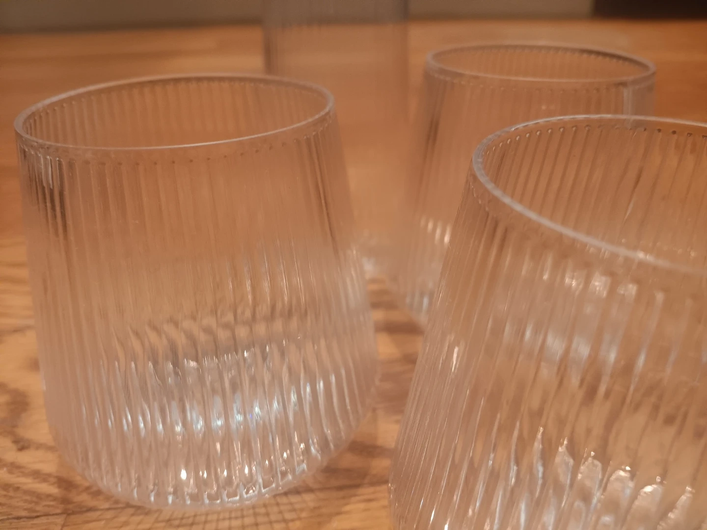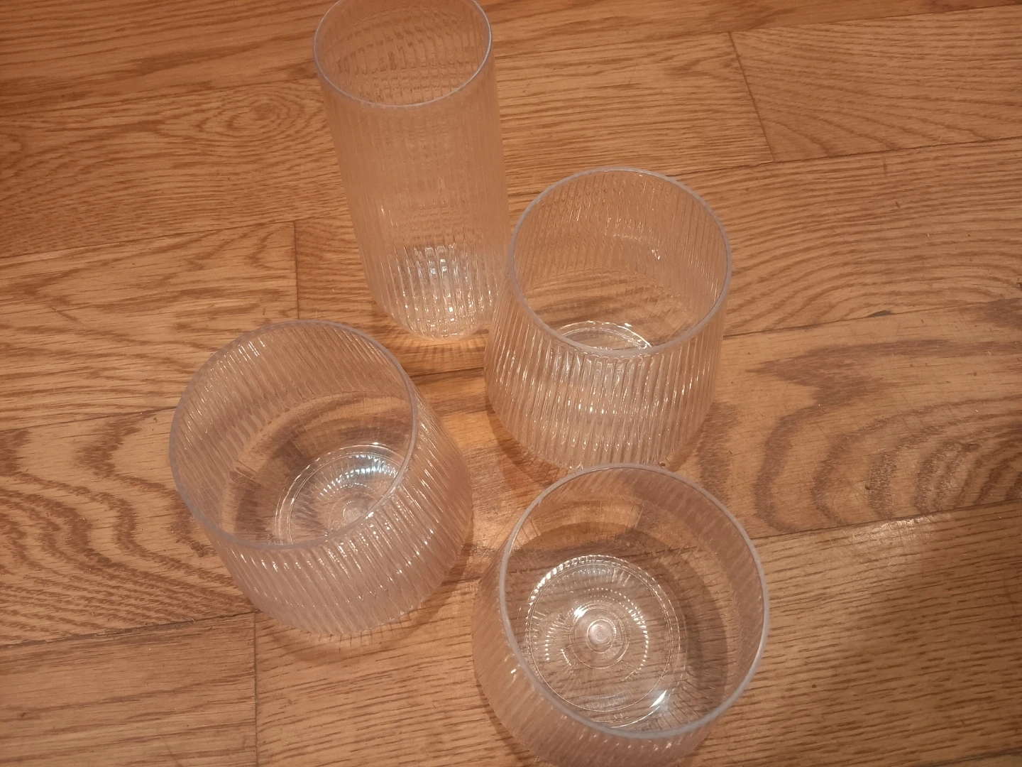 This set includes four clear ribbed tumbler glasses and two clear serving bowls. They're made of durable plastic. The tumblers have a unique ribbed texture.