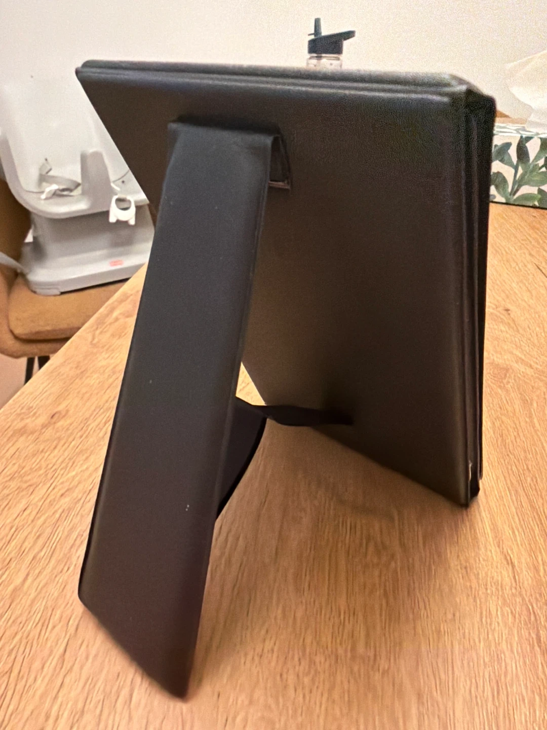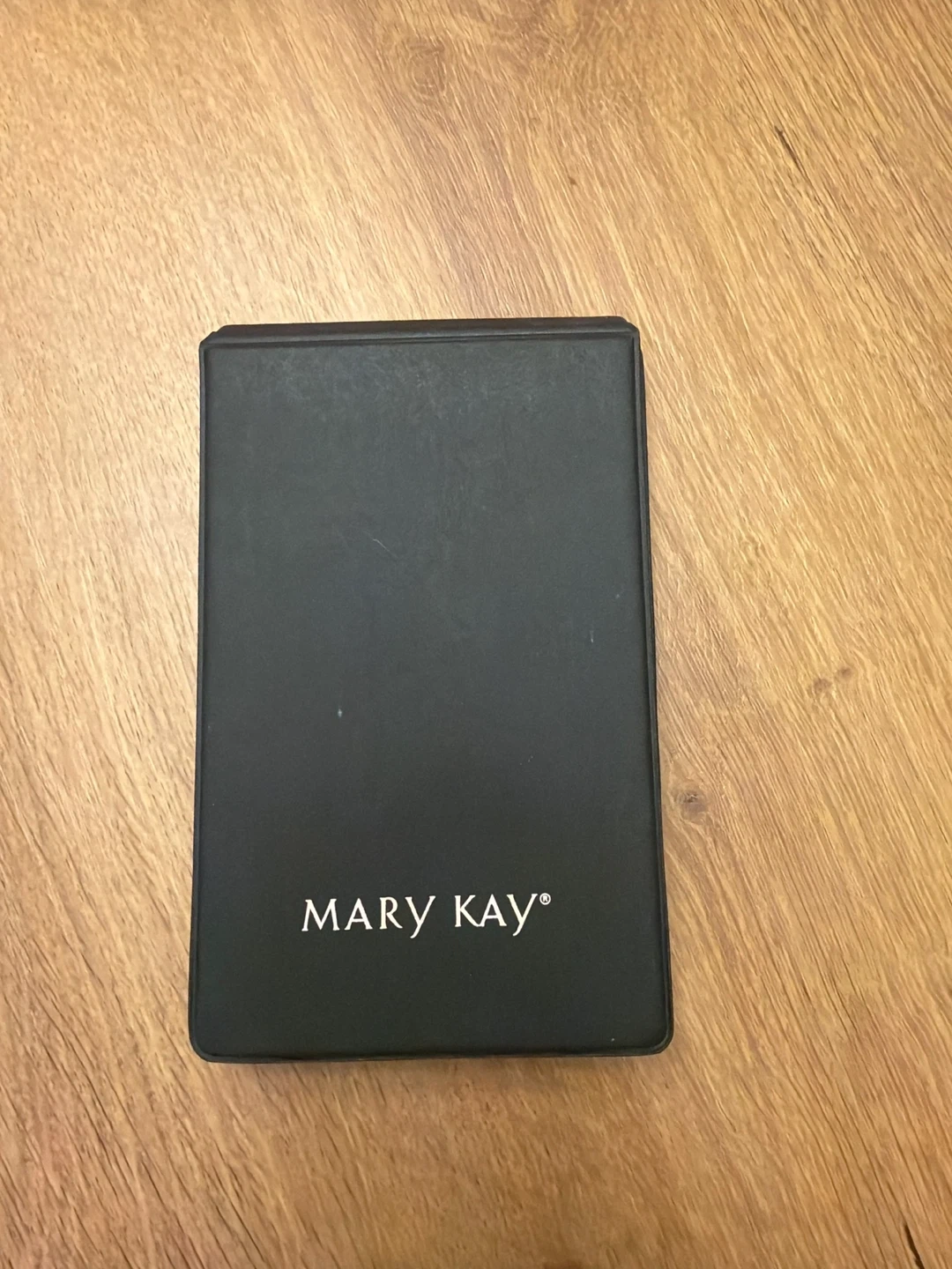This is a Mary Kay compact mirror with a black exterior and a stand. The interior mirror is removable. Perfect for touch-ups on the go!