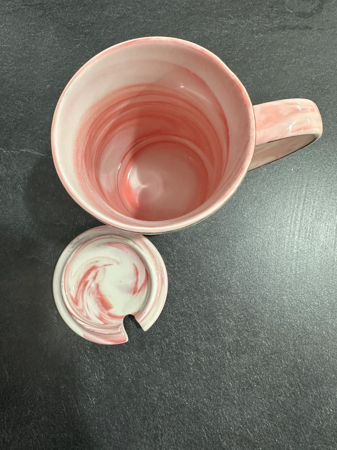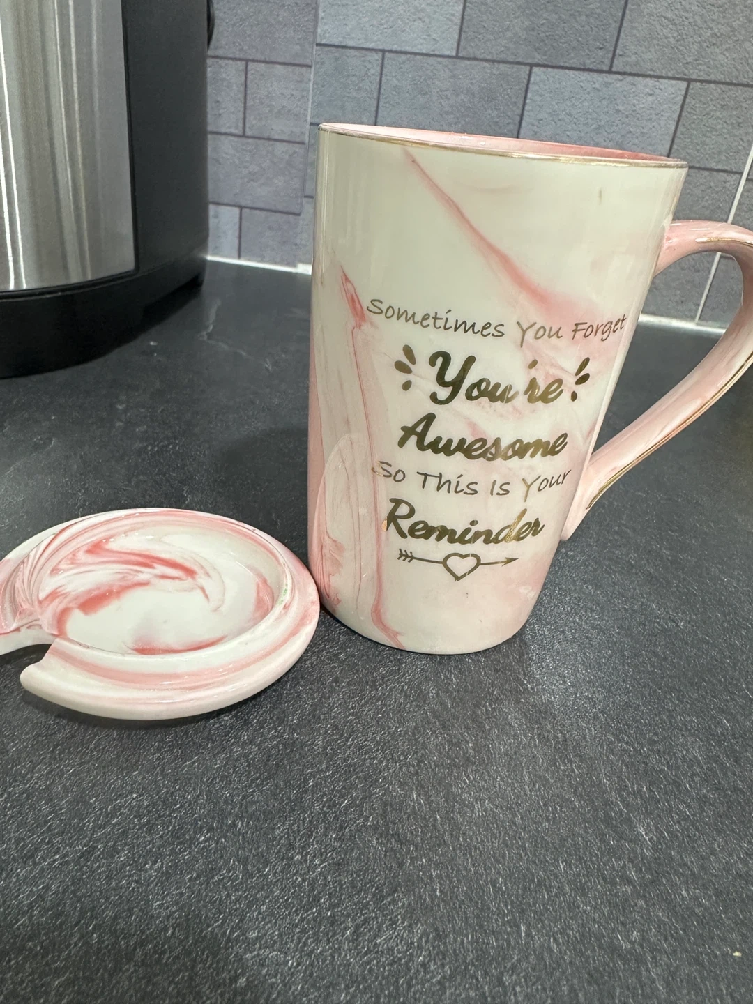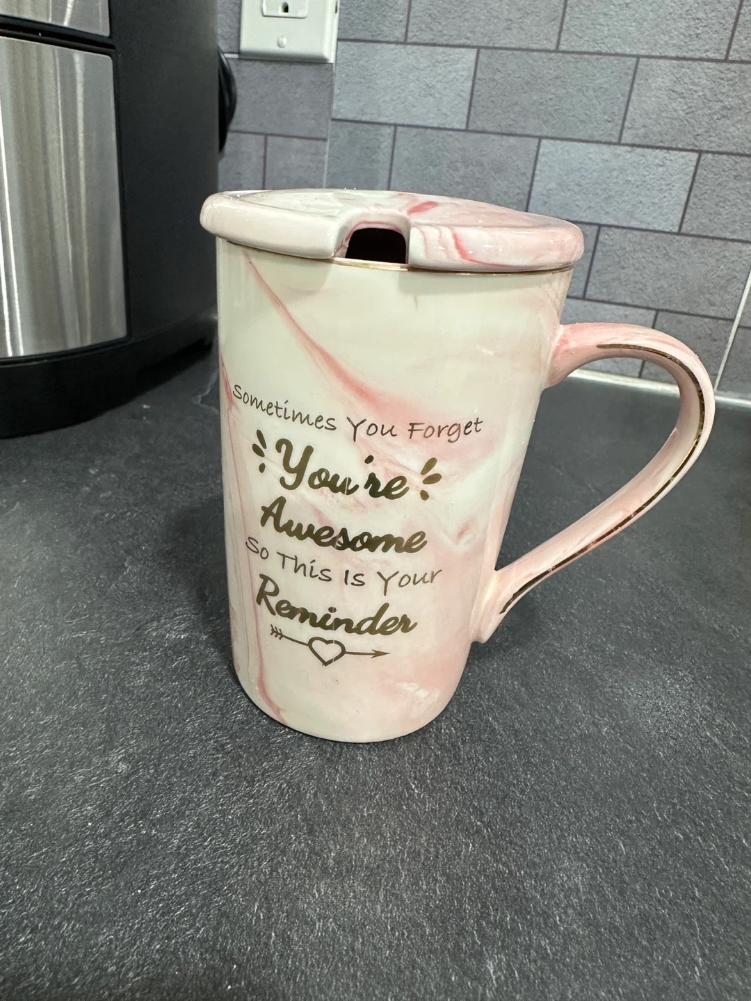 This ceramic mug features a pink and white marble swirl design. It includes a matching lid with a slot for a spoon. The mug has a heartwarming message: 'Sometimes You Forget You're Awesome, So This Is Your Reminder'. It's a great way to start your day with a positive thought!