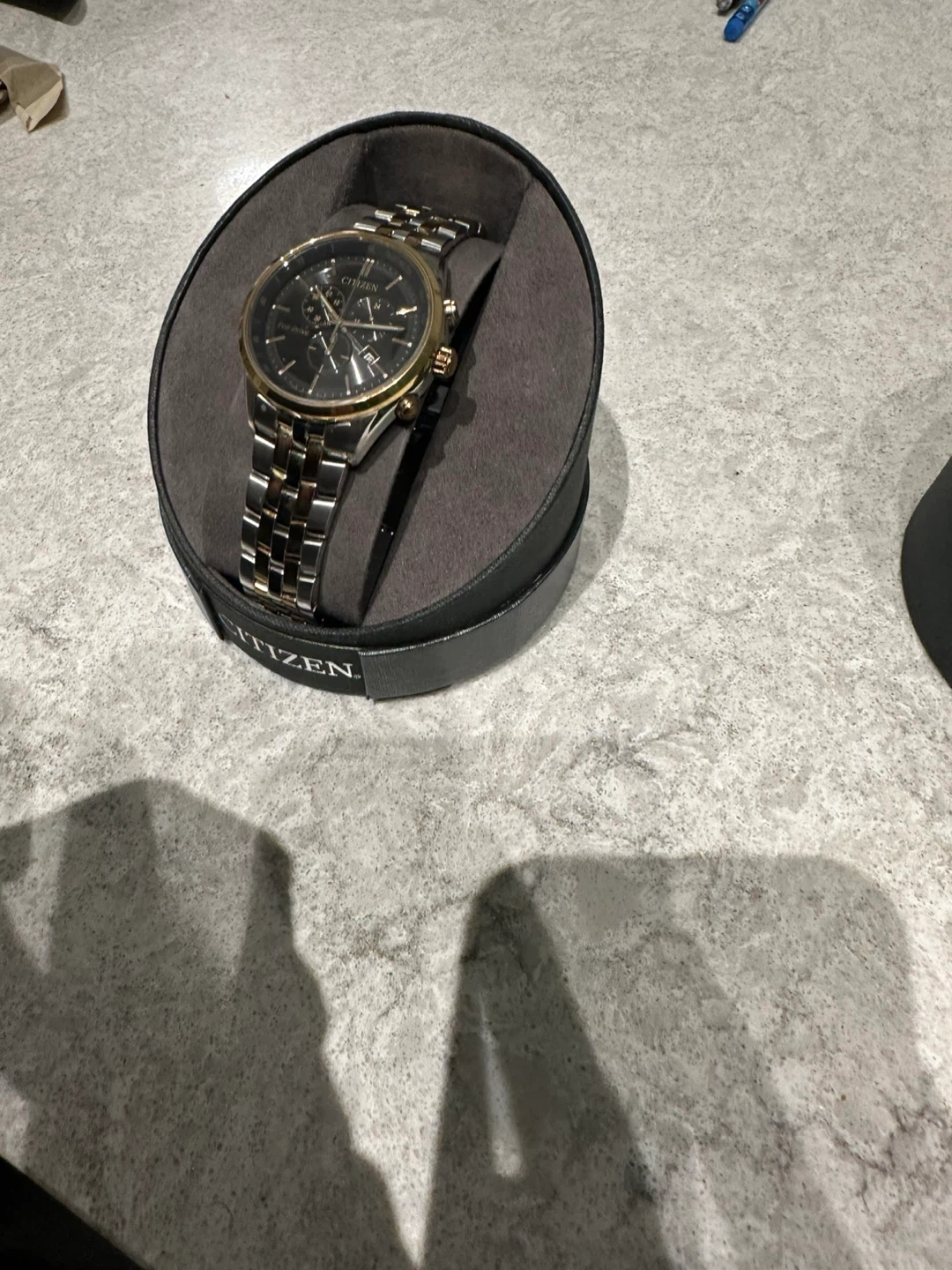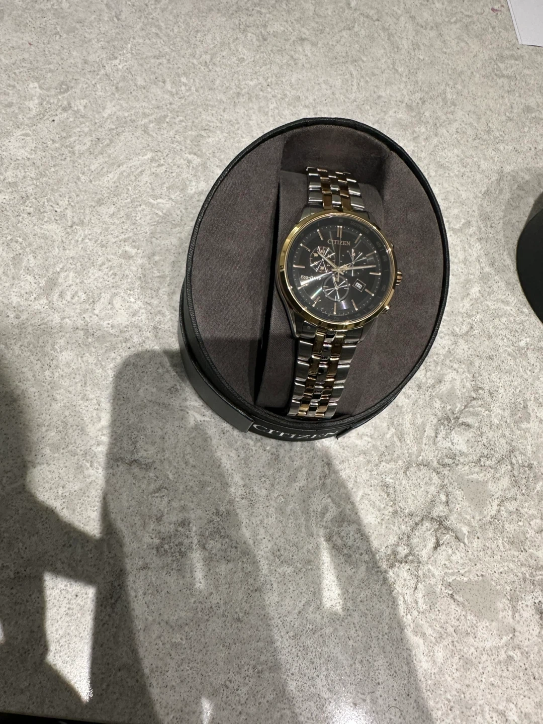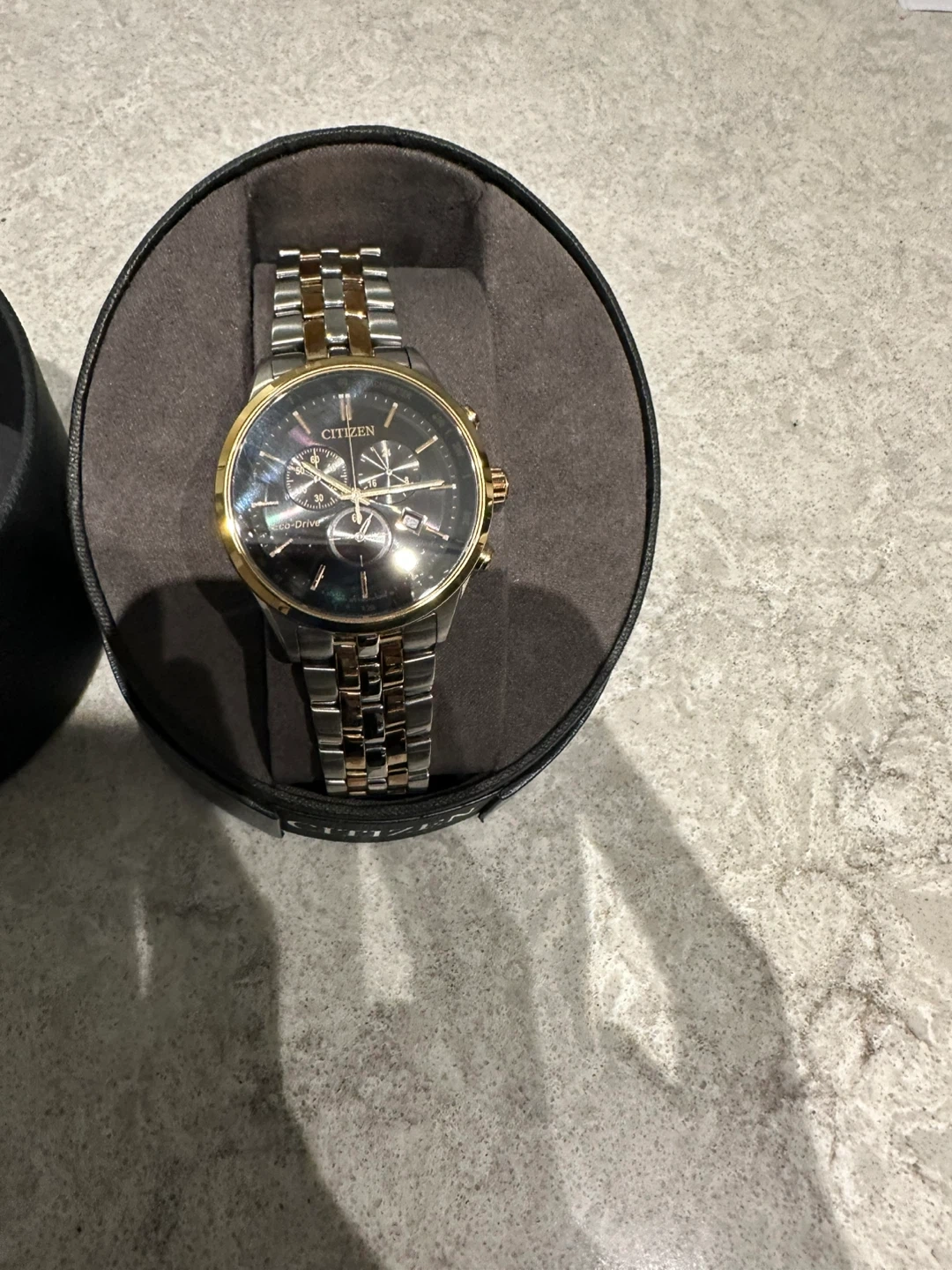 Citizen Eco-Drive watch with a stainless steel and gold-tone band. It's a stylish timepiece that runs on light power. Includes the original Citizen box.