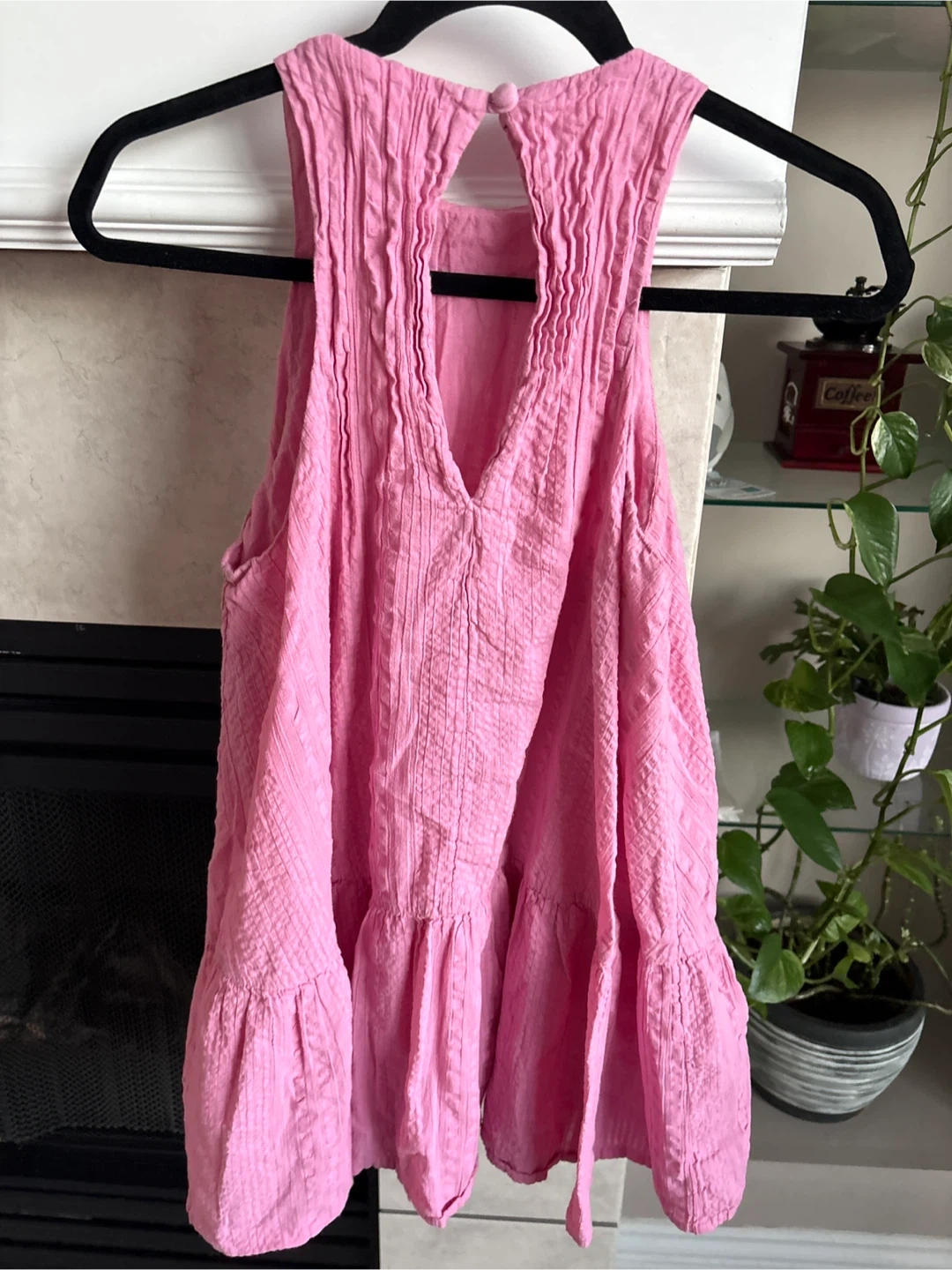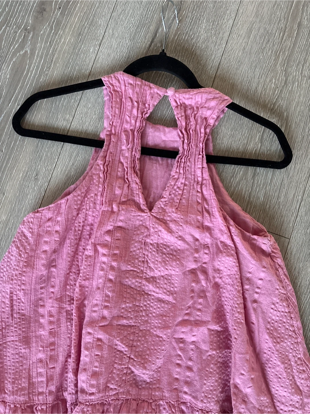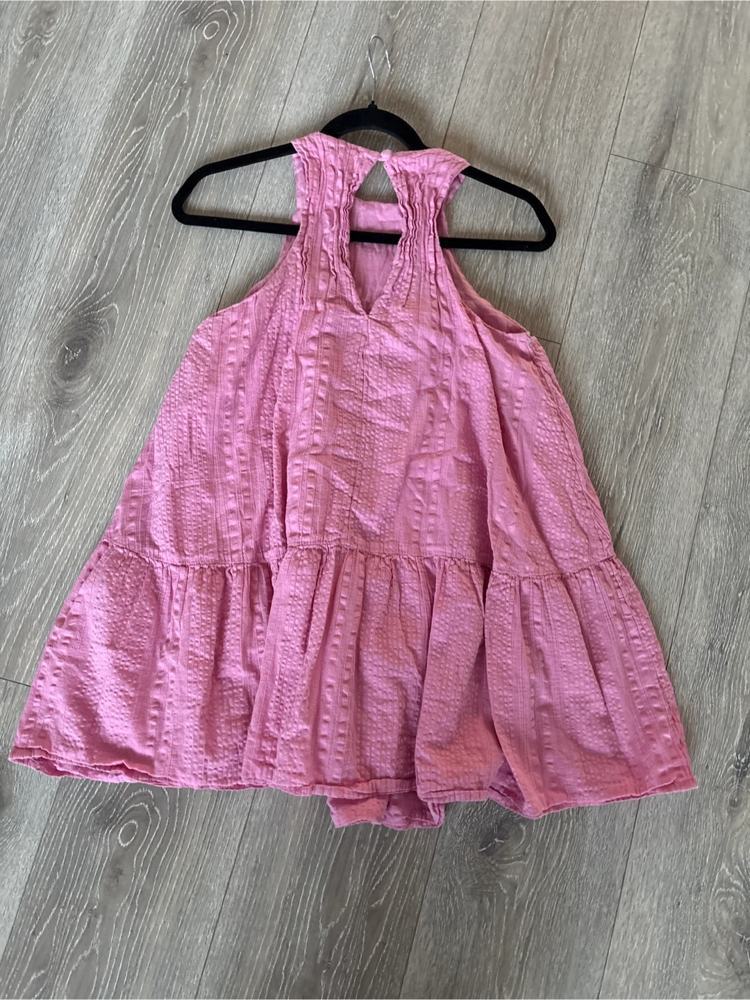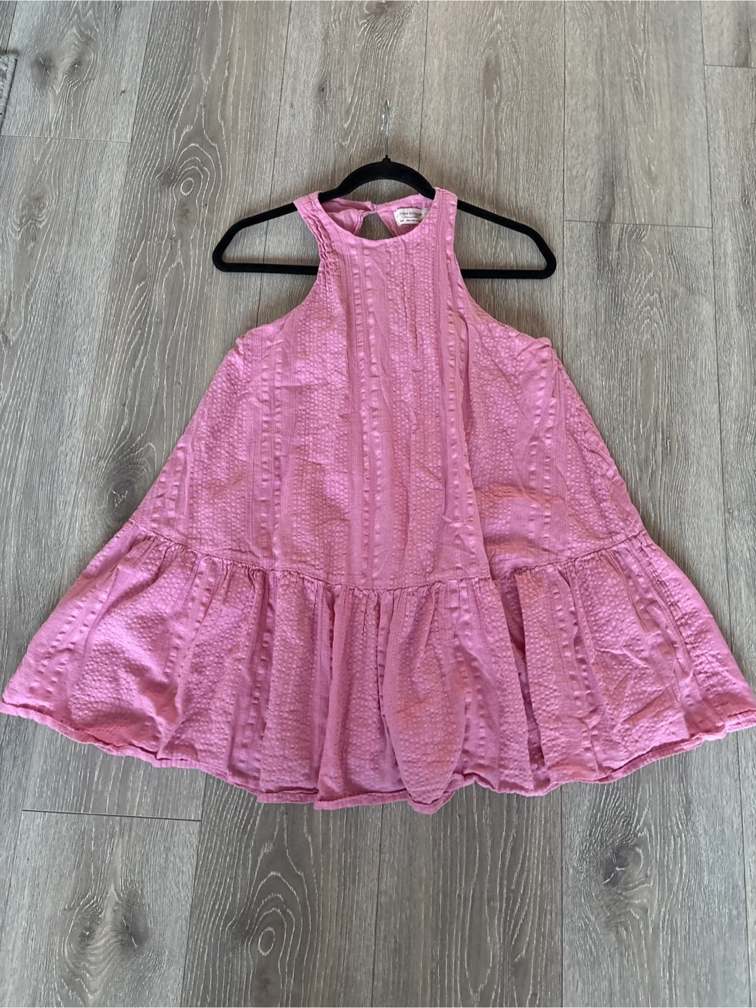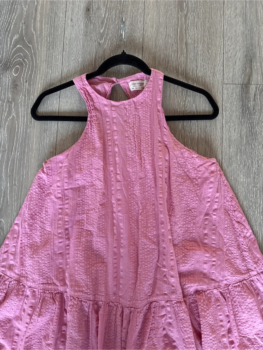 This is a pink tiered mini dress from Urban Outfitters. It features a textured fabric and a halter neckline with a keyhole detail. It's a stylish piece for warm weather! size s get ready for summer time pick up walnut grove Langley