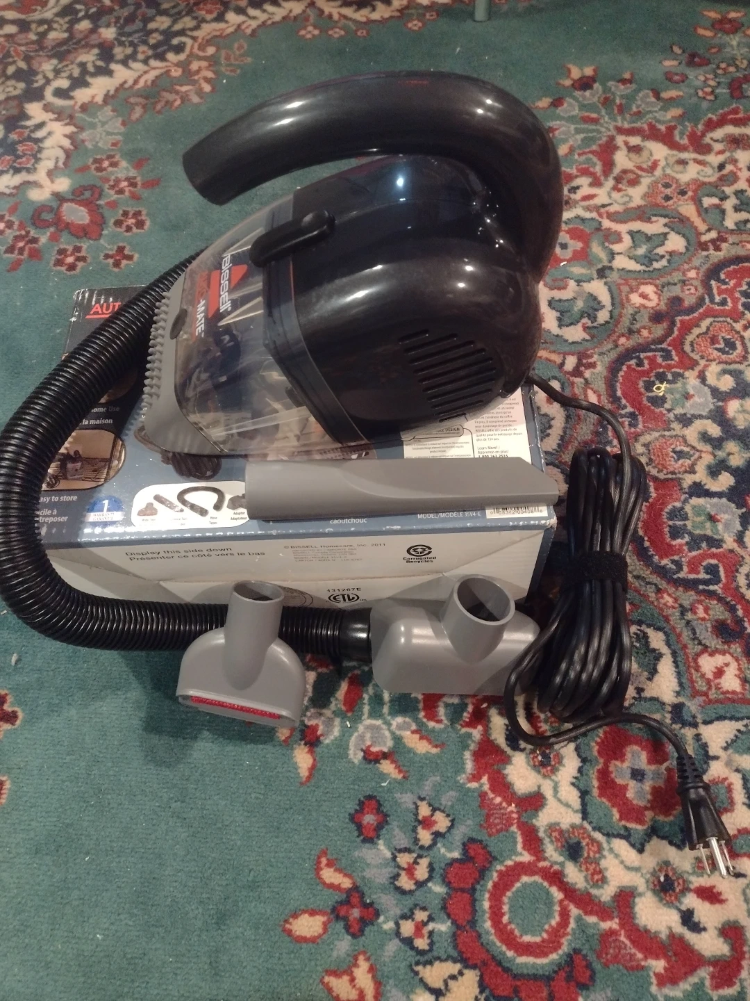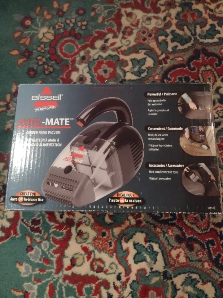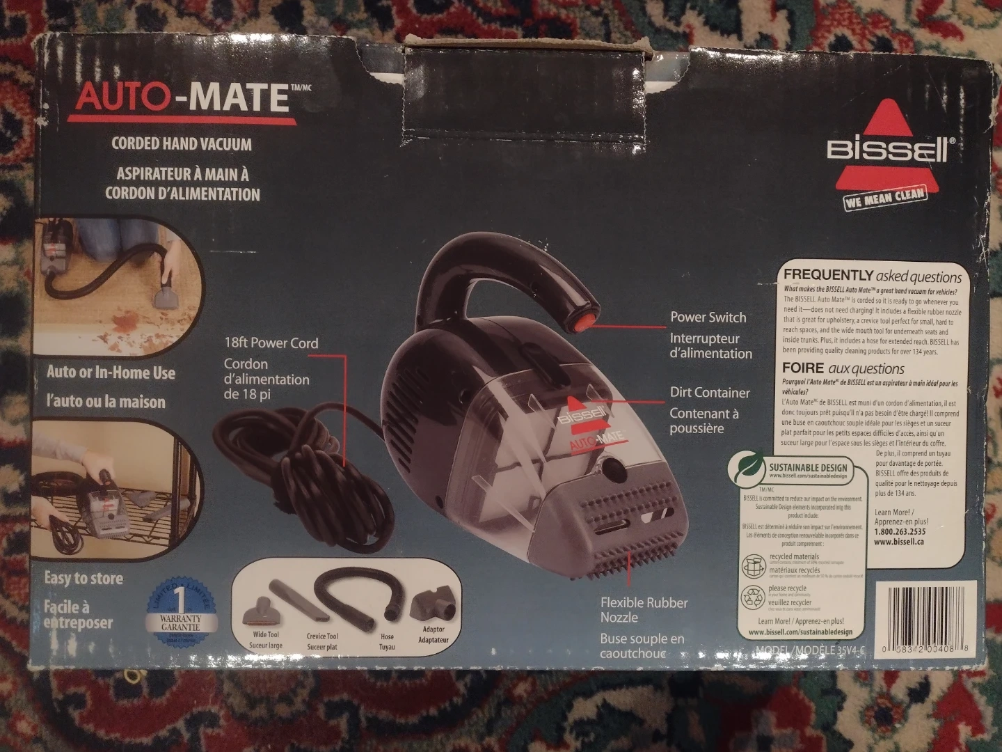 BISSELL Auto-Mate corded hand vacuum for quick cleanups. It comes with a 18ft power cord, flexible rubber nozzle, crevice tool, hose, and adapter. Perfect for tight spaces and quick spills! Brand new as it has never been used.