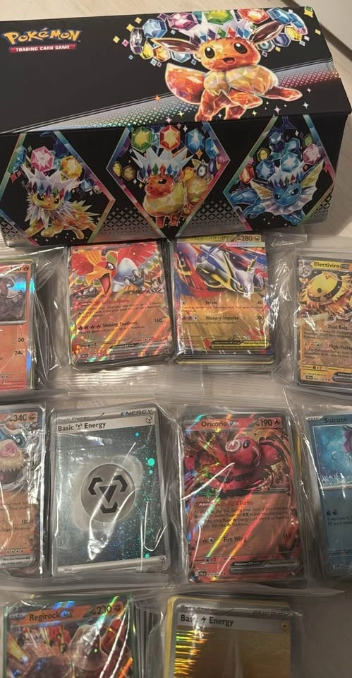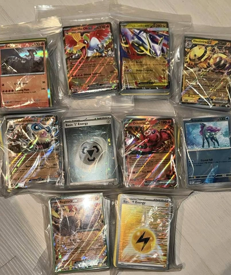 Selling 10 bags of Pokemon cards. Each bag contains 60 cards, except for the lightning energy bag which has 75 energies. The other bags include a mix of holos, reverse holos, rares, trainers, energies, and commons from various Pokemon types. Buy individually for $4 each, or take all 10 bags for $35 and get a free storage box.