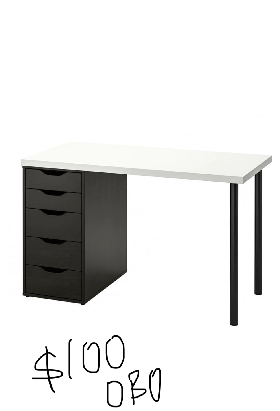A white and black IKEA Micke desk with a five-drawer unit. It's a great workspace solution for small spaces. The desk is 105cm wide.