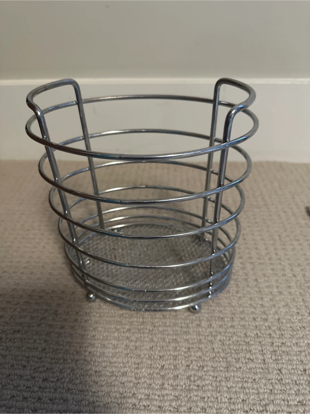 This is a silver wire utensil holder. It's made of metal and has a cylindrical shape with an open top. It stands on three small ball feet. It's useful for organizing kitchen drawers or countertops.