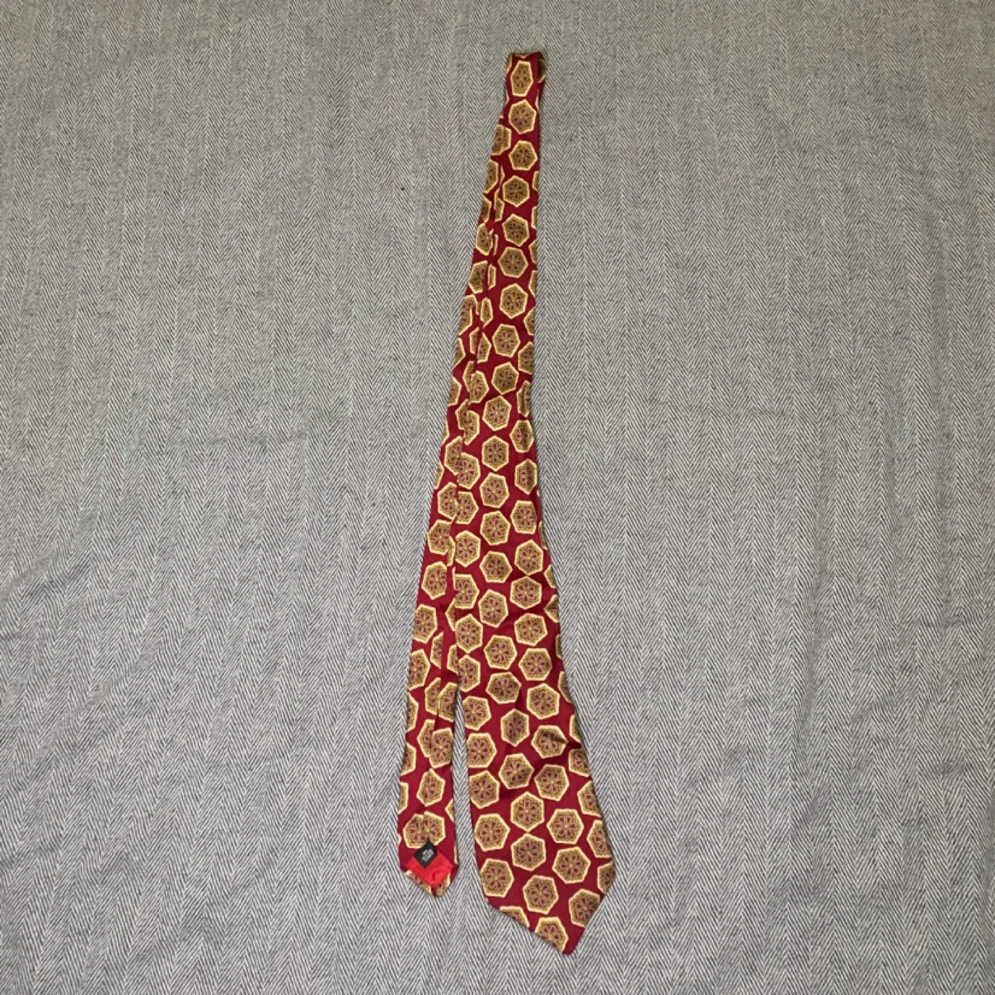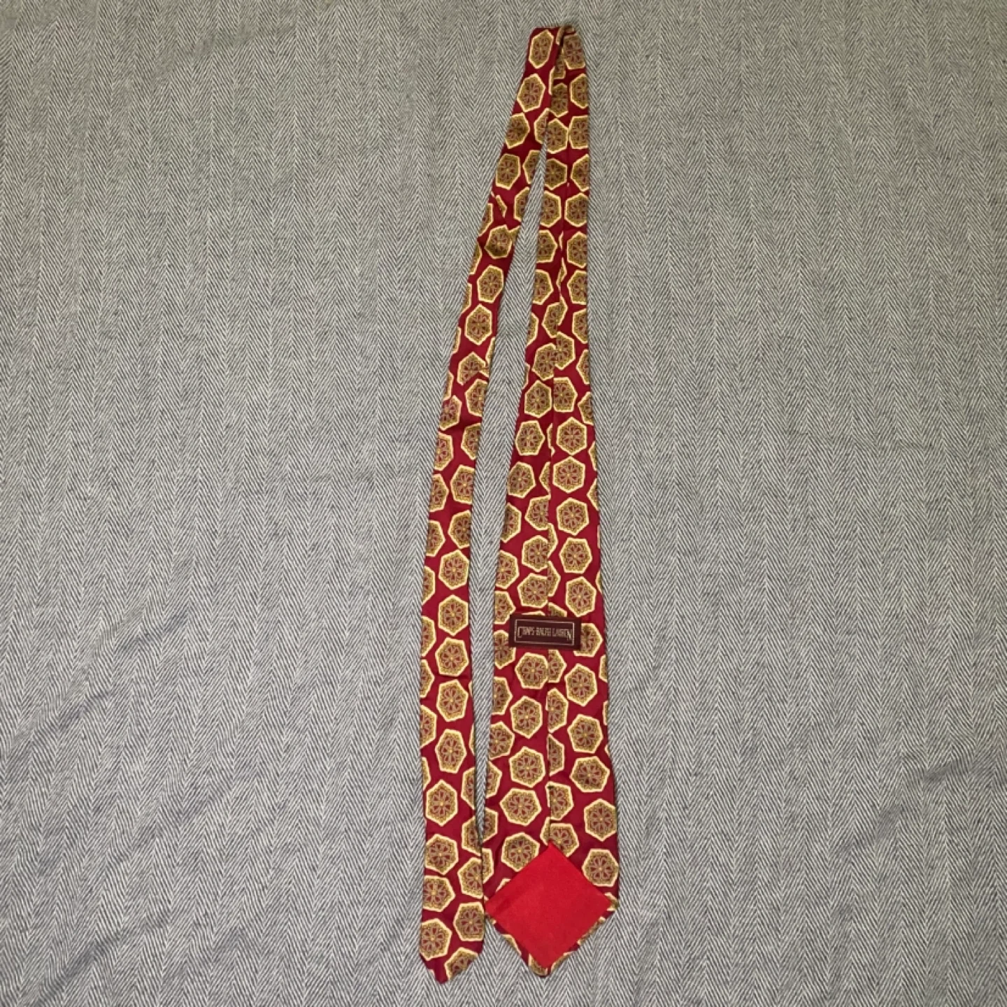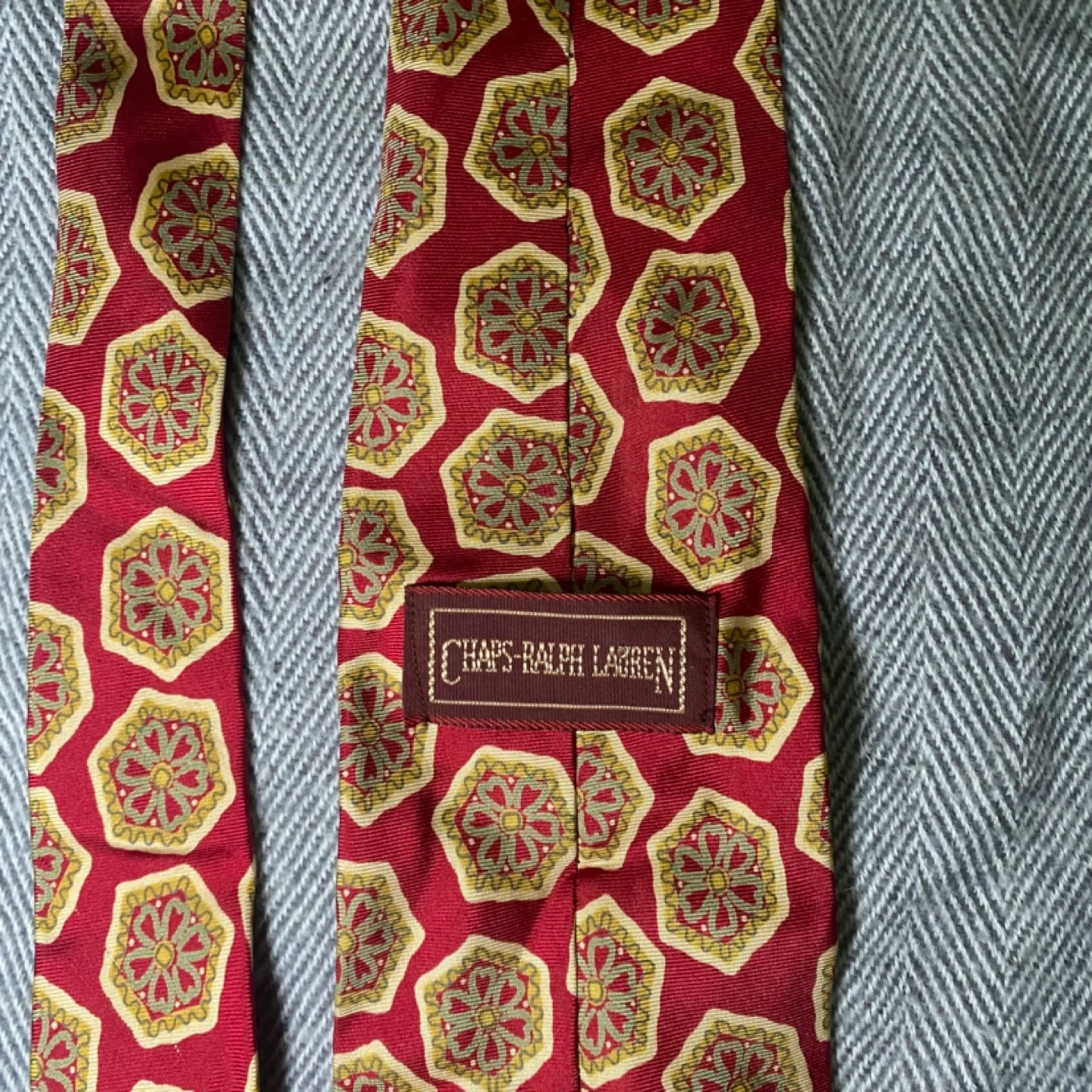 This is a Chaps Ralph Lauren tie with a red background and a repeating geometric pattern. It's a classic accessory for dressing up an outfit. A nice tie for business or formal occasions!