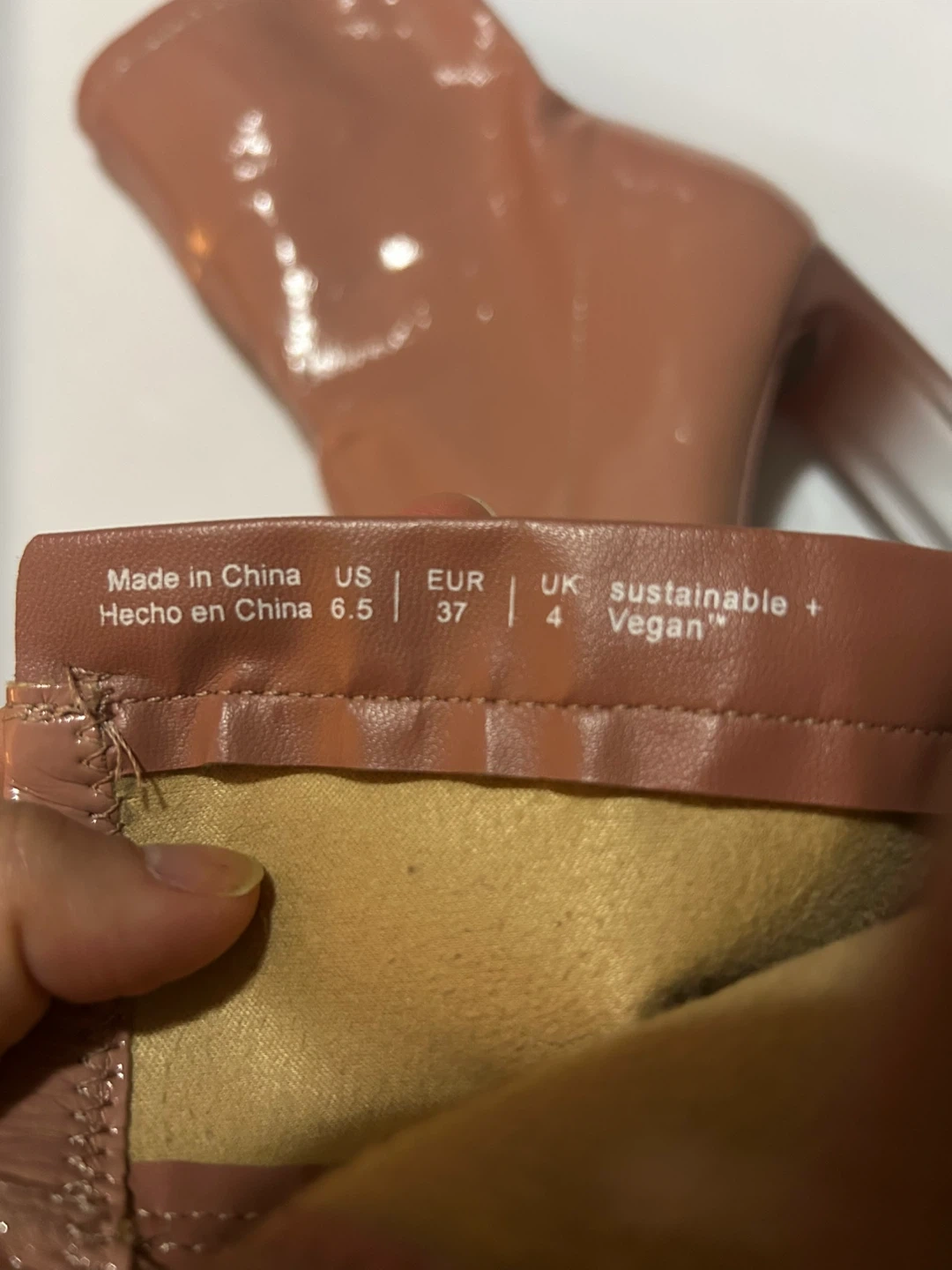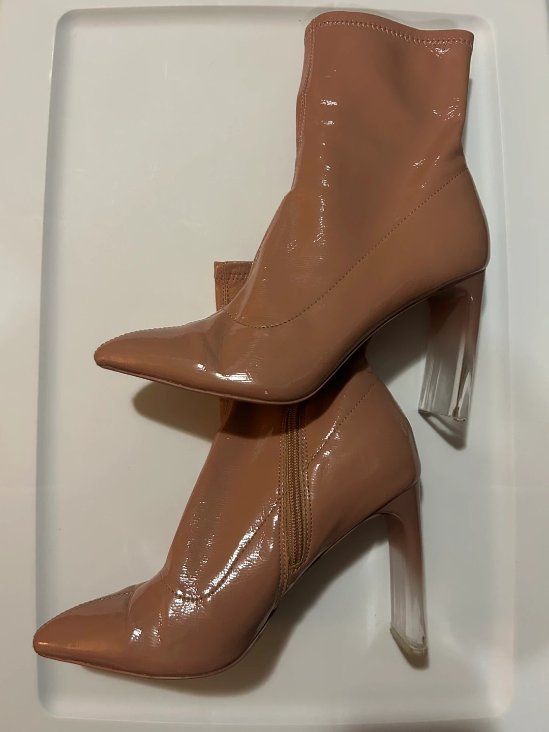 These stylish pink patent ankle boots feature a clear block heel and a side zipper. Made with sustainable vegan materials. size US 6.5.