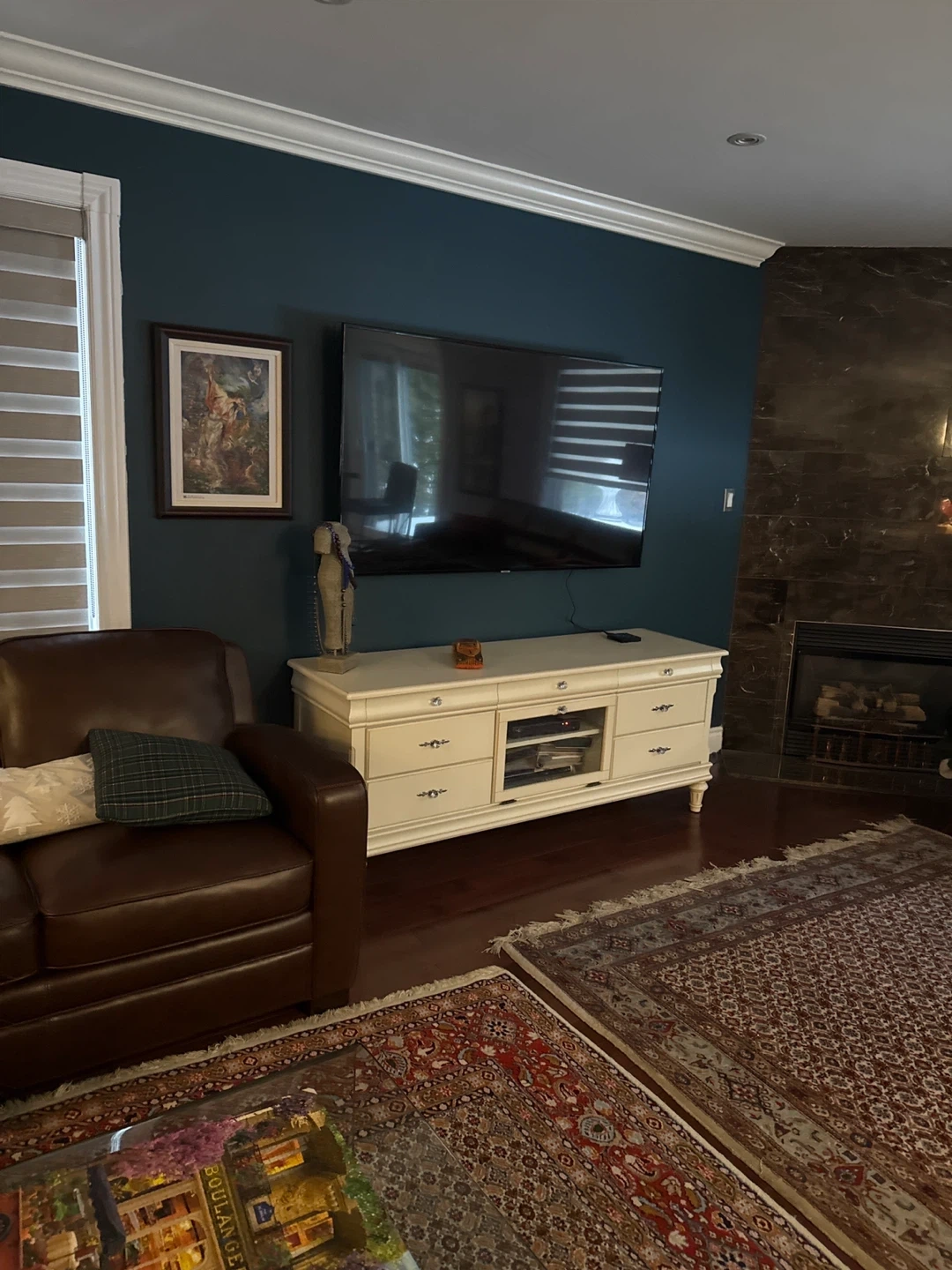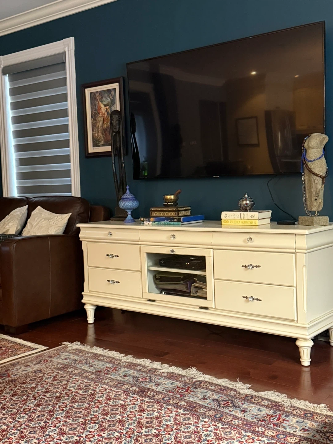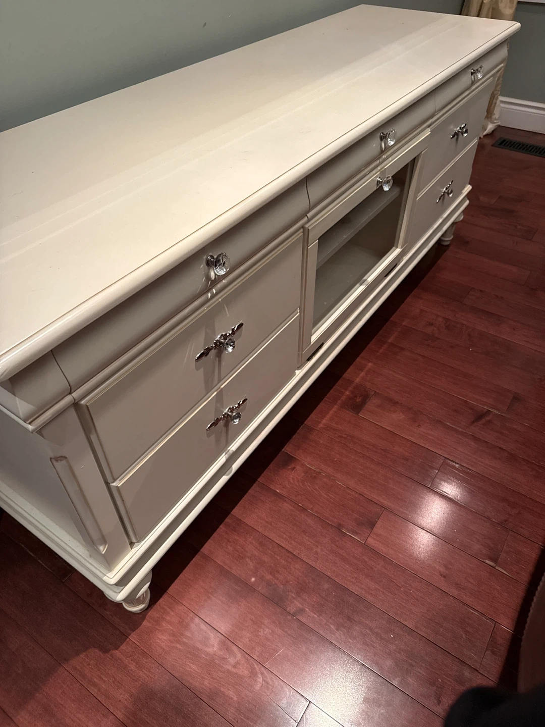Cream coloured entertainment unit featuring a central glass-front cabinet with shelving. It has multiple drawers for storage on either side. This unit is perfect for organizing media consoles and accessories.