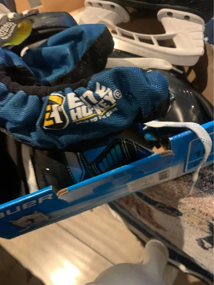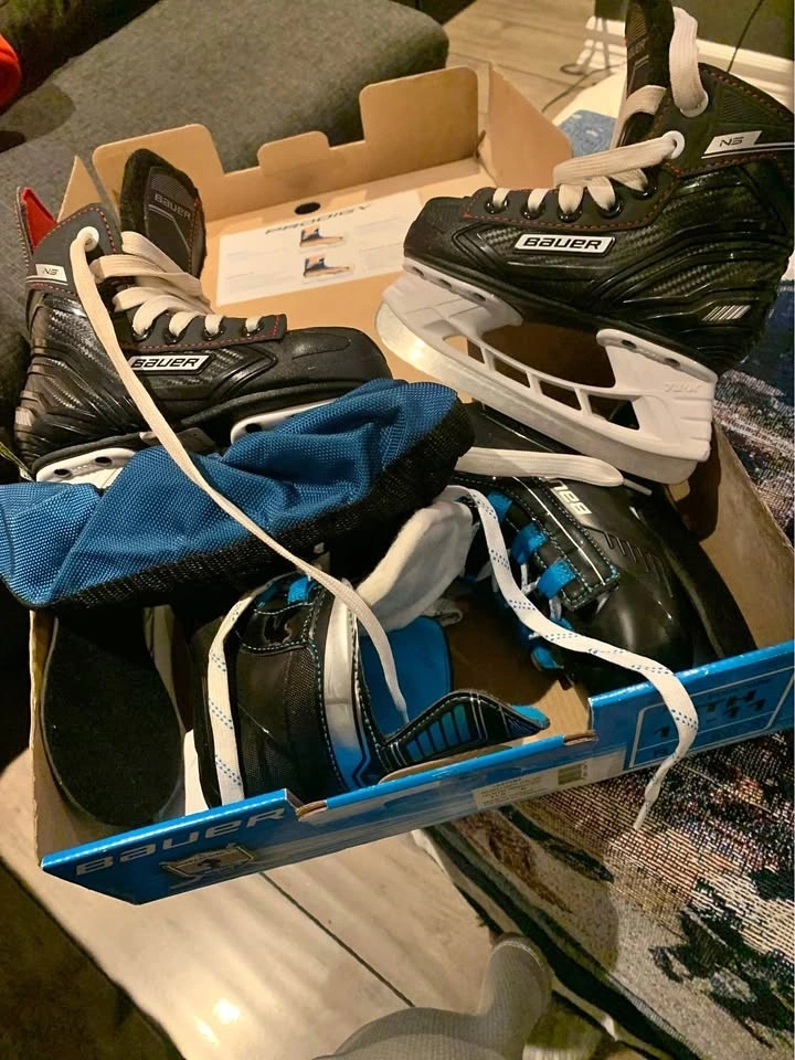 Selling 2 pairs of Bauer youth skates. One pair is size 9 youth, used for a few skating lessons. The other pair is brand new, still in the box, size 10-11 youth. Also includes a helmet, used for a couple of lessons. All items are in great condition with sharp blades. Comes with a pair of blade guards. $80 or best offer.