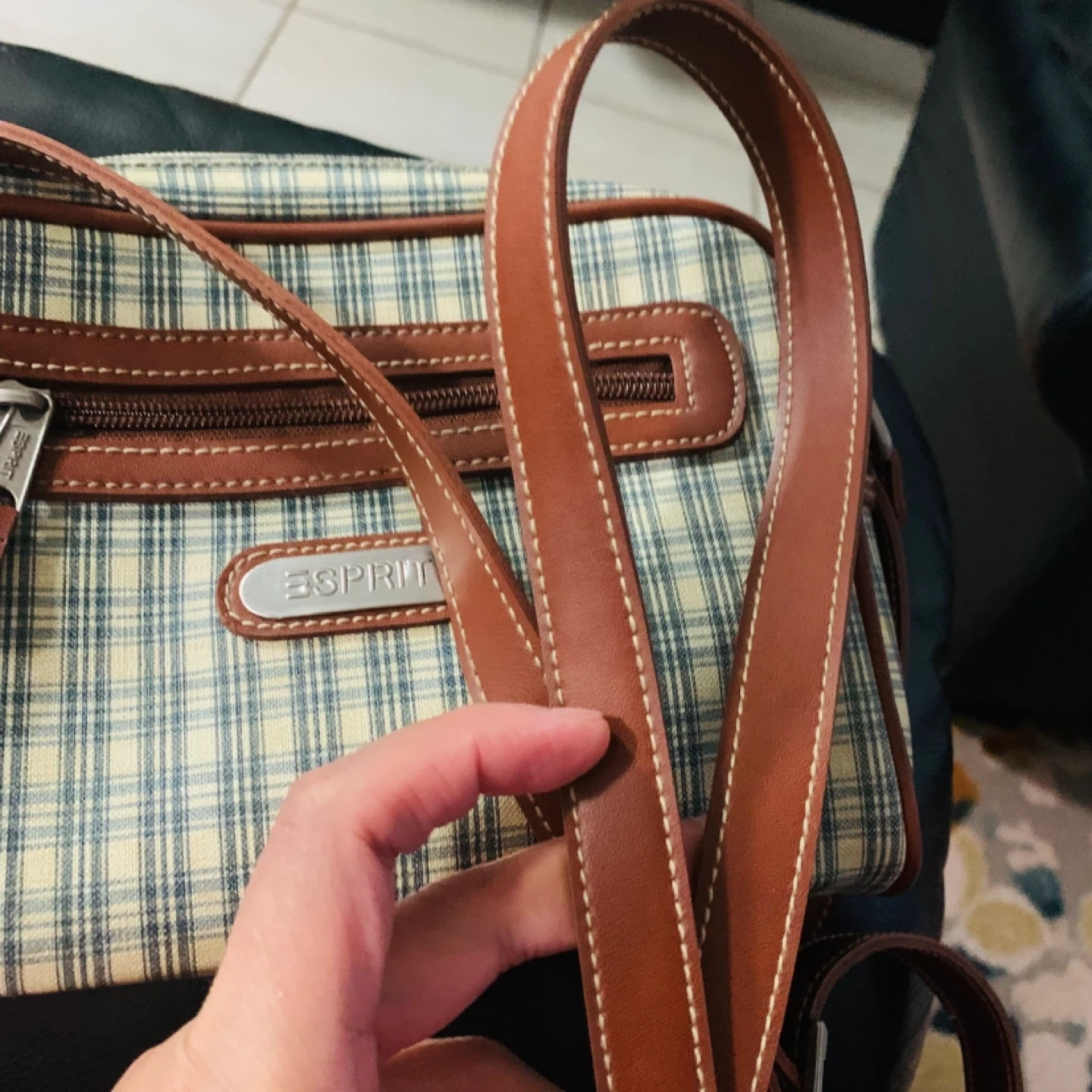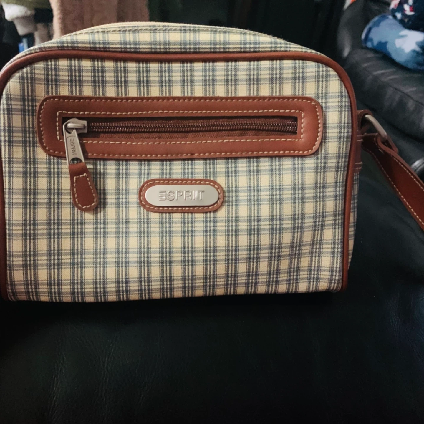 This Esprit crossbody bag features a classic plaid pattern with brown leather trim and adjustable strap. It has a zippered main compartment and a front zippered pocket. Perfect for everyday use!
