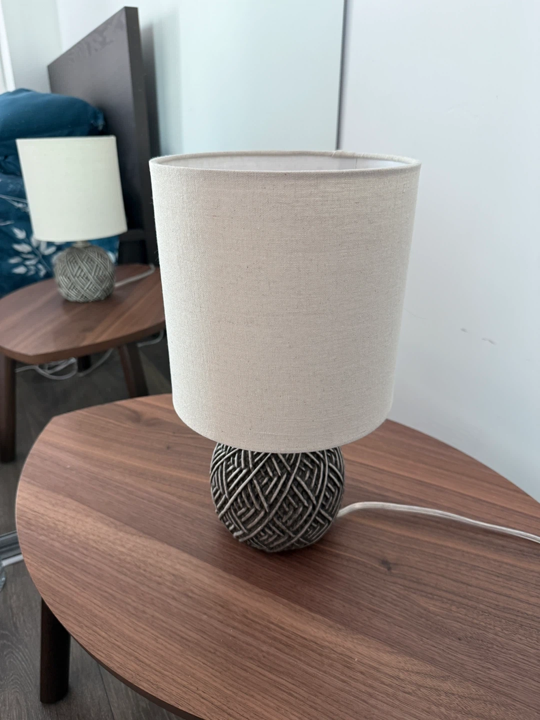 A stylish table lamp featuring a unique textured base resembling a ball of yarn. It's topped with a neutral-toned fabric shade, offering a warm and inviting glow. Perfect for adding a cozy accent to any room.