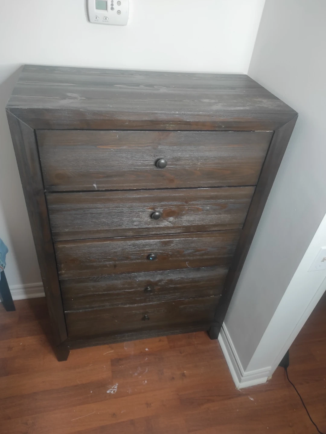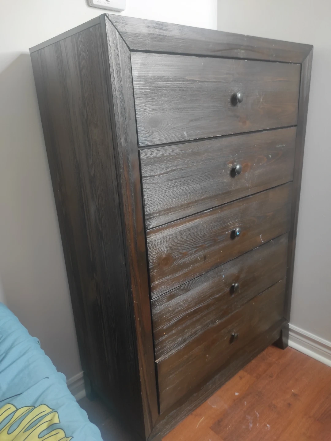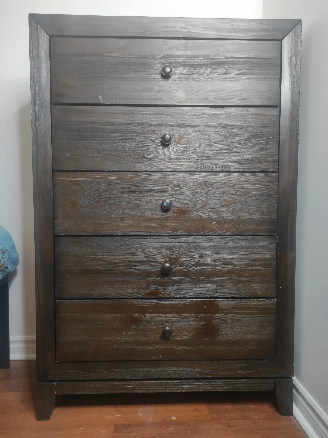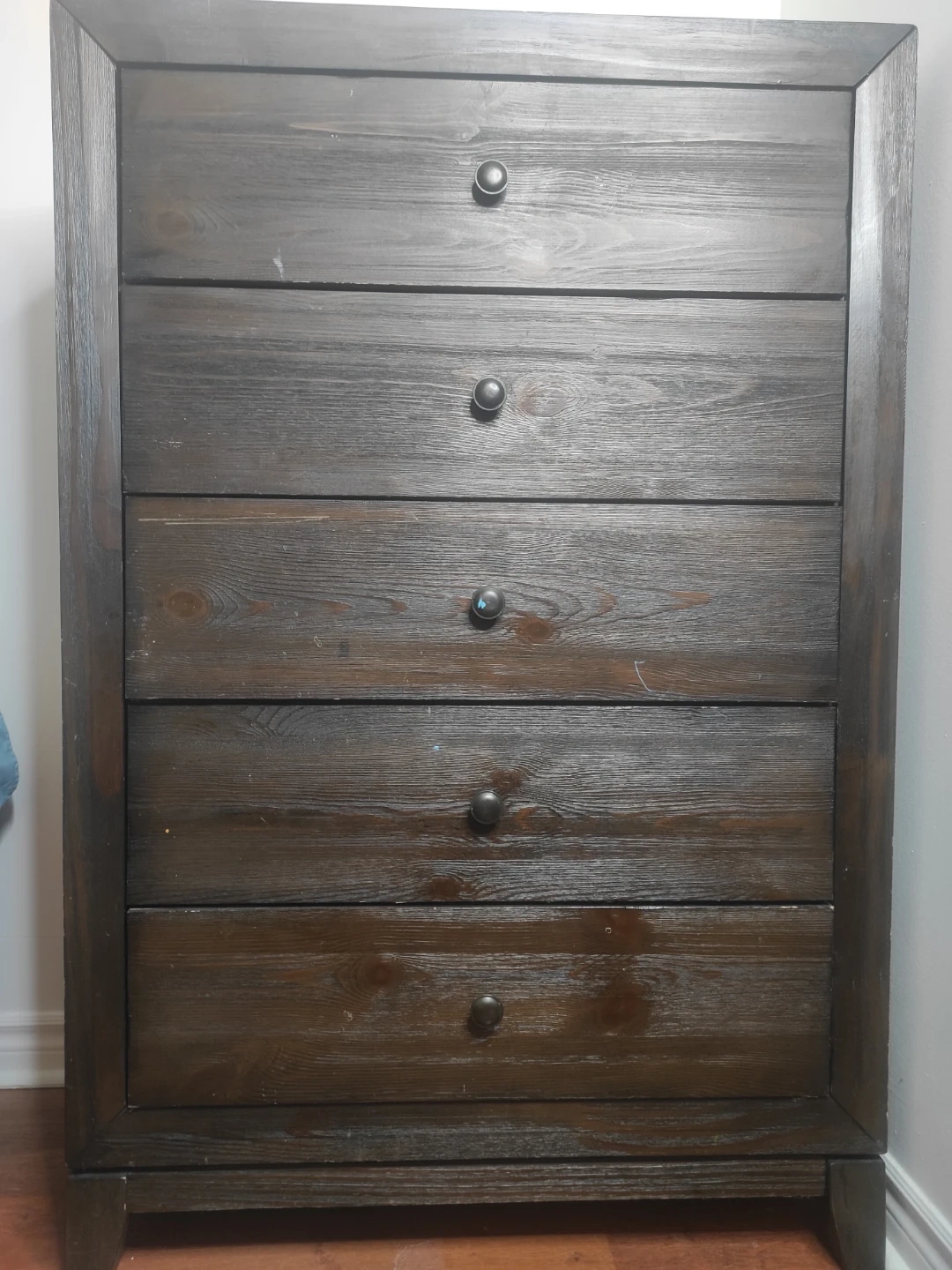 This dark wood dresser has five drawers for storage. It's a great piece for organizing your bedroom. The wood finish has a rustic charm.