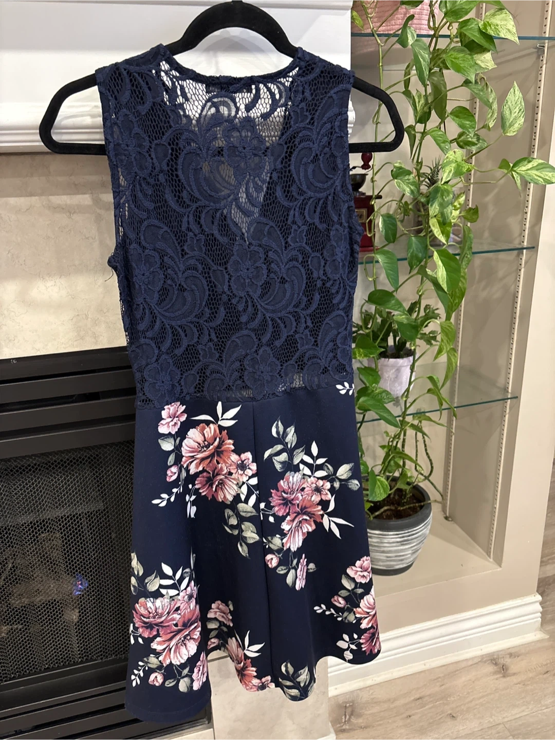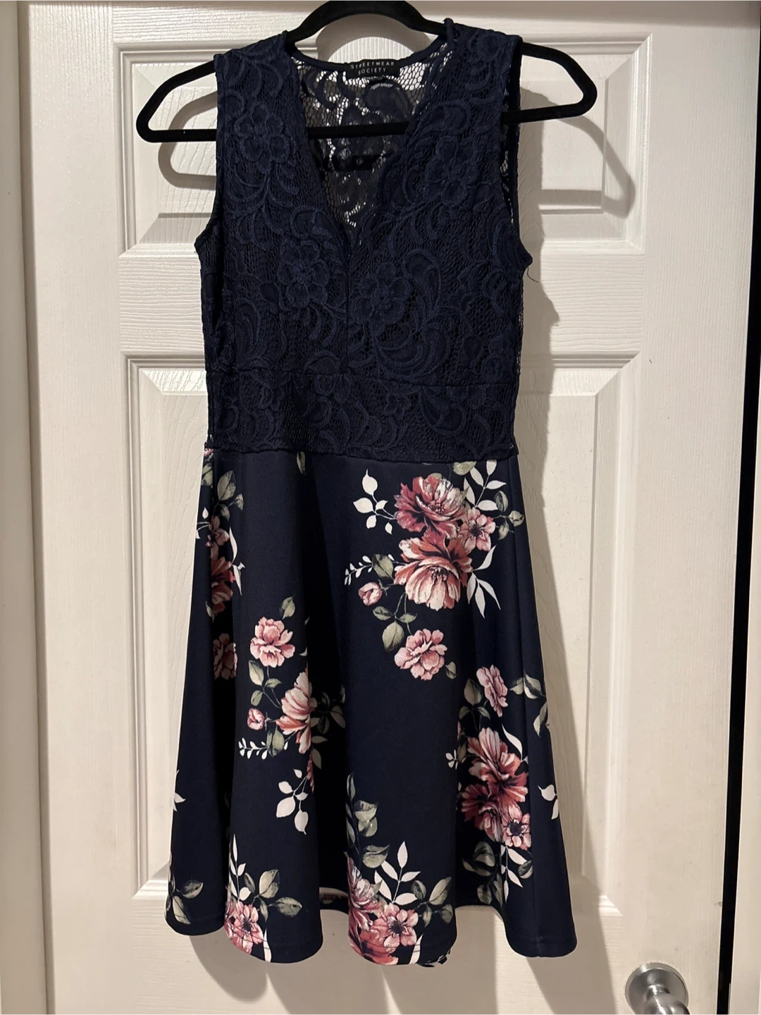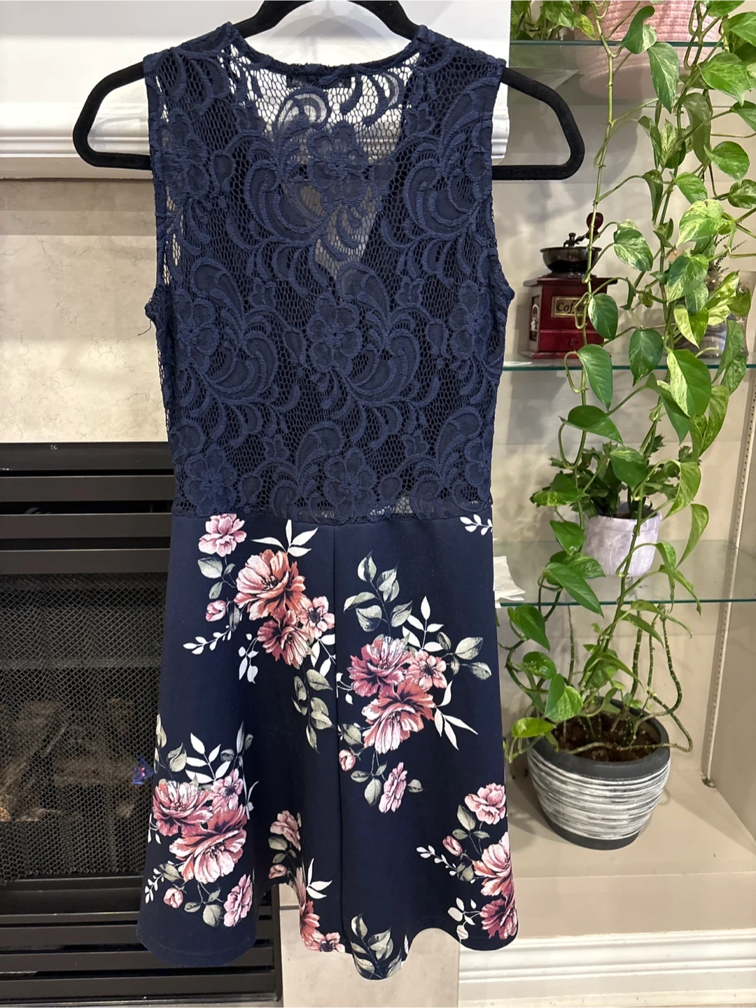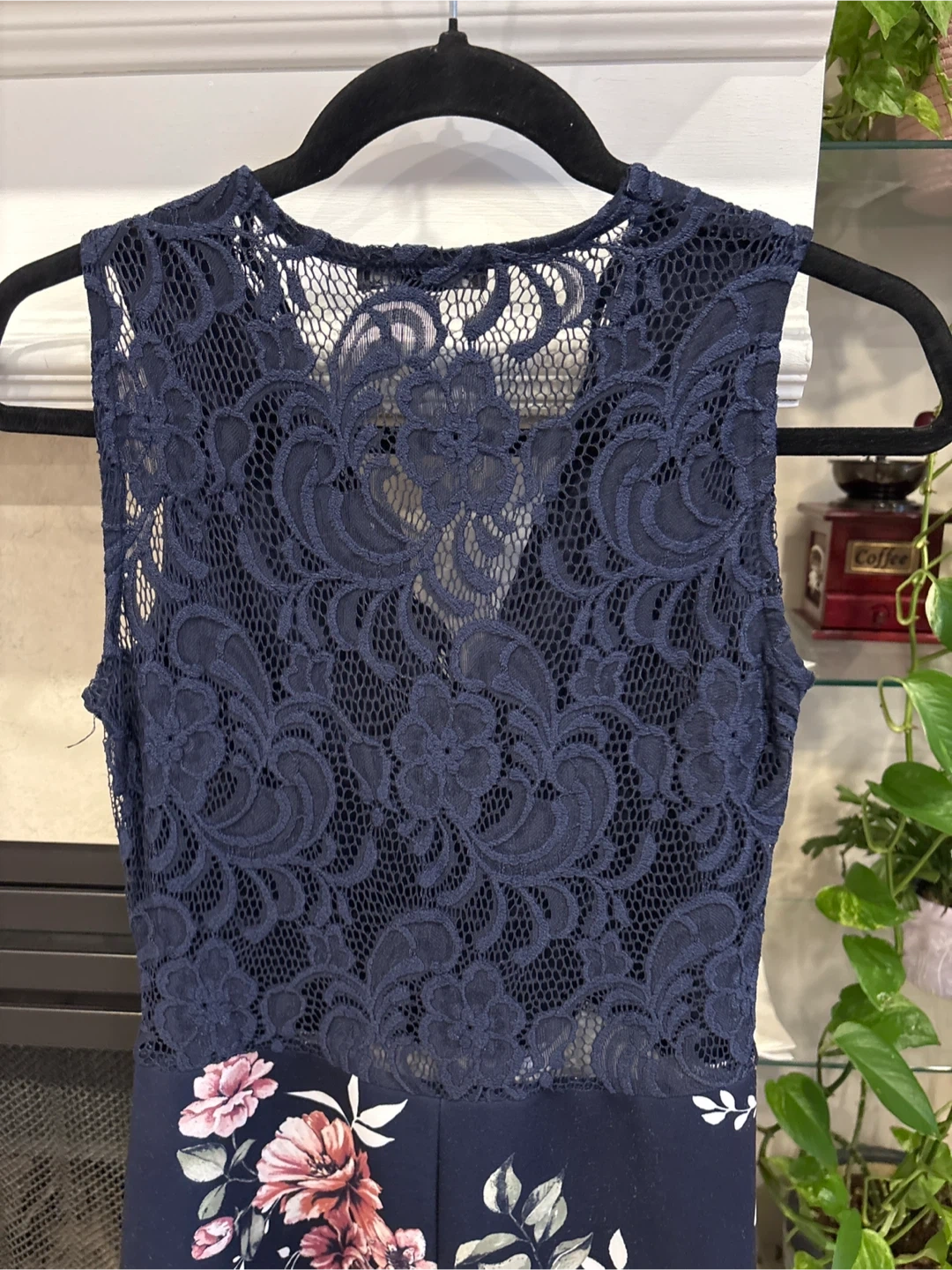 This navy dress features a beautiful lace top with a V-neckline. The skirt has a lovely floral print. It's a sleeveless design. Size S beautiful design for any occasion pick up walnut grove Langley
