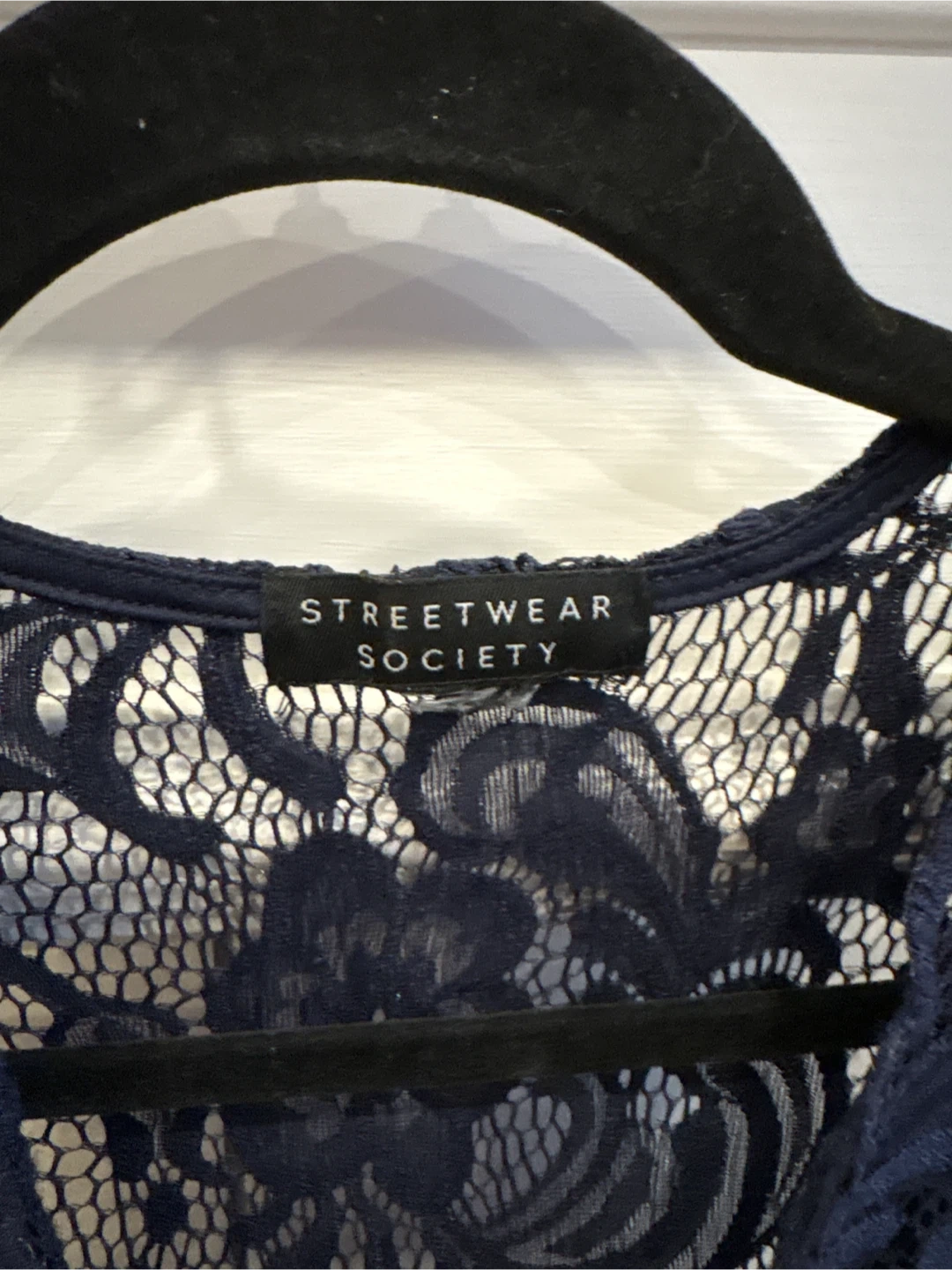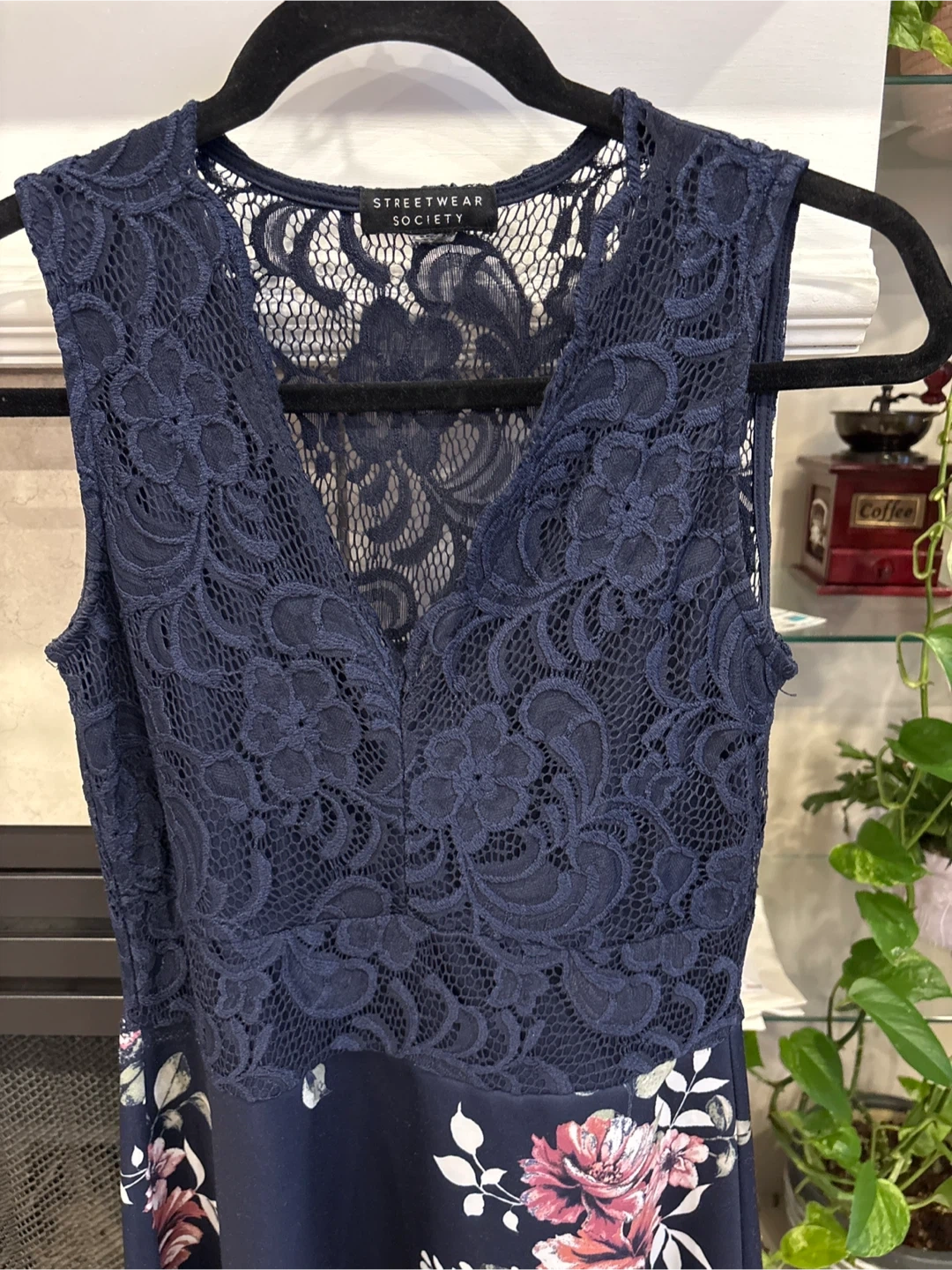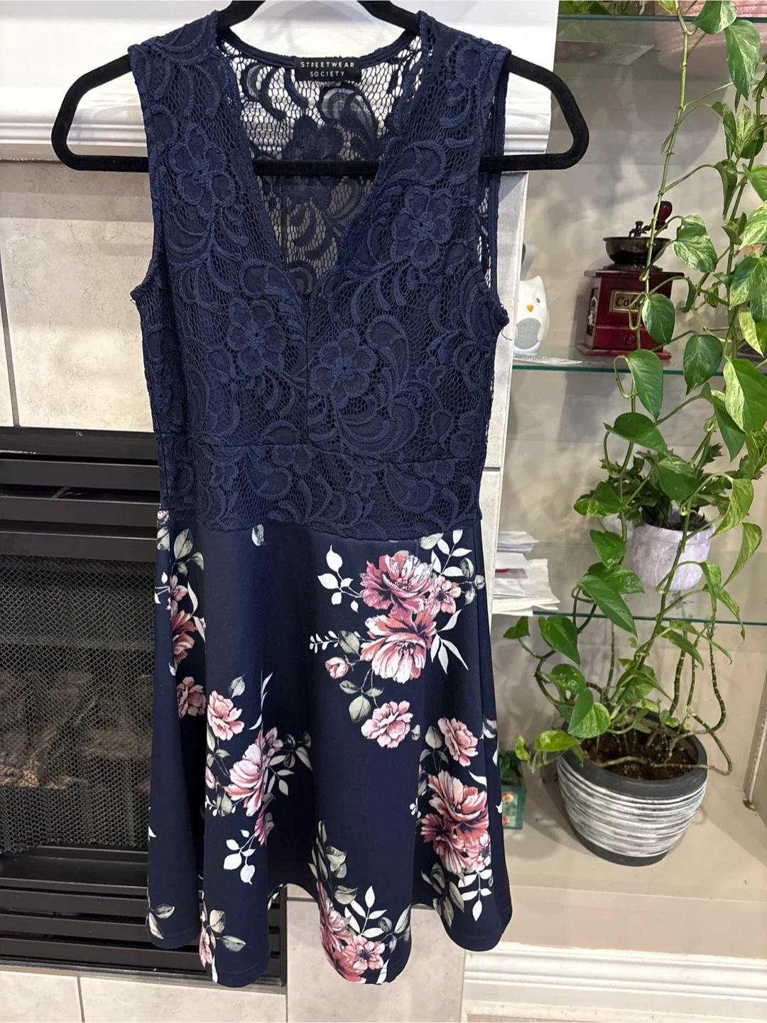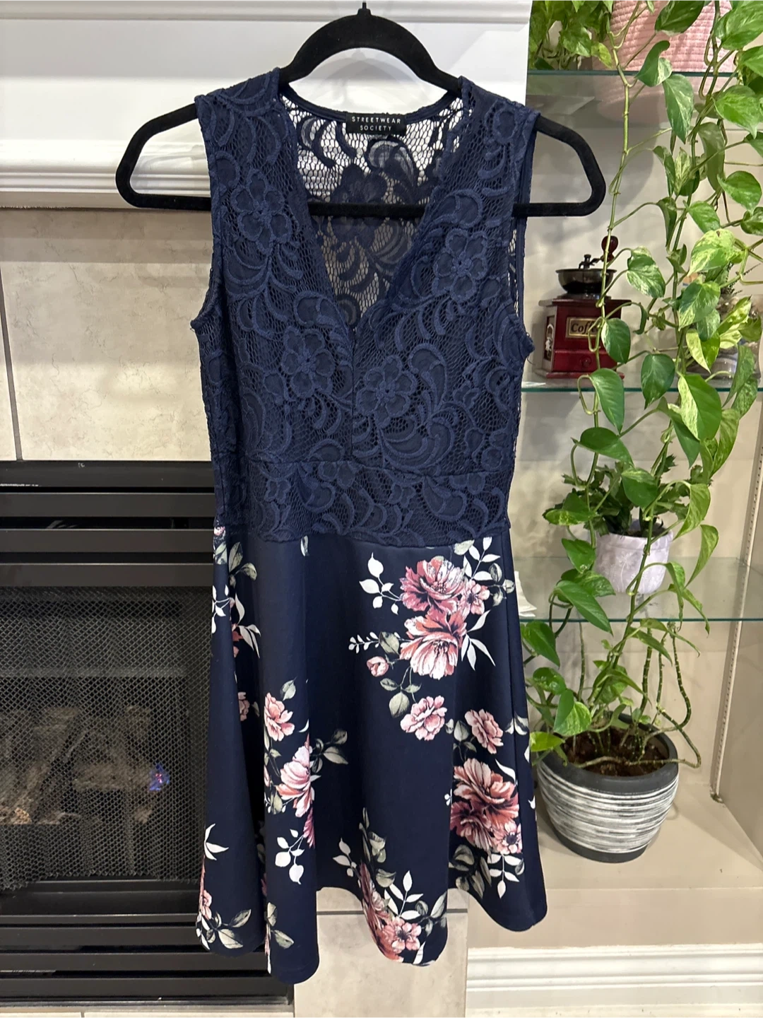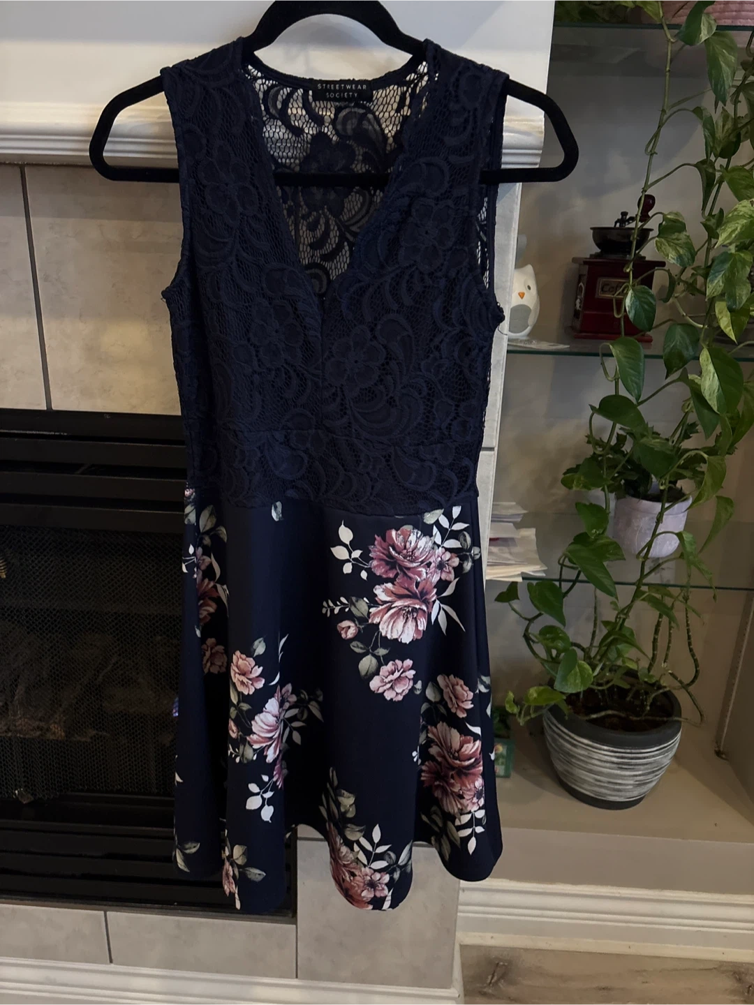 This navy dress features a beautiful lace top with a V-neckline. The skirt has a lovely floral print. It's a sleeveless design. Size S beautiful design for any occasion pick up walnut grove Langley