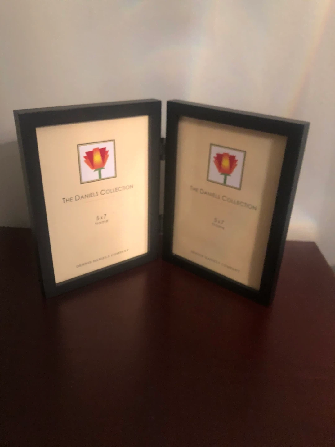 This is a black double photo frame from The Daniels Collection. It holds two 5x7 photos. Made by Dennis Daniels Company.