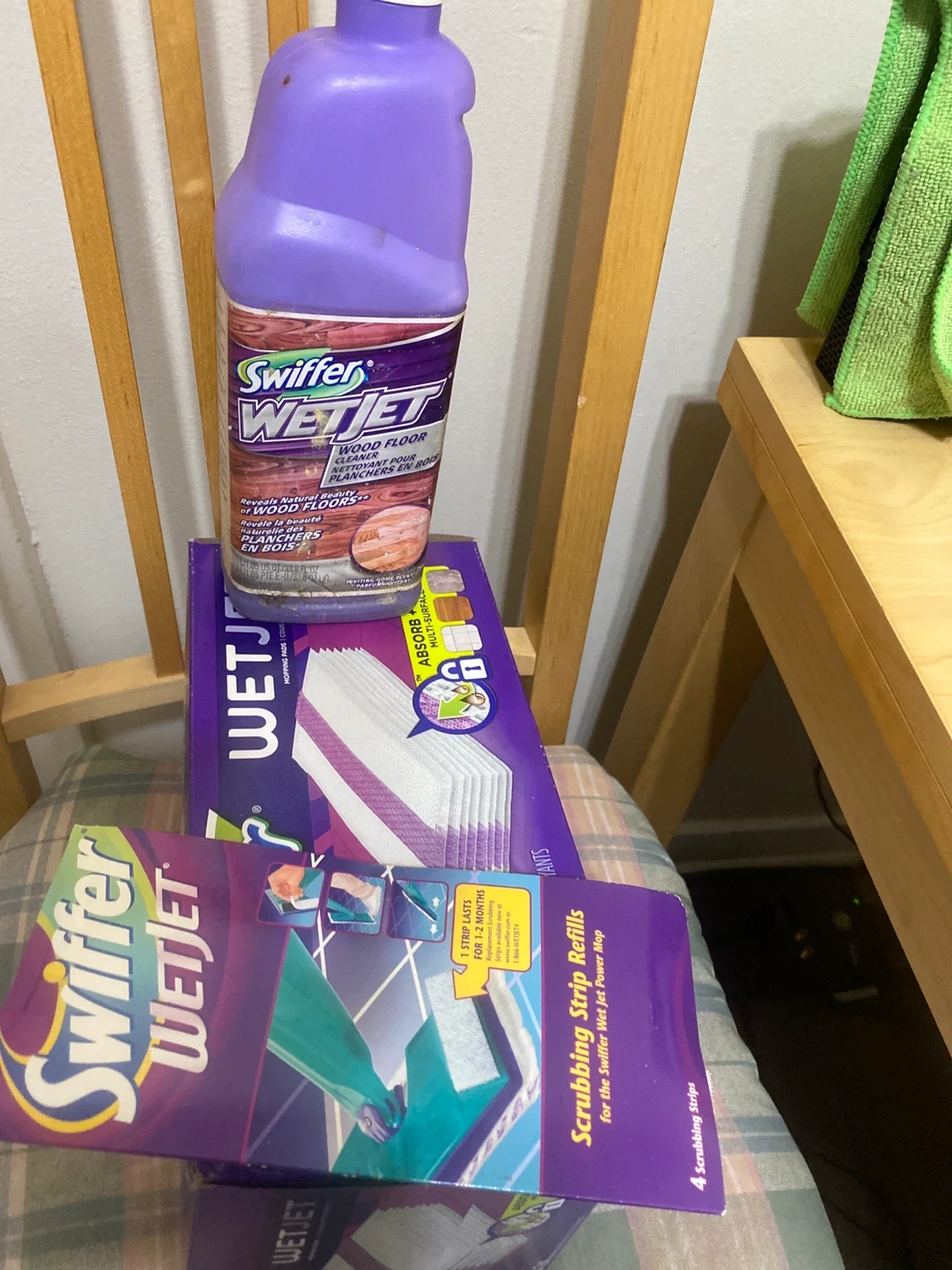 Each Set Includes 1 bottle of Swiffer WetJet Multi Surface Cleaner, 1 pack of spray, mop, refill and 1 pack of Swiffer WetJet Scrubbing Strip Refills. This cleaning solution is designed for finished wood floors. It's a spray mop refill system. (Total price compare $34)
