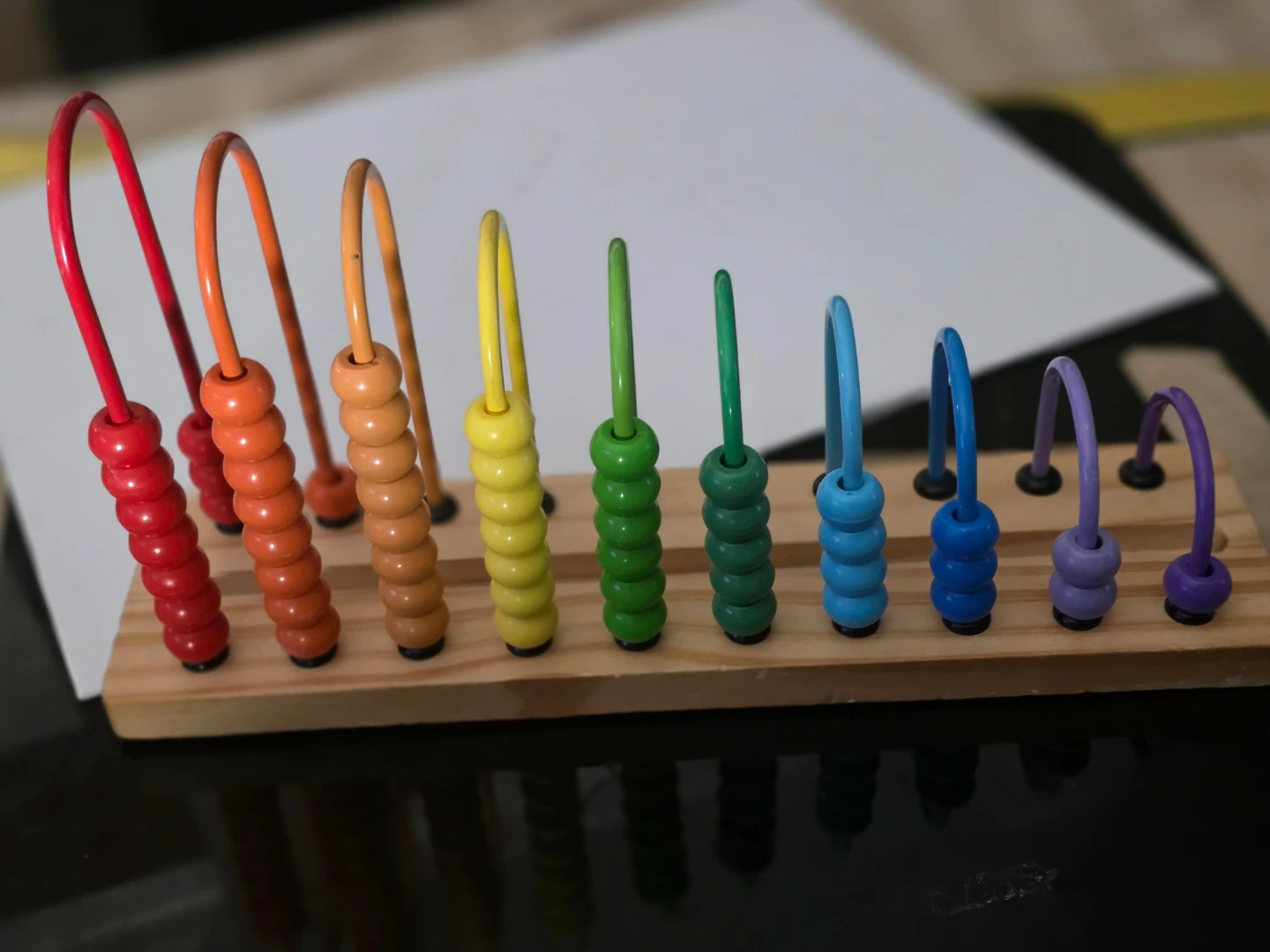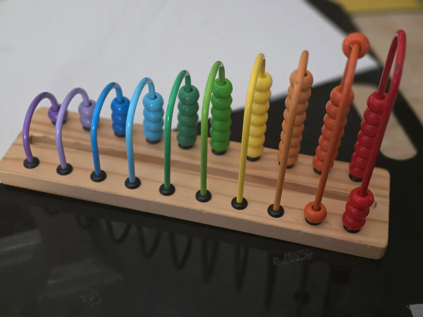 It is a classic wooden educational counting toy with 55 colorful beads.