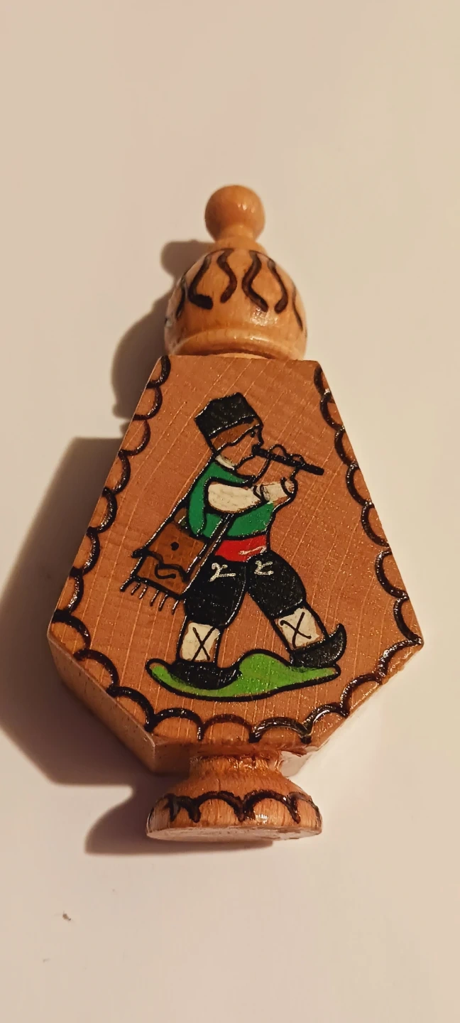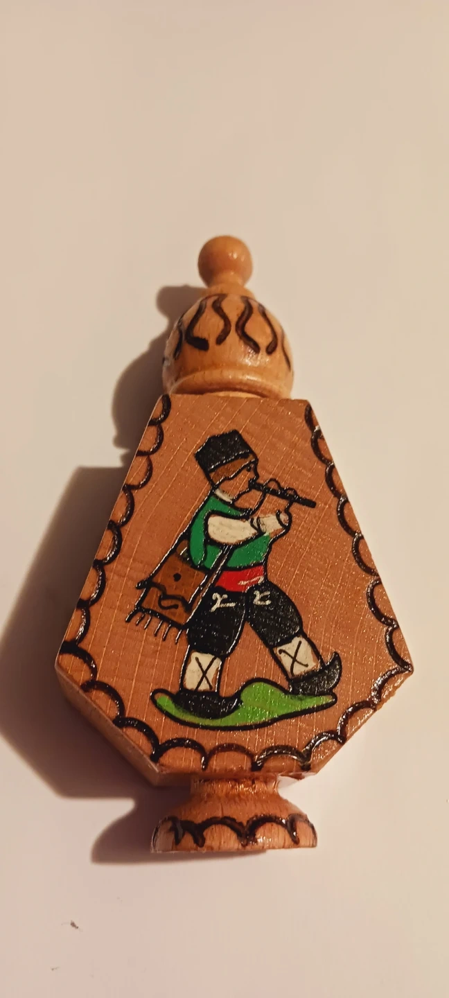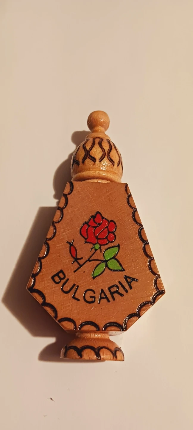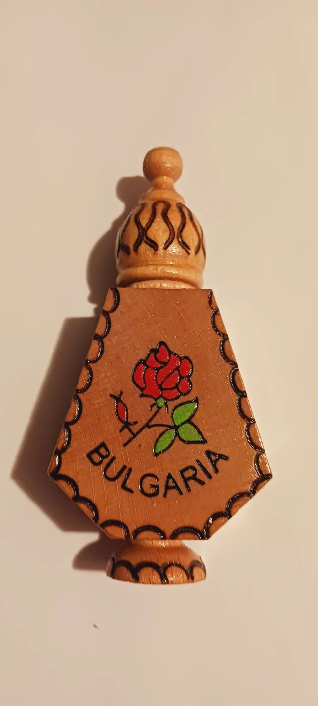 Bulgaria 🇧🇬 Miniature Handpainted Wooden Bottle featuring traditional Bulgarian folk art. One side shows a red rose with the word "BULGARIA", and the other depicts a man playing a flute. It's a charming piece, perfect for display. Made in Bulgaria 🇧🇬.4"×2"×1". Excellent condition.