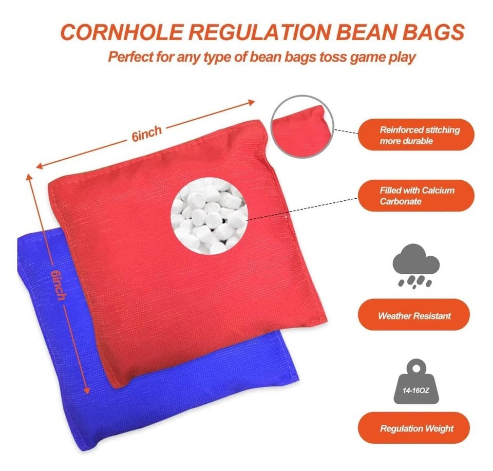 Used like new. This classic Cornhole game set includes 2 foldable 3’x 2’ portable cornhole boards and 8 all-weather bean bags. The boards are made of premium MDF wood with a stripe design and feature foldable feet secured by galvanized bolts for portability. They also have a support bar to prevent bouncing. The innovative design allows the boards to fold, stack, and store in the included durable carry bag. The set includes 8 bean bags (4 red, 4 blue) that are standard 6 x 6 inches. Great for family gatherings, picnics, parties, and outdoor play.