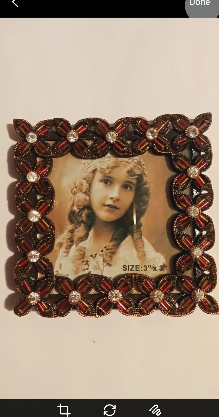 This decorative photo frame features a vintage-inspired design with intricate red and gold beadwork and sparkling rhinestones. It's designed to hold a 3"x3" photo. A lovely way to display a cherished memory!!! 4"×4". Excellent condition. ALL MY PRICES ARE NEGOTIABLE!