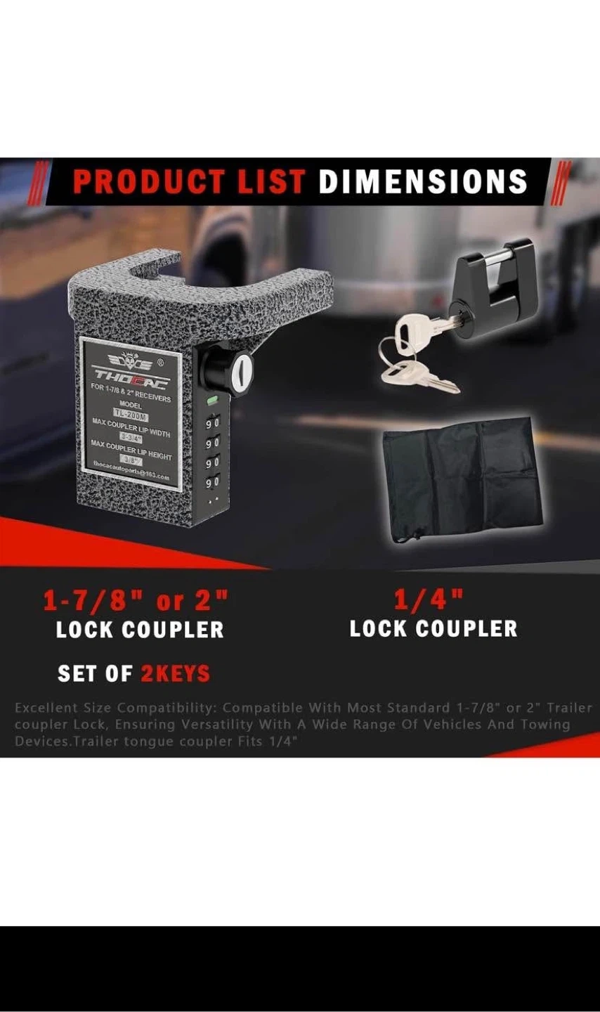 This trailer hitch coupler lock kit is designed for 1-7/8" and 2" receivers. It features a robust lock design that thwarts tampering and discourages theft. The lock is constructed from high-density plating and aluminum for excellent quality and outstanding load-bearing capacity.