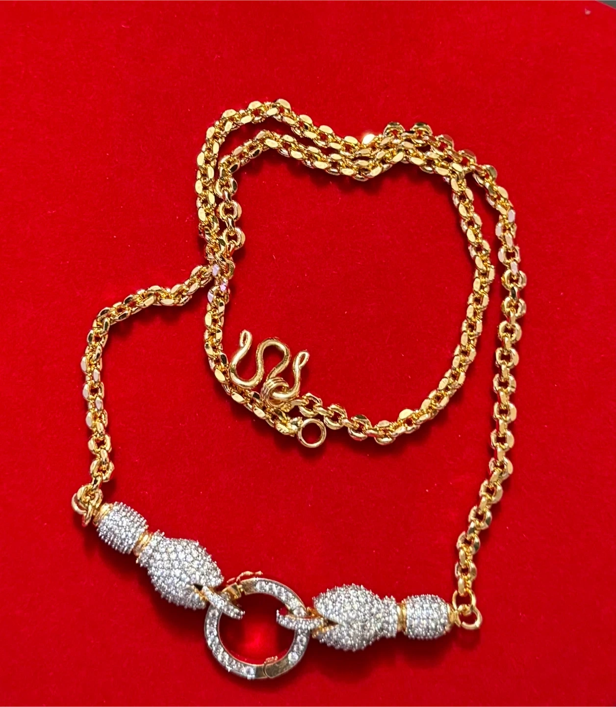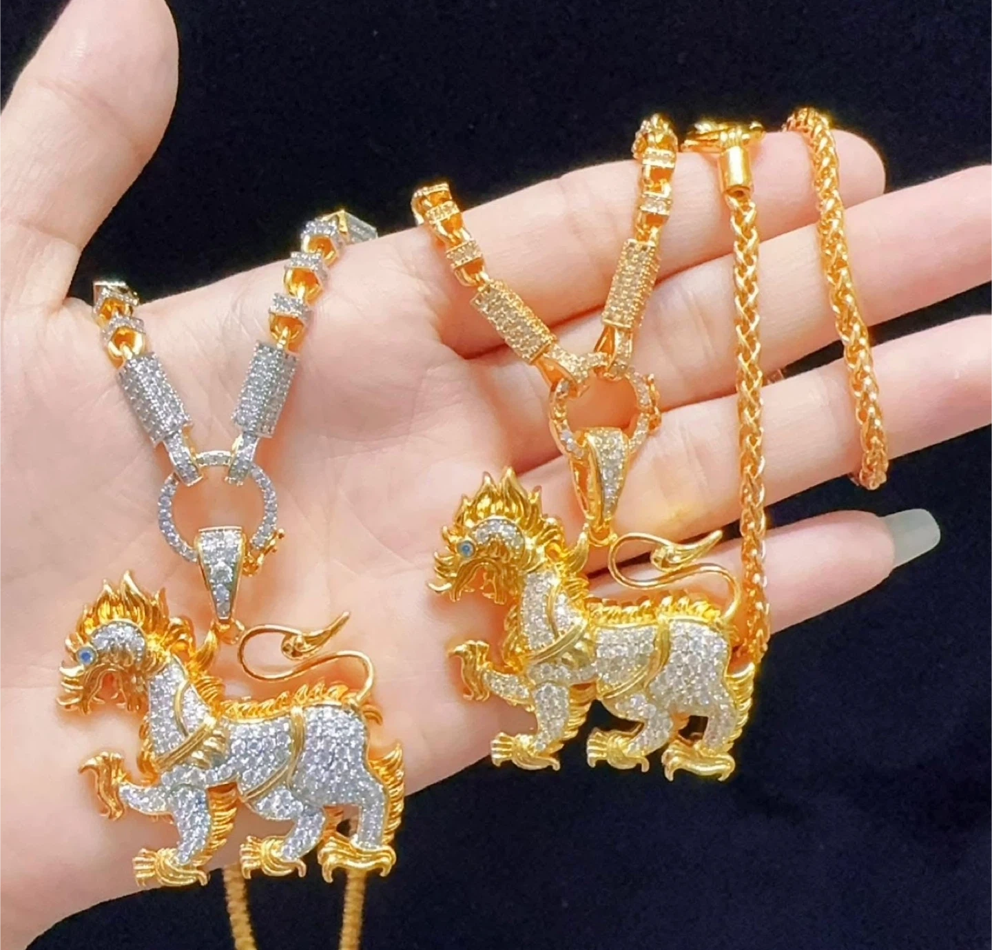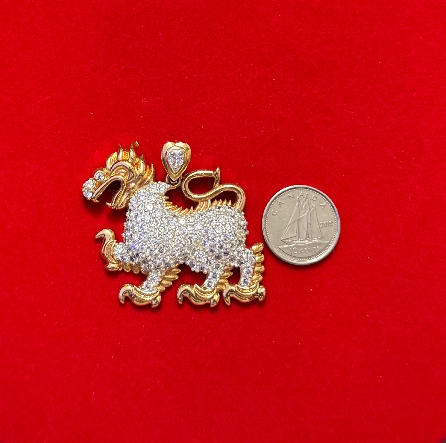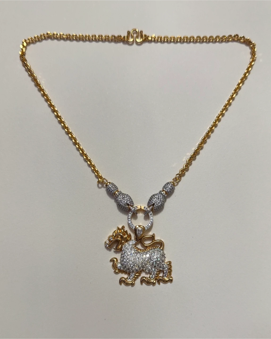 Real platinum gold necklace featuring a pendant adorned with Japanese diamonds in the shape of a lion. The chain and clasp are gold, with additional diamond accents on the chain near the pendant. It weighs 26 grams total, with the pendant weighing 13 grams. This piece is sure to add sparkle to any outfit!
