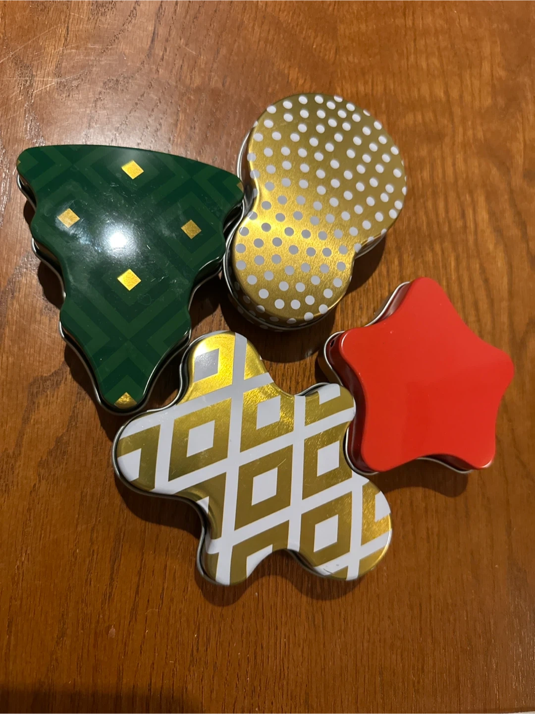 You'll get assorted holiday-themed metal box perfect for storing treats or small gifts. These tins are made of metal and feature fun shapes like stars, trees, and gingerbread men. They're great for organizing small items or giving homemade goodies!