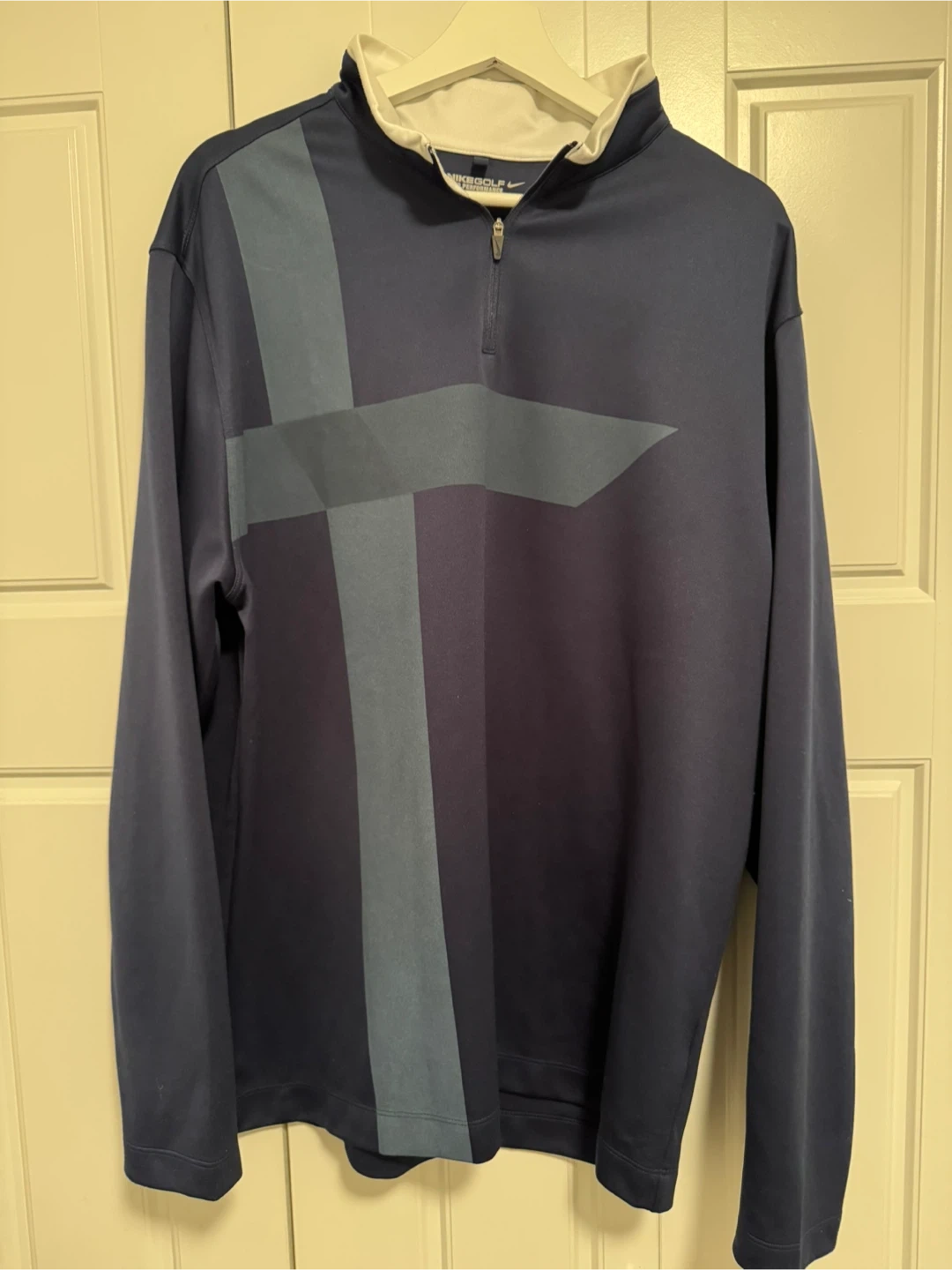 A navy blue Nike Golf long-sleeve pullover with a quarter-zip. It features a graphic design on the front in contrasting shades of blue. This shirt is perfect for the golf course or casual wear.