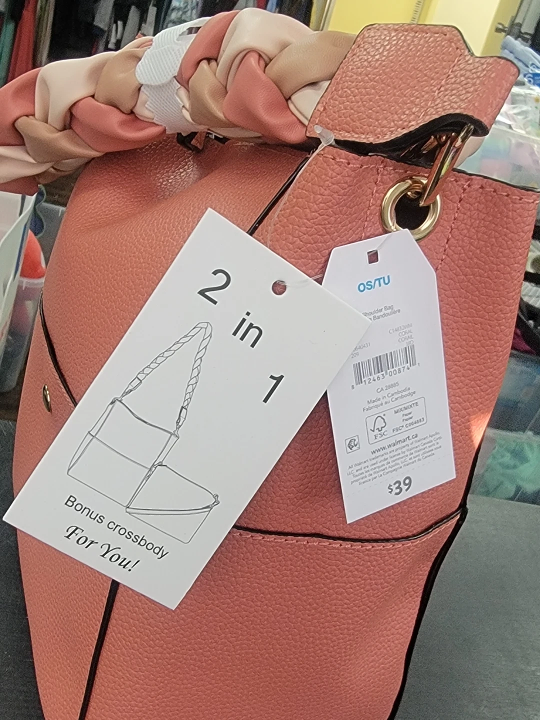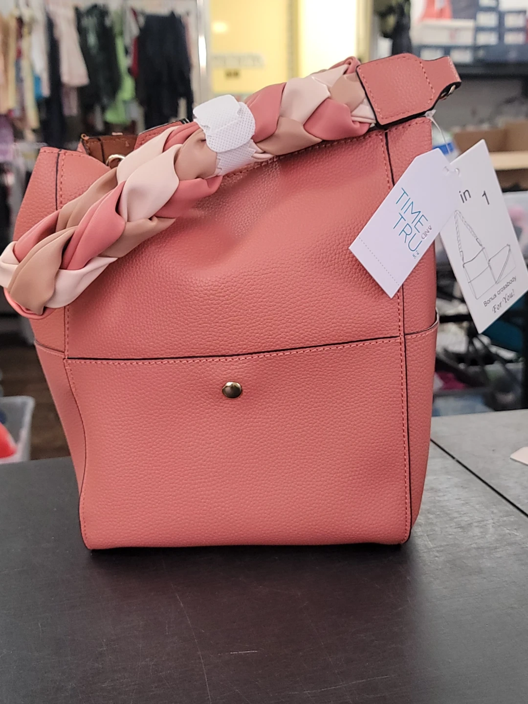 This Time and Tru bag is a versatile 2-in-1 shoulder bag with a bonus crossbody. It features a pink pebbled faux leather exterior with braided strap detail. This bag offers great storage options!