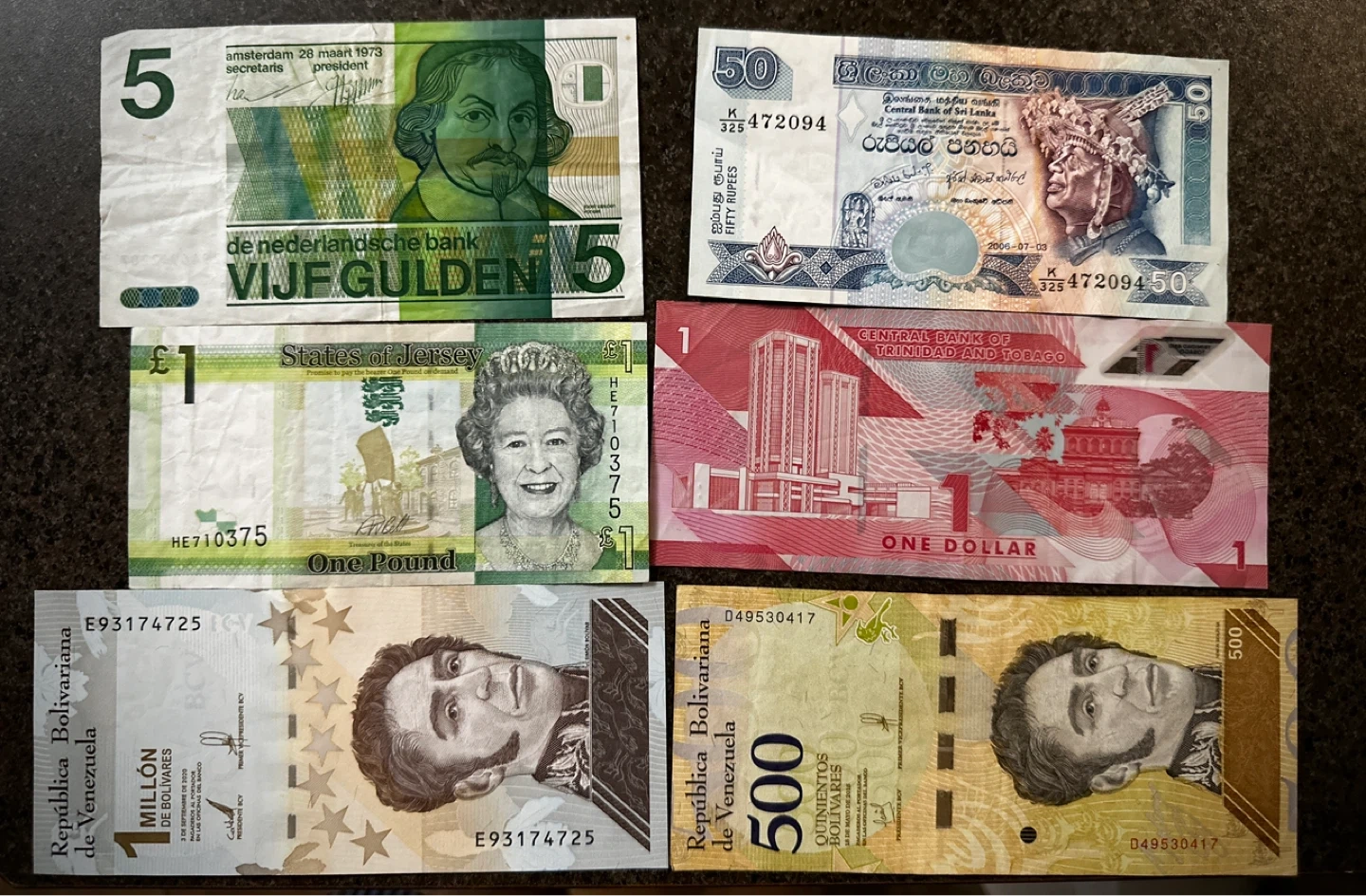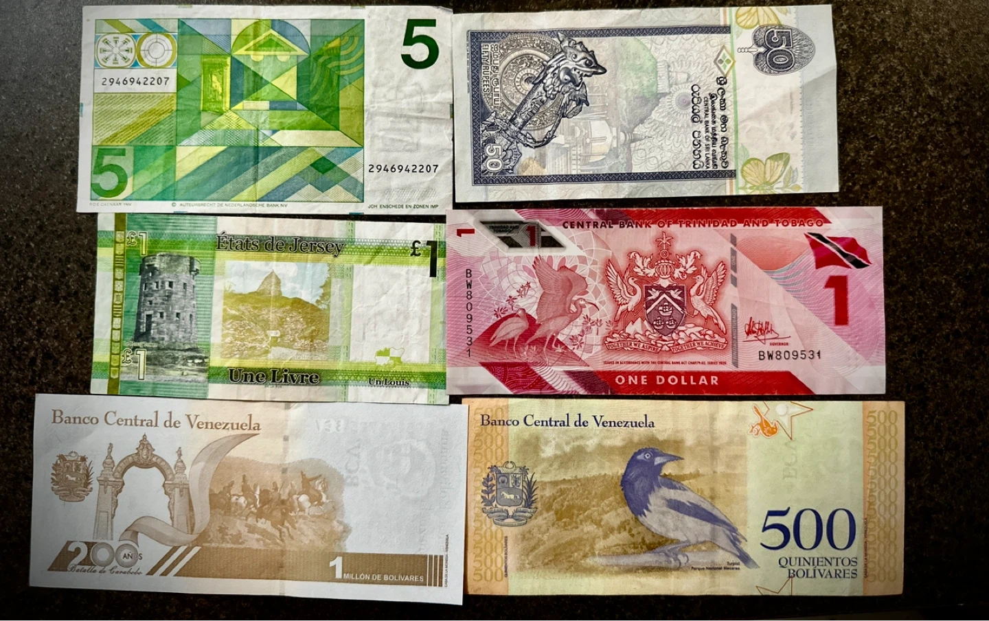 Bundle of assorted international paper currency. Includes notes from the Netherlands (5 Gulden), Sri Lanka (50 Rupees), Jersey (£1 Pound), Trinidad & Tobago ($1 Dollar), and Venezuela (1 Million & 500 Bolivares). Perfect for collectors or for educational purposes!